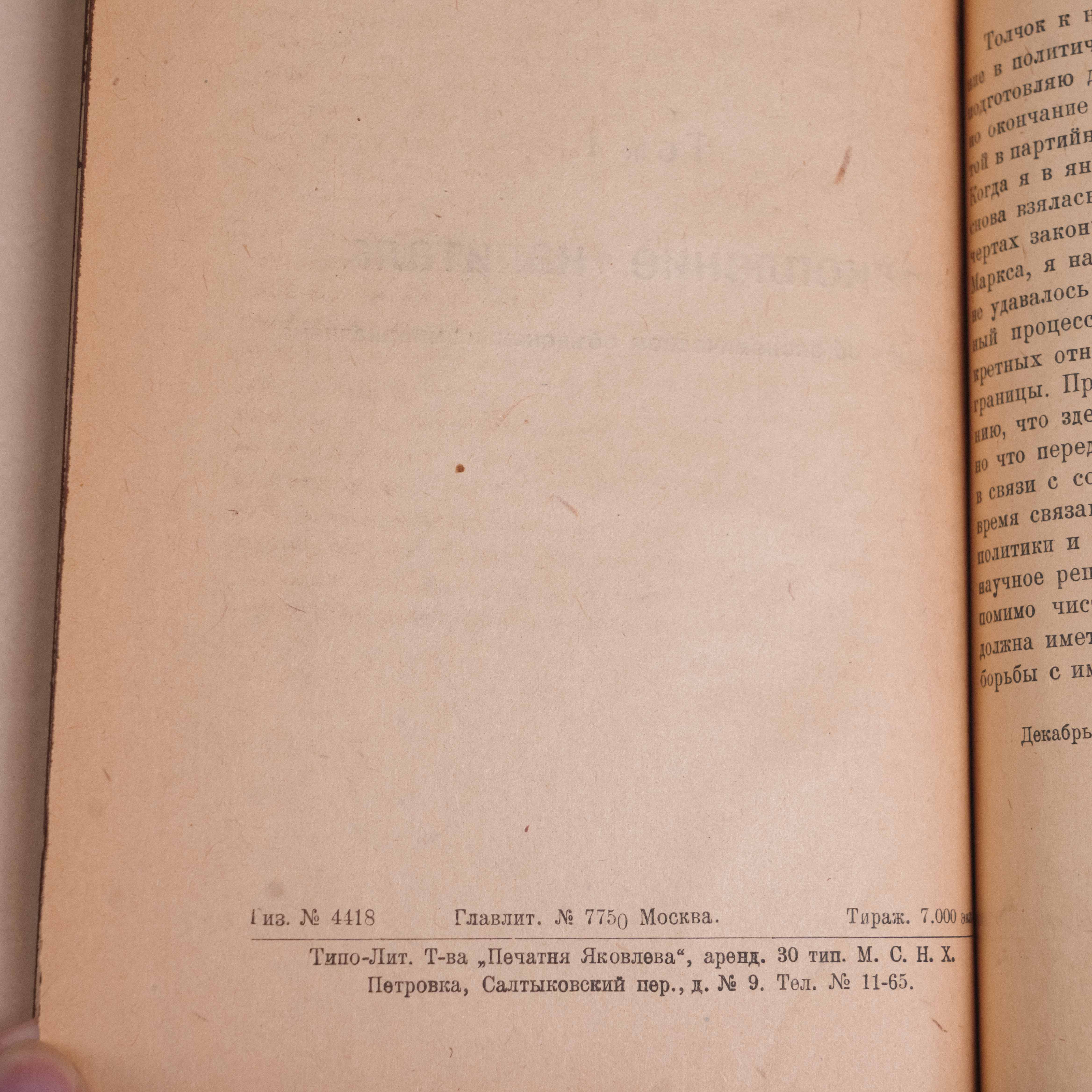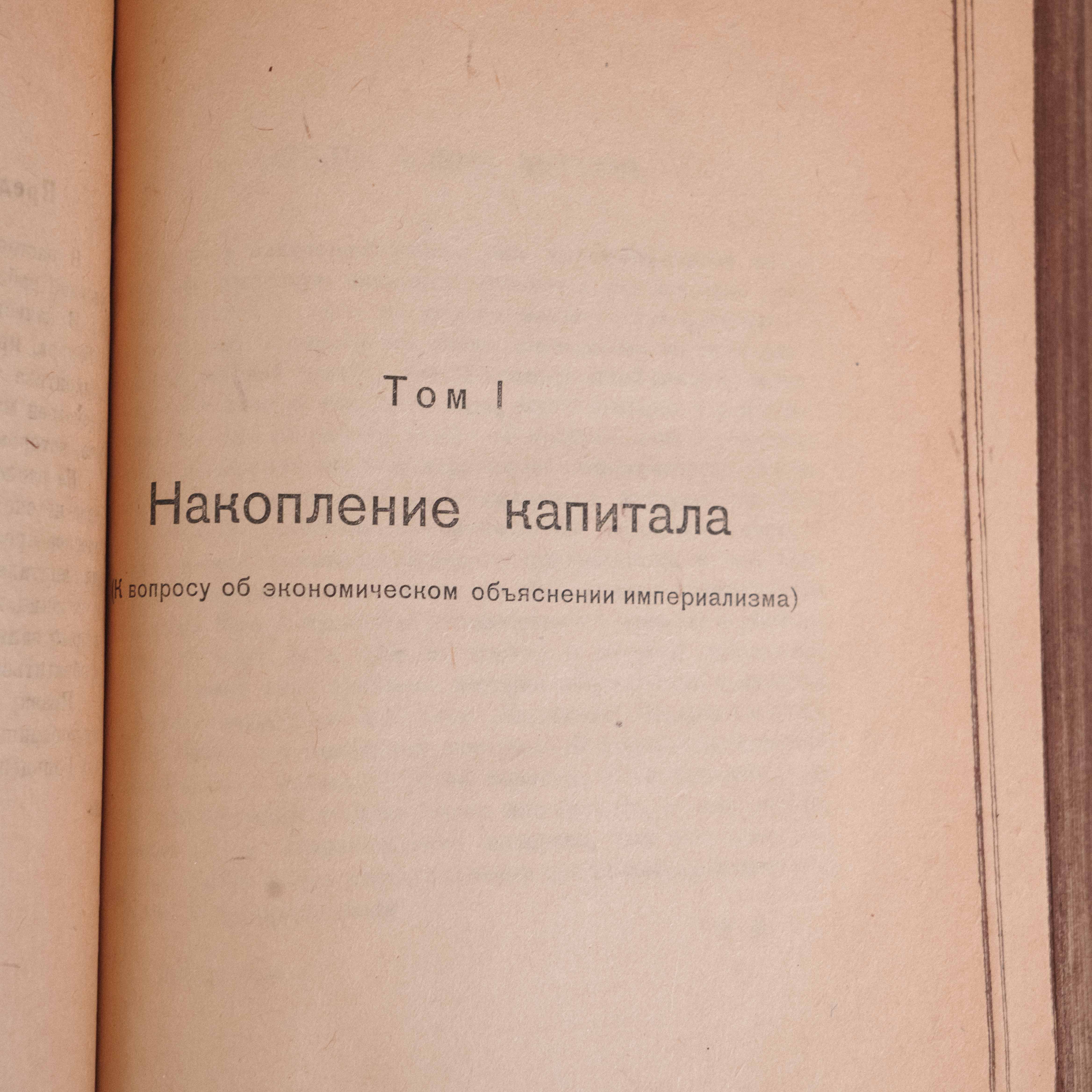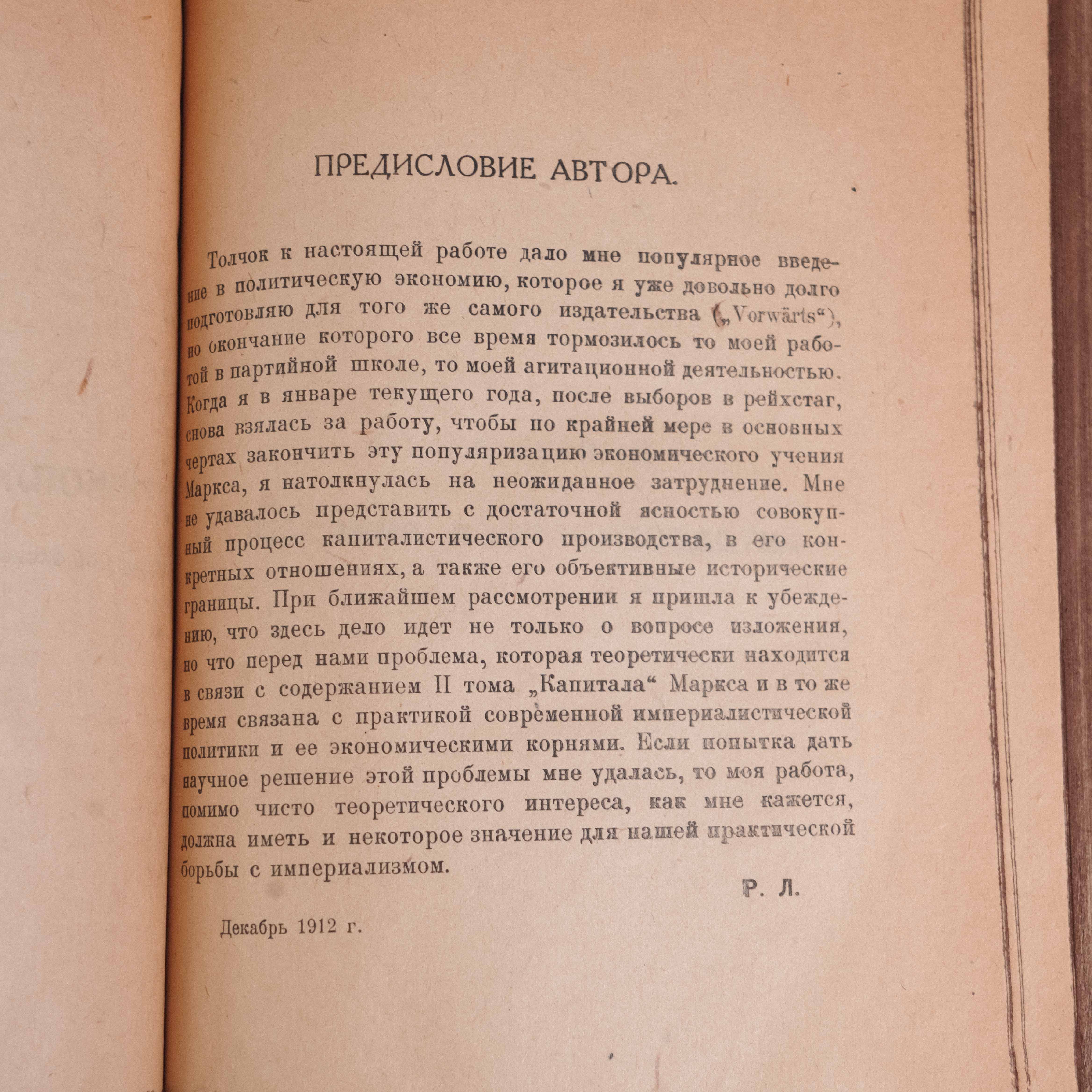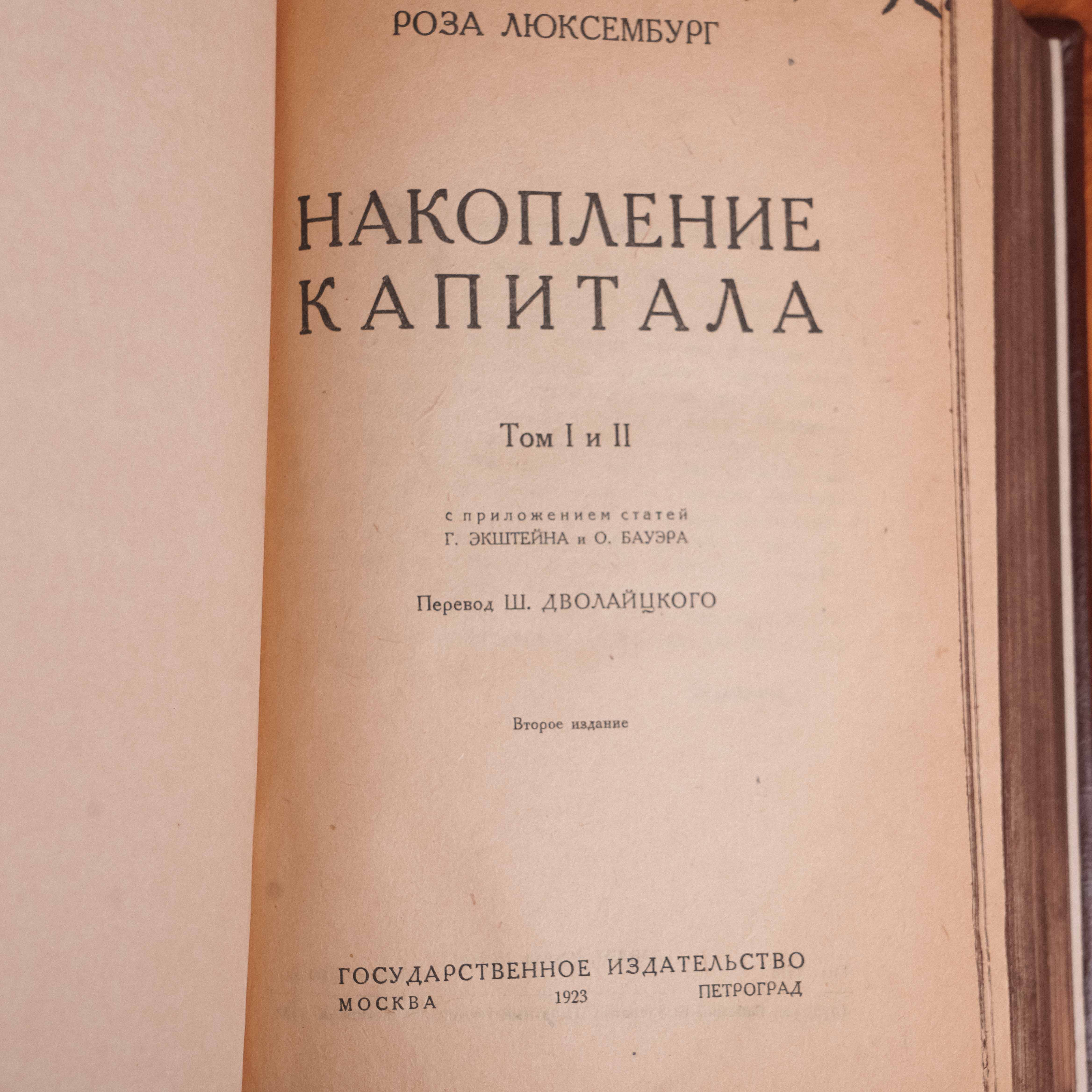 Происхождение Автор - Роза Люксембург. Перевод на русский - Ш. Дволайцкого. Книга состоит из 2х томов. Москва - Петроград. 1923 год. Тираж 7 000экз.