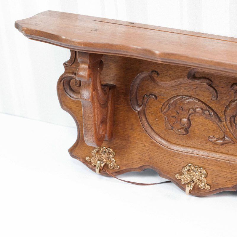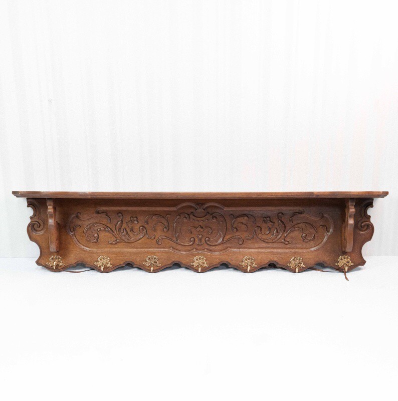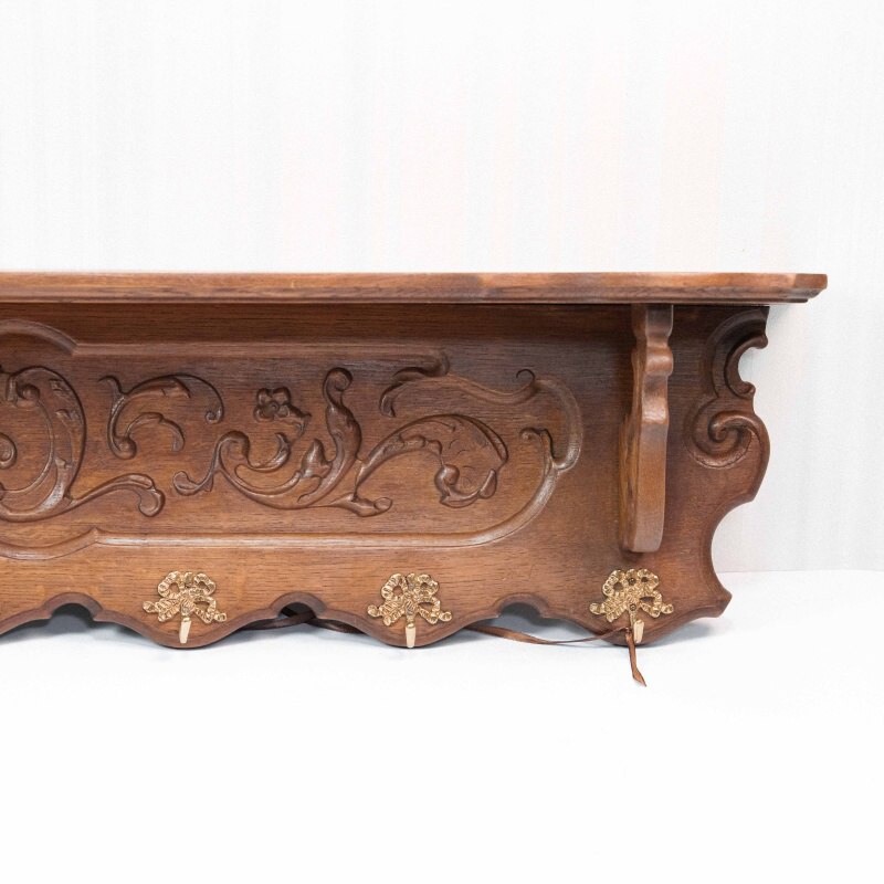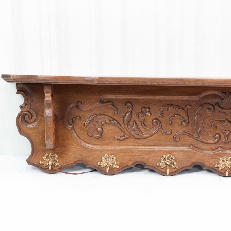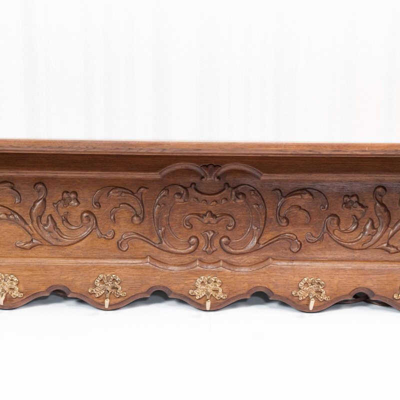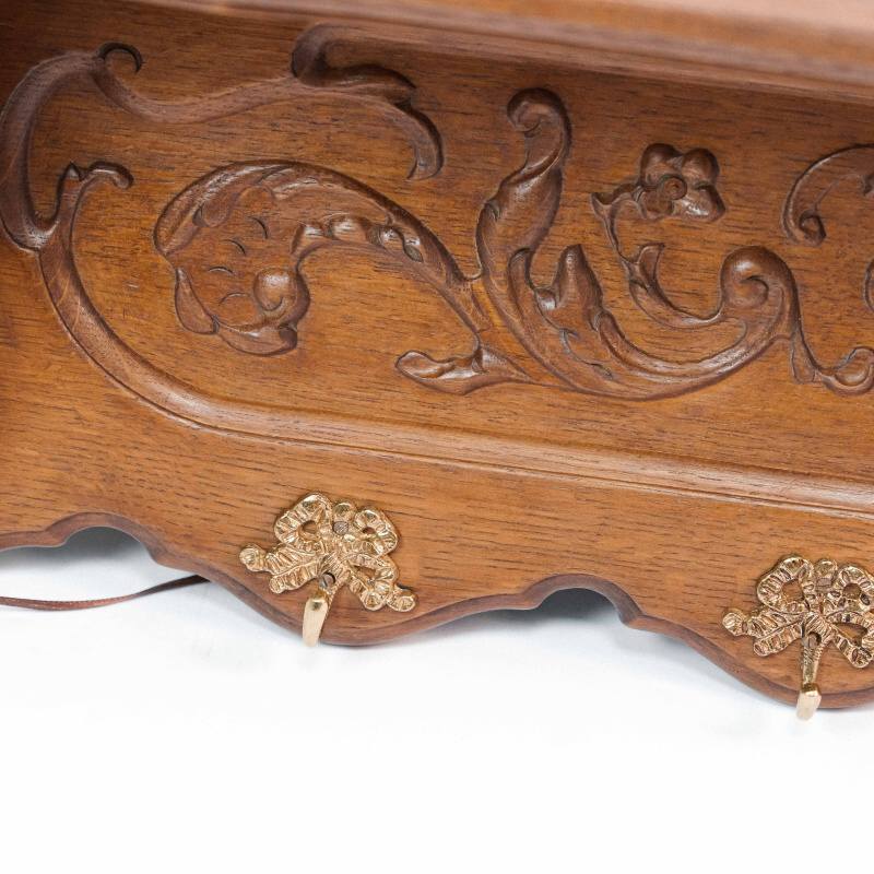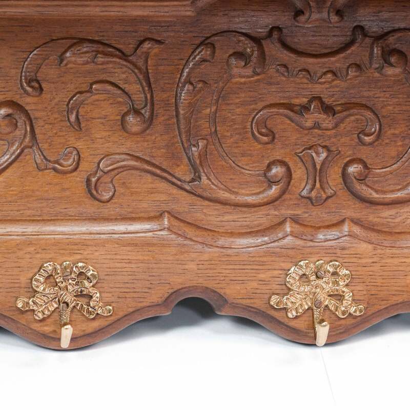 Изящная настенная вешалка из натурального дерева, выполненная в классическом европейском стиле. Фасад украшен богатой ручной резьбой с растительным орнаментом, придающей изделию глубину, утонченность и ощущение антикварного предмета.
