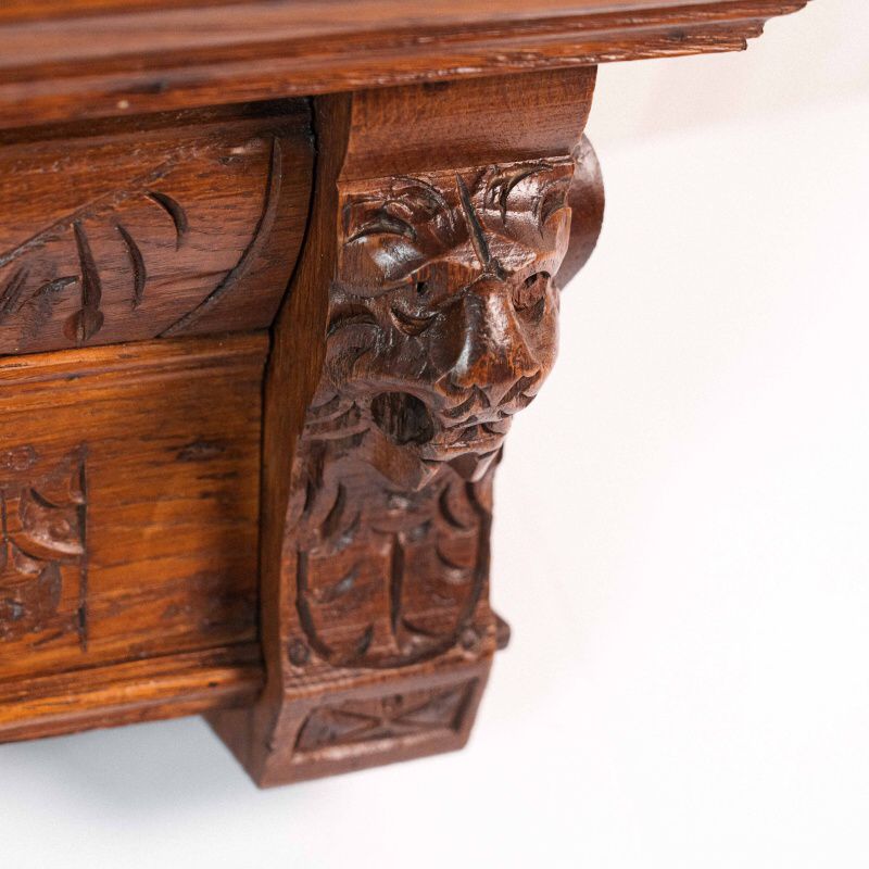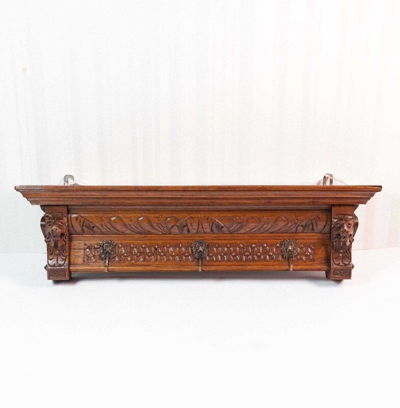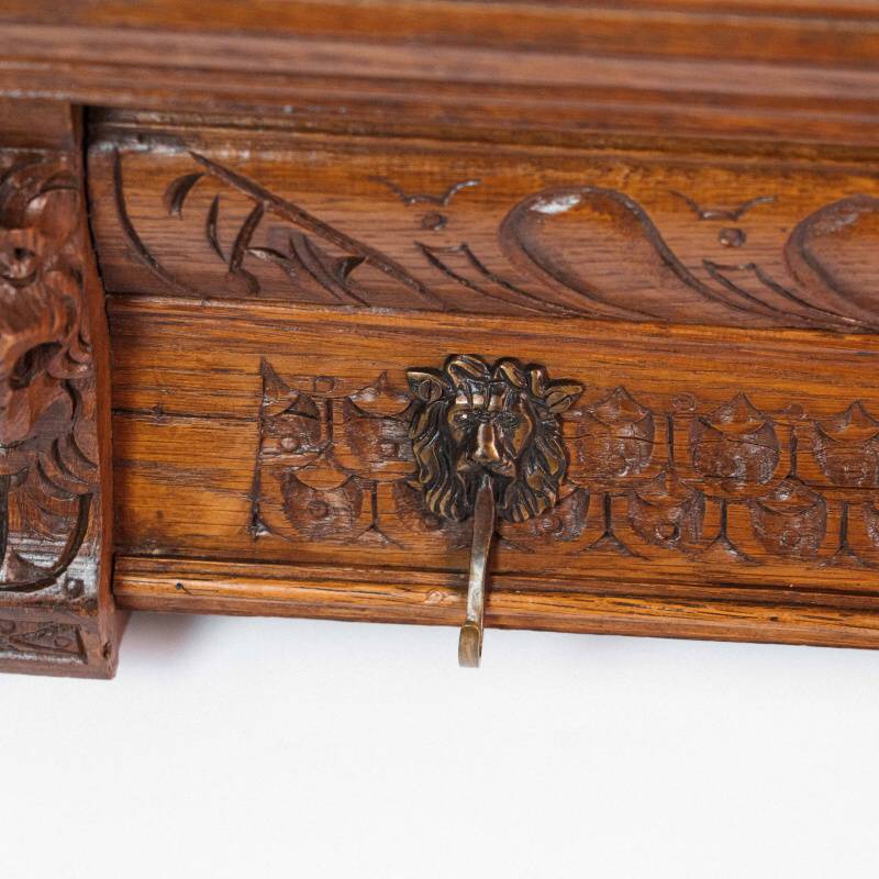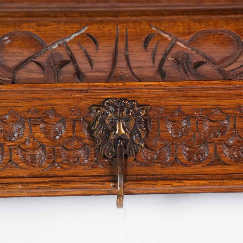 Статусная настенная вешалка из натурального дерева, выполненная в классическом европейском стиле с богатой художественной резьбой. Изделие выделяется выразительными резными фигурами львов по бокам, символизирующими силу, защиту и благородство.