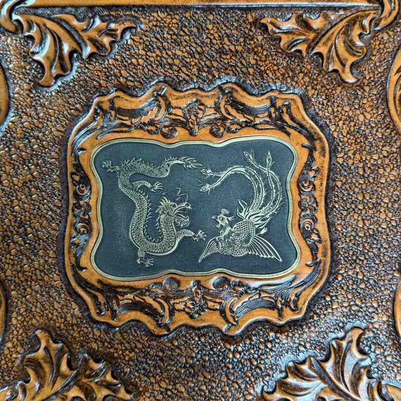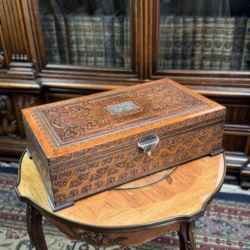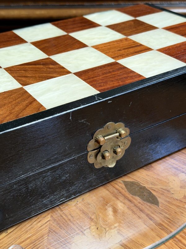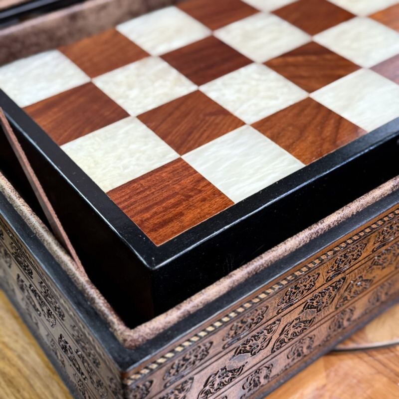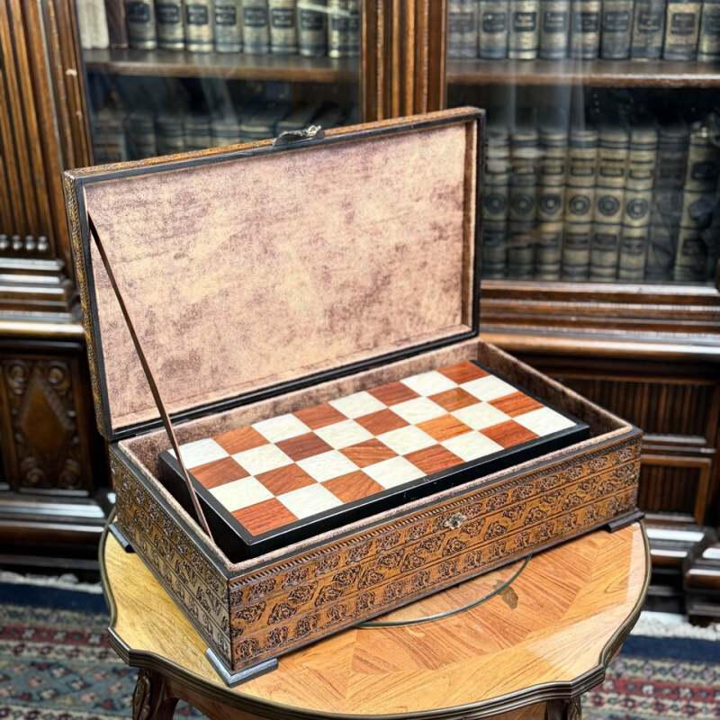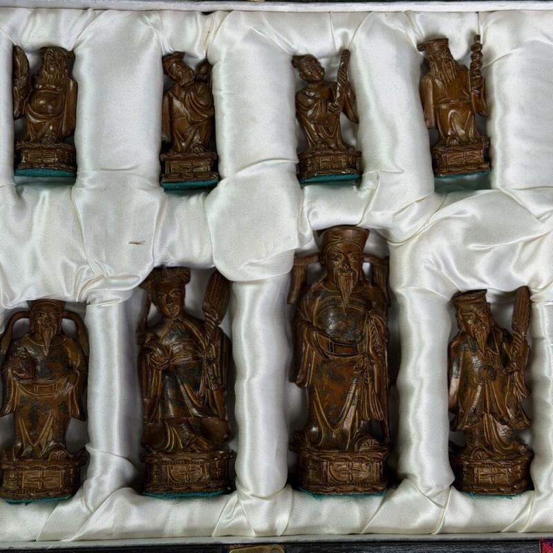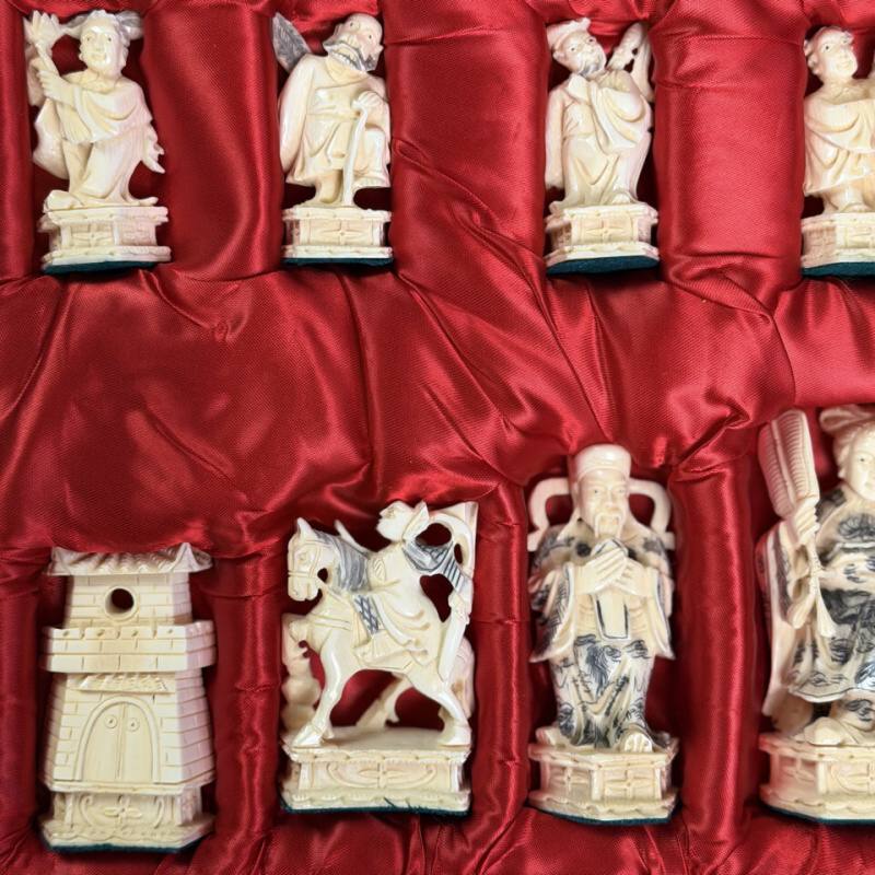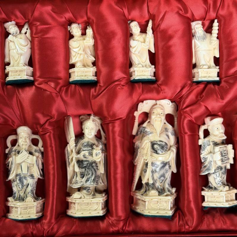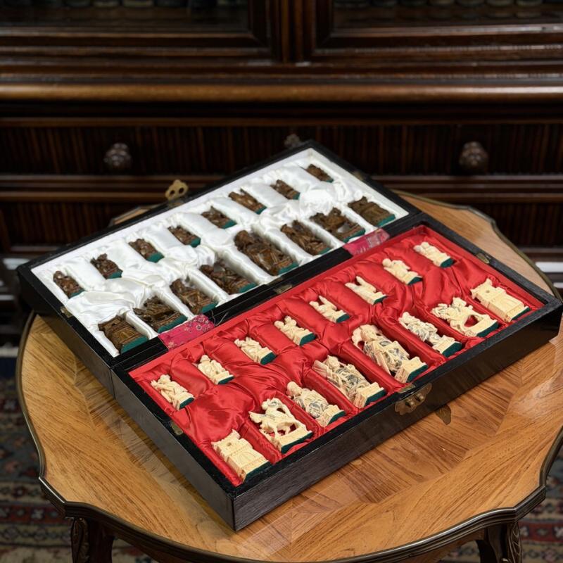 Антикварные шахматы, выполненные из слоновой кости в технике художественно-скульптурной ручной резьбы. Шахматные фигуры представляют собой соответствующих «персонажей» игры. Набор состоит из мини-скульптур: пешки выполненные как 8 даосских бессмертных, короля и ферзя мастер изобразил как императора и императрицу в богатых одеждах ,которые символизируют семейную гармонию и священную семью. Офицеры изображены в качестве императорских советников, ладьи — в виде башен, кони выполнены в виде всадников. Резьба по слоновой кости является самым древним видом декоративно-прикладного искусства и насчитывает уже несколько тысяч лет. Техника резьбы отличается тонкостью, роскошным декором и сложностью изготовления предмета. Наибольшим почетом пользовалась исключительно резьба по слоновой кости.
