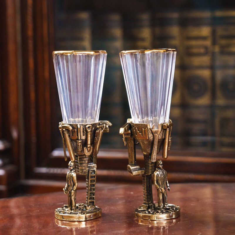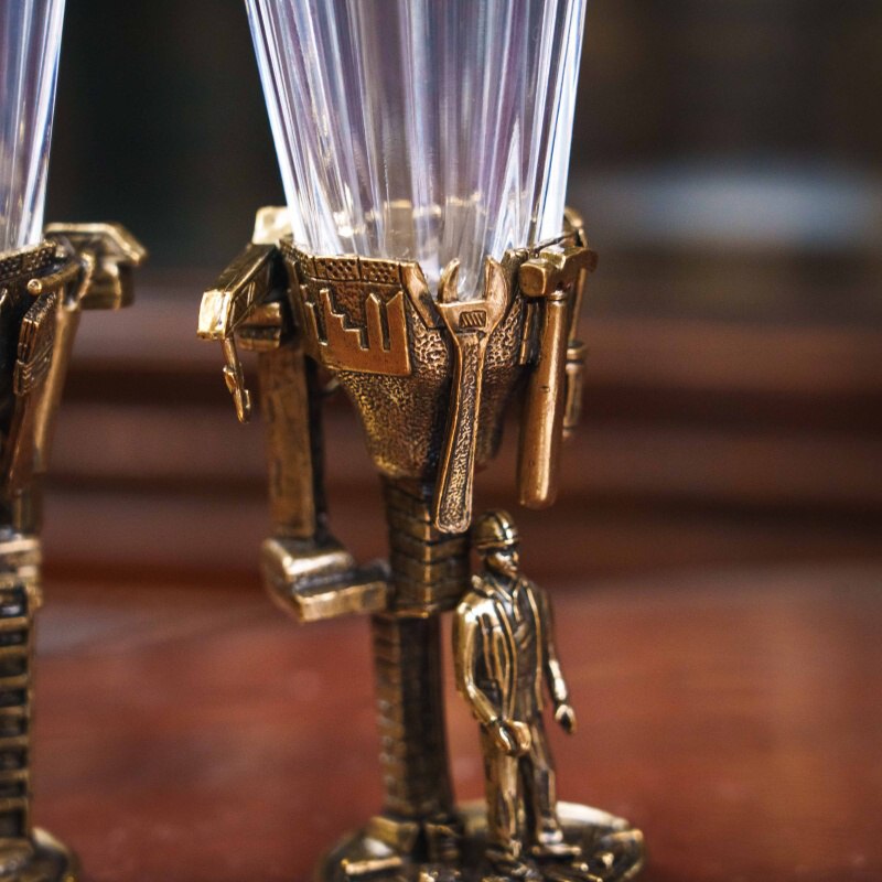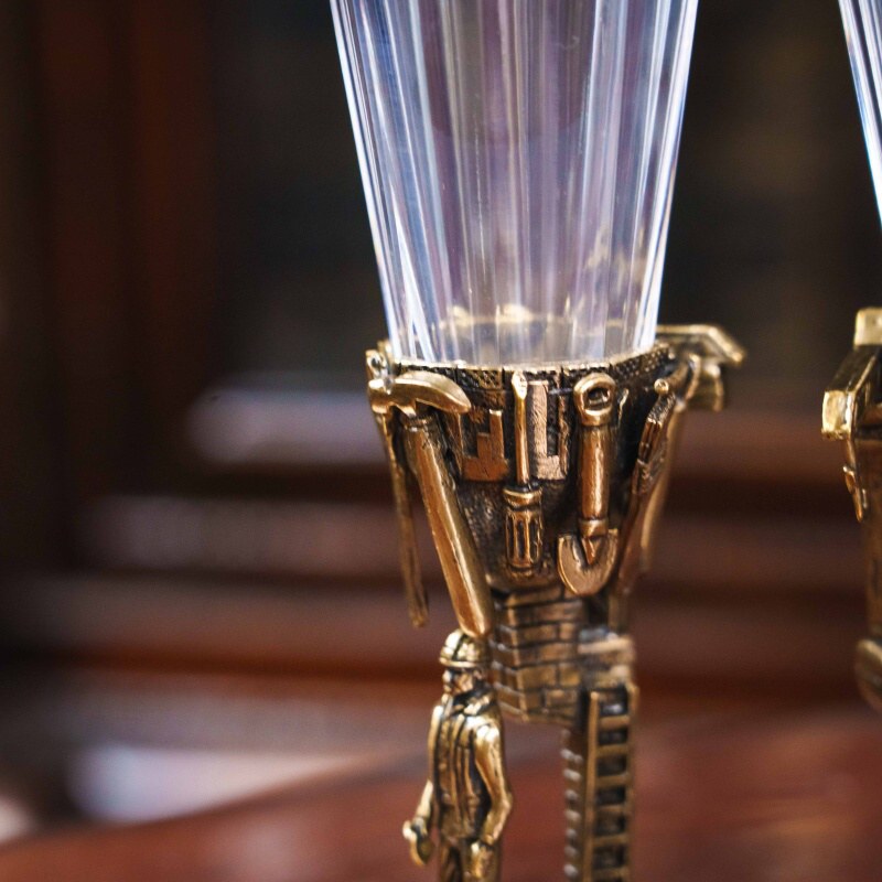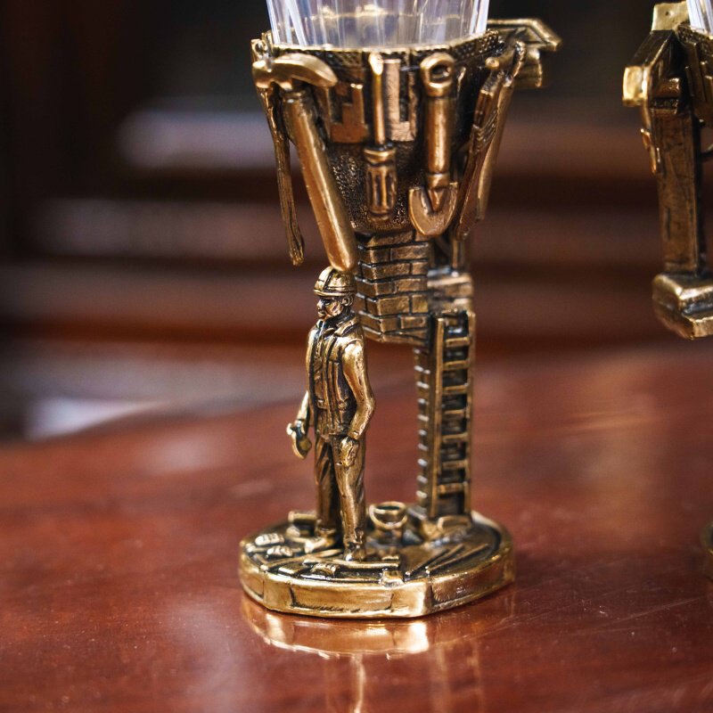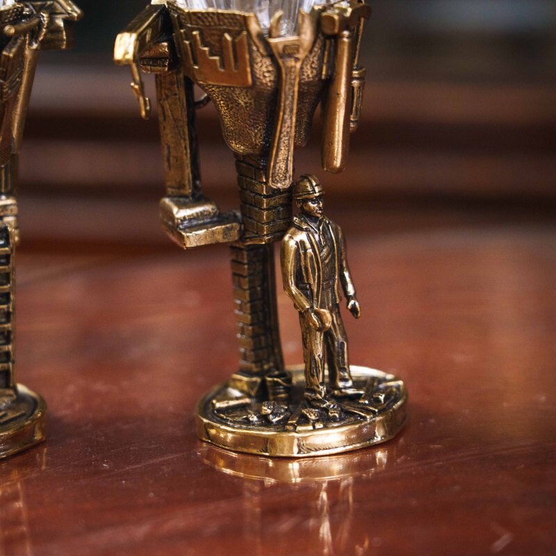Литая массивная бронза, с объемным изображением строителя, и сопутствующего ему инвентаря. Набор из двух лафитников в специальной подарочной коробке.