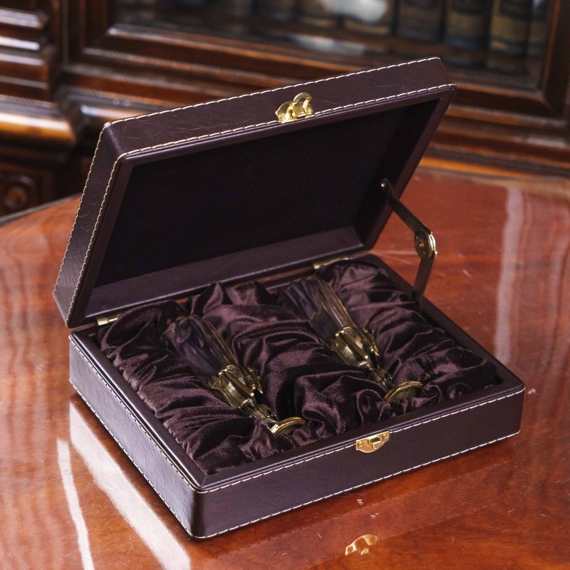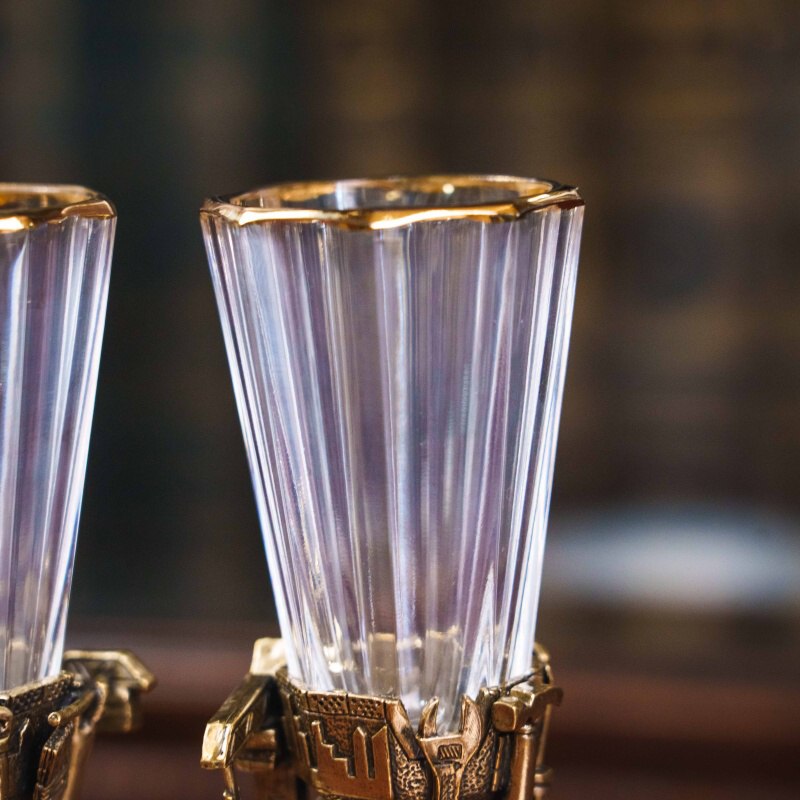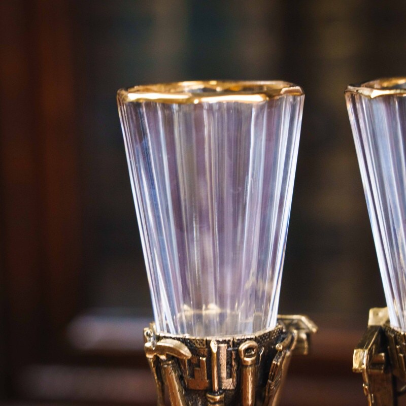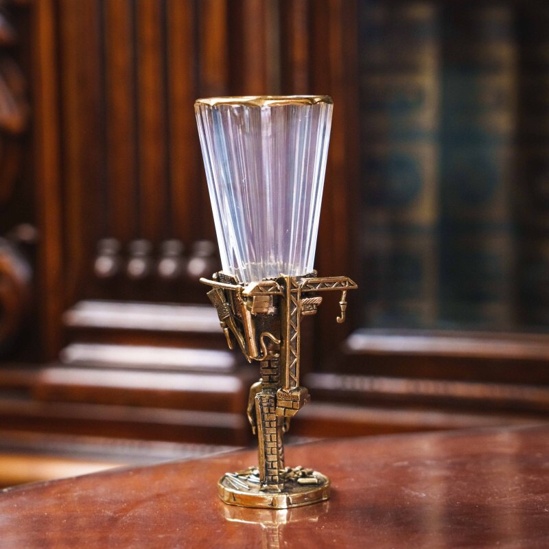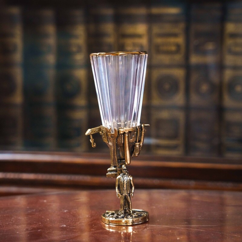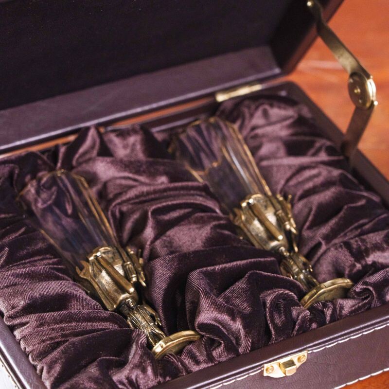 Литая массивная бронза, с объемным изображением строителя, и сопутствующего ему инвентаря. Набор из двух лафитников в специальной подарочной коробке.