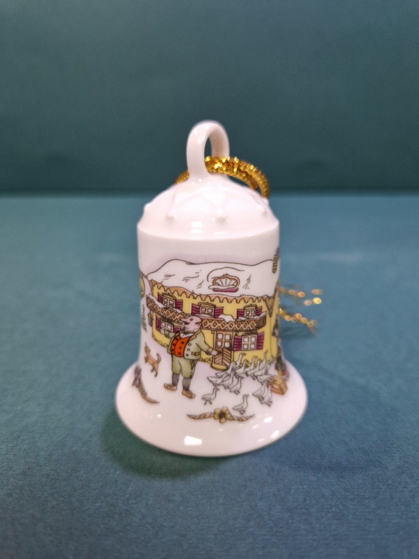 Изделие выполнено в характерной манере серии Weihnachtsglocke: яркая палитра, тонкие декоративные линии, цветочные бордюры и множество милых деталей. Колокольчик дополнен золотистым шнуром для подвеса и фарфоровым внутренним язычком. На обороте указаны год выпуска — 1992 — и название сюжета, обрамлённое классическим венком.