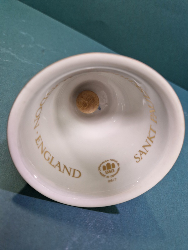 На оборотной стороне размещён золотой крест с датой 1977 — годом выпуска изделия. По нижнему краю проходит традиционная серия-фраза B&G: “Ring out the Old, Ring in the New”, отсылающая к стихотворению Альфреда Теннисона. Внутри — деревянный язычок, а на внутренней стенке нанесено фирменное клеймо B&G Copenhagen Porcelain – Made in Denmark – 9677, гарантирующее подлинность.