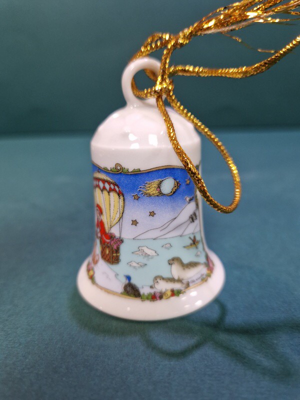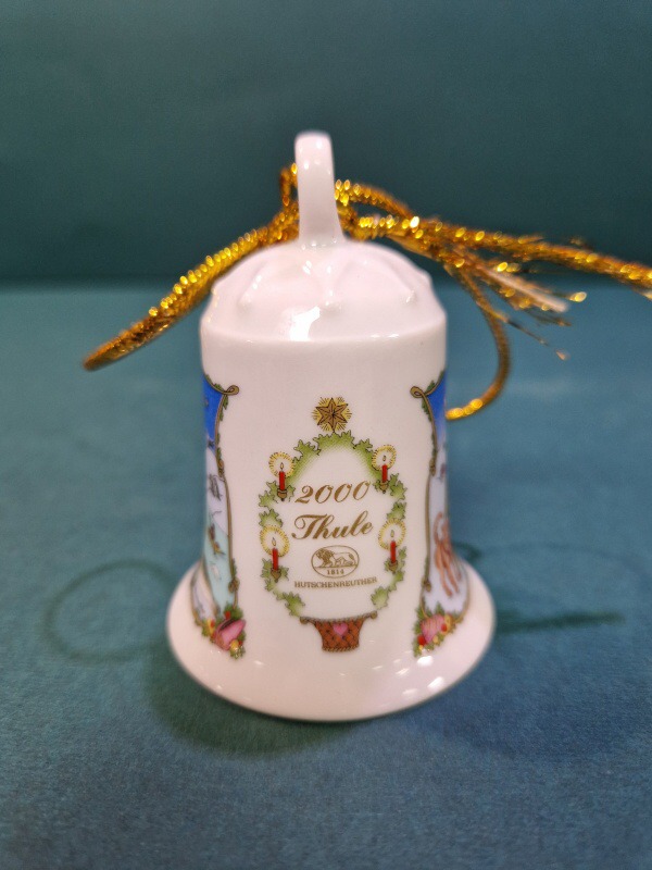 Фарфоровый коллекционный колокольчик Hutschenreuther 2000 года оформлен яркой праздничной росписью, посвящённой сюжету “Thule” — символическому северному краю зимней сказки.