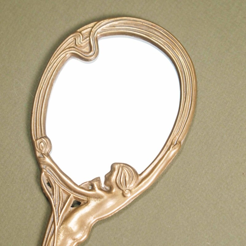 Элегантное ручное зеркало в стиле Ар-Нуво украшено литой фигурой обнажённой нимфы, плавно переходящей в изящную рамку зеркального полотна. Образ юной девушки органично вплетён в композицию и подчёркивает характерные для направления Ар-Нуво текучие, растительные линии.