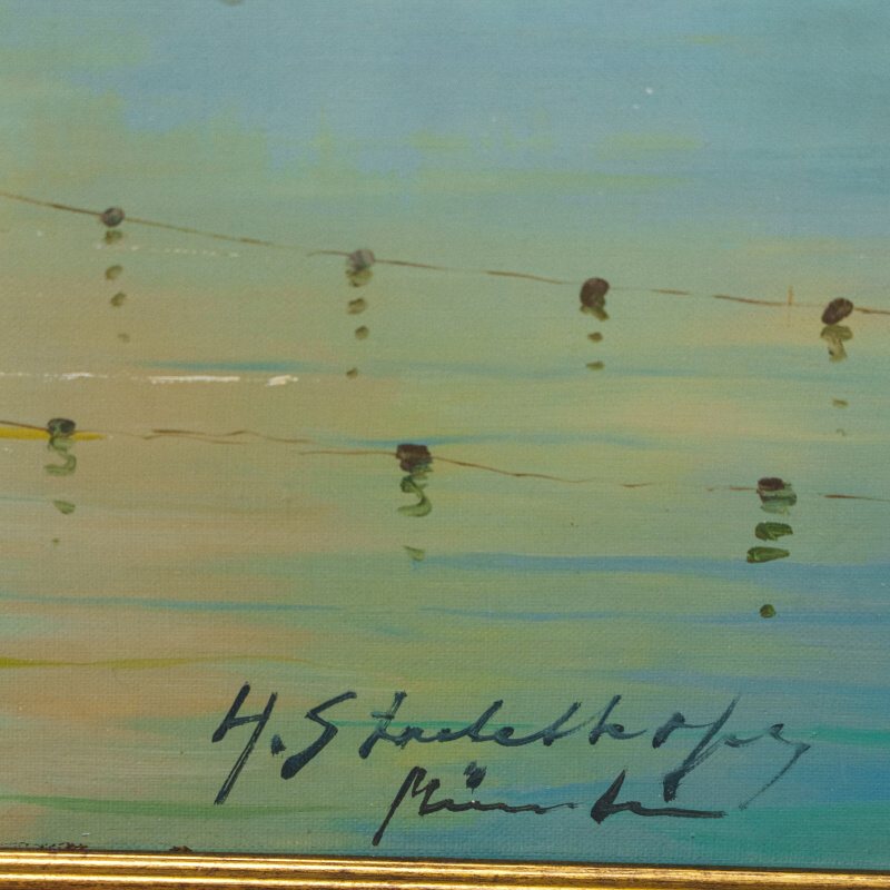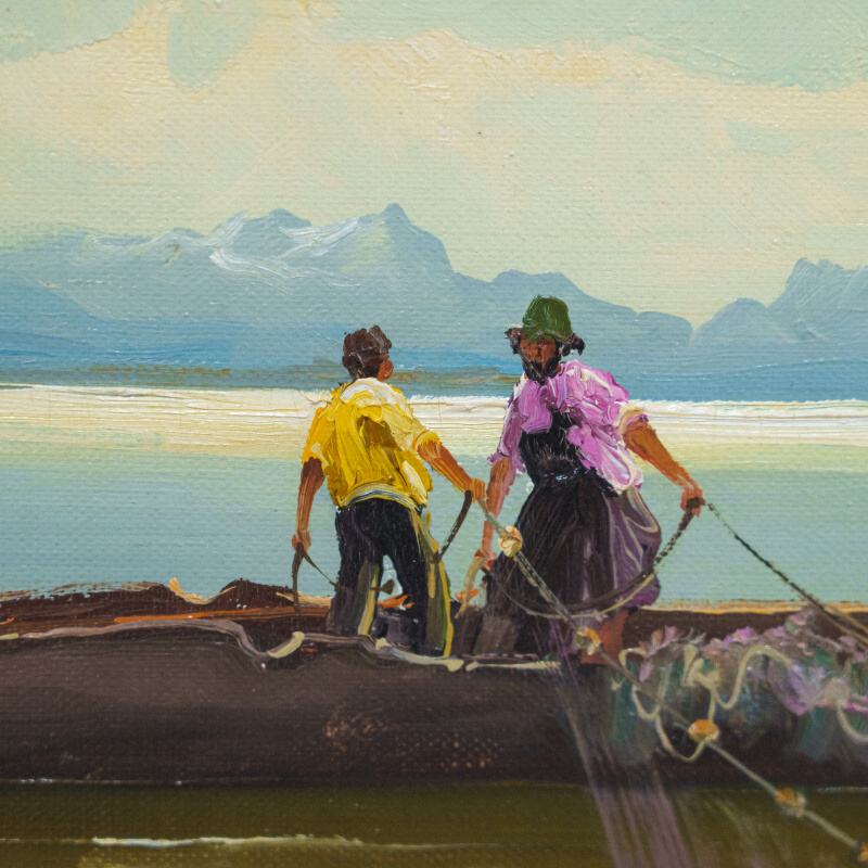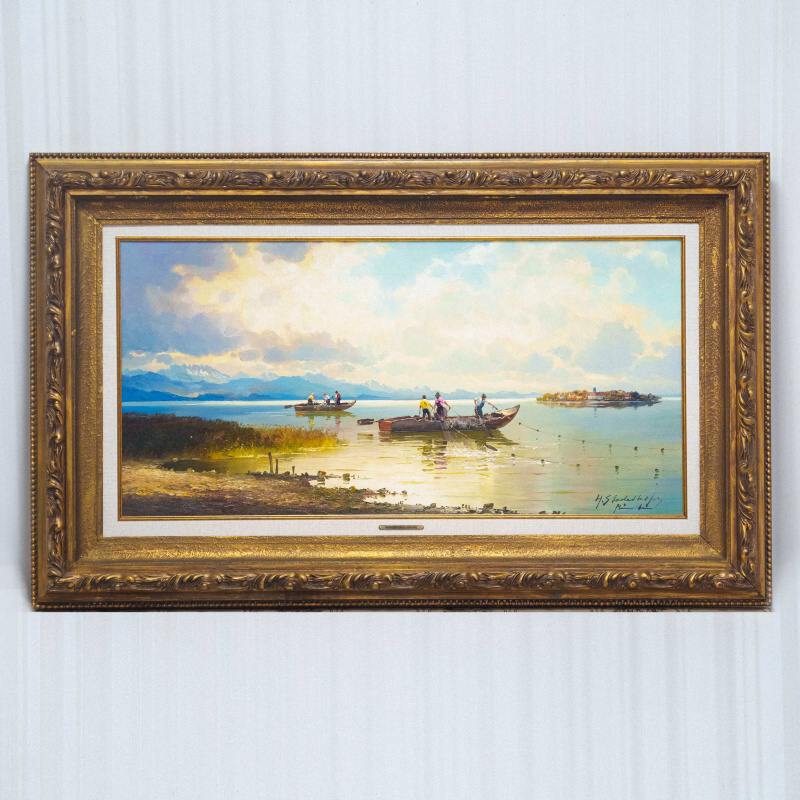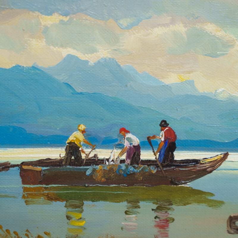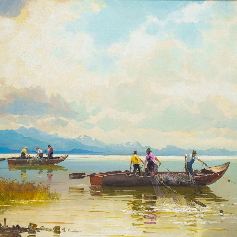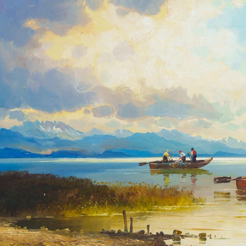 Представлена картина известного немецкого художника Helmut Stadelhofer c условным названием «Рыбаки на озере Кимзее».