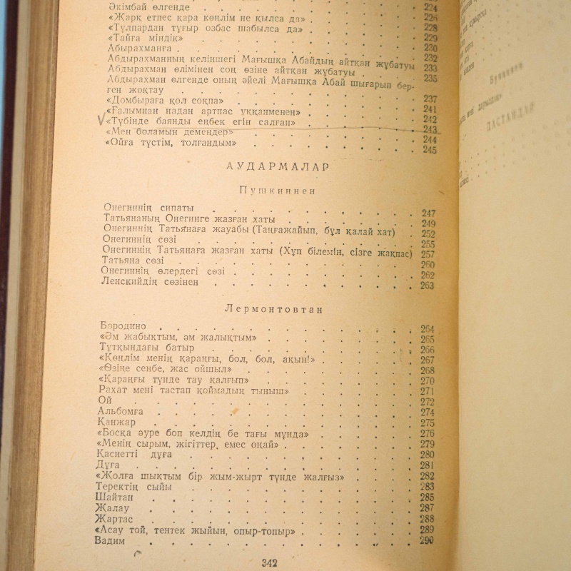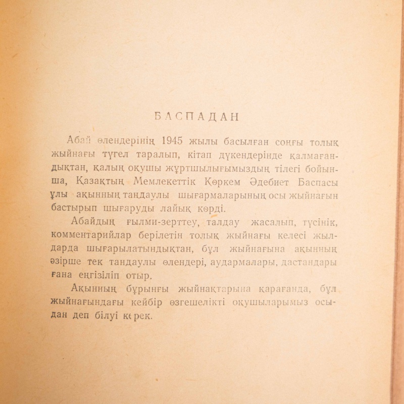 Сборник избранных произведений великого казахского поэта, мыслителя, просветителя, композитора и основоположника казахской письменной литературы – Абая (Ибрагима) Кунанбаева (1845-1904 гг.). Данный сборник издан в городе Алма-Ате, в 1952 году. «Таңдамалы шығармалары» (Избранные произведения) Абая Кунанбаева — это сборник, включающий его стихи, поэмы, переводы русской и европейской литературы, а также философские размышления в виде прозаического цикла «Слова назидания» («Қара сөздер»). В него вошли произведения, отражающие социальные, общественные и моральные проблемы казахского народа. Произведения Абая отражают его стремление просветить народ, приблизив его к европейской культуре, и способствовали формированию казахской письменной литературы и литературного языка.