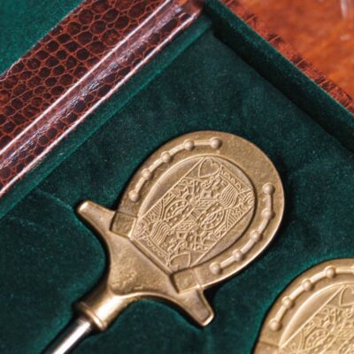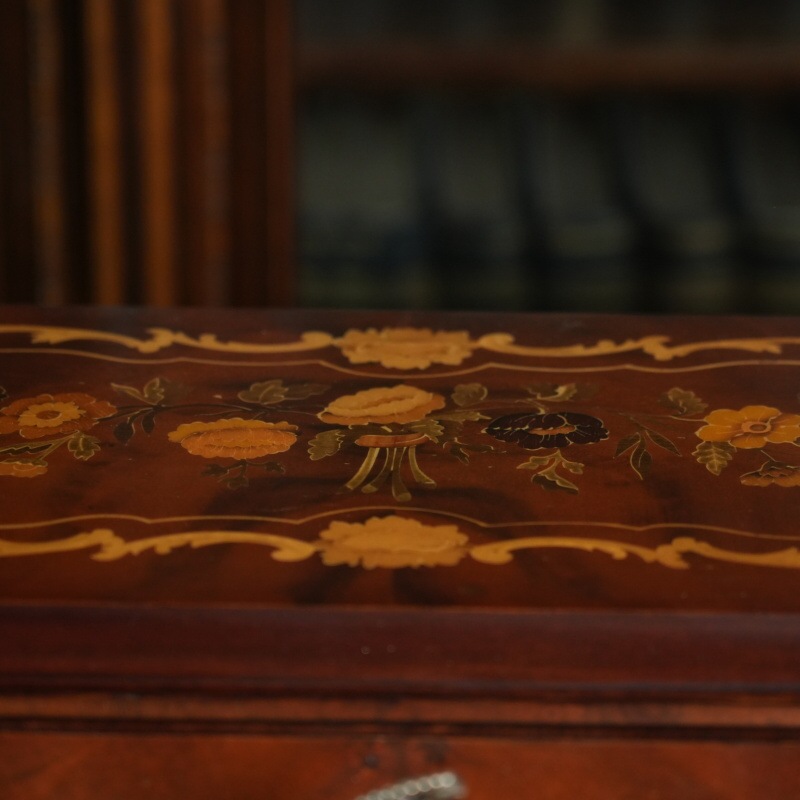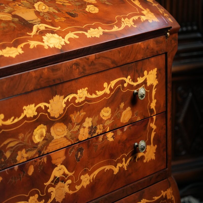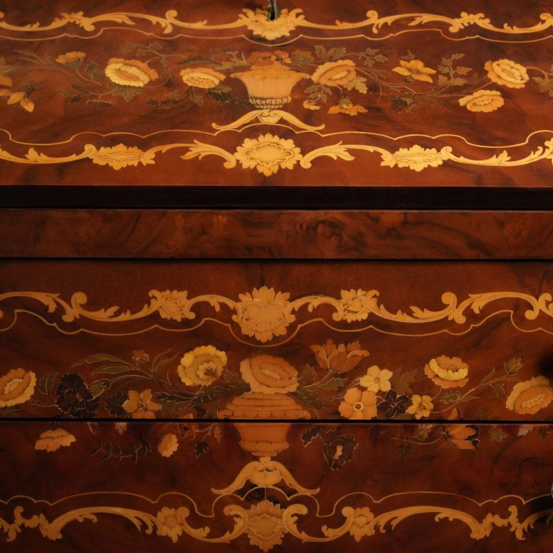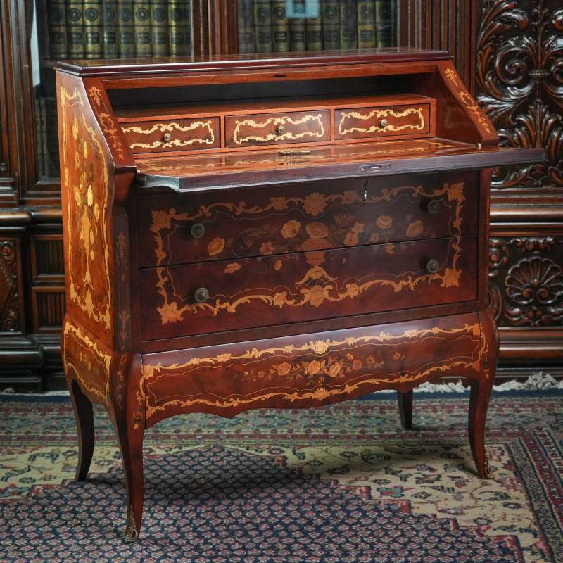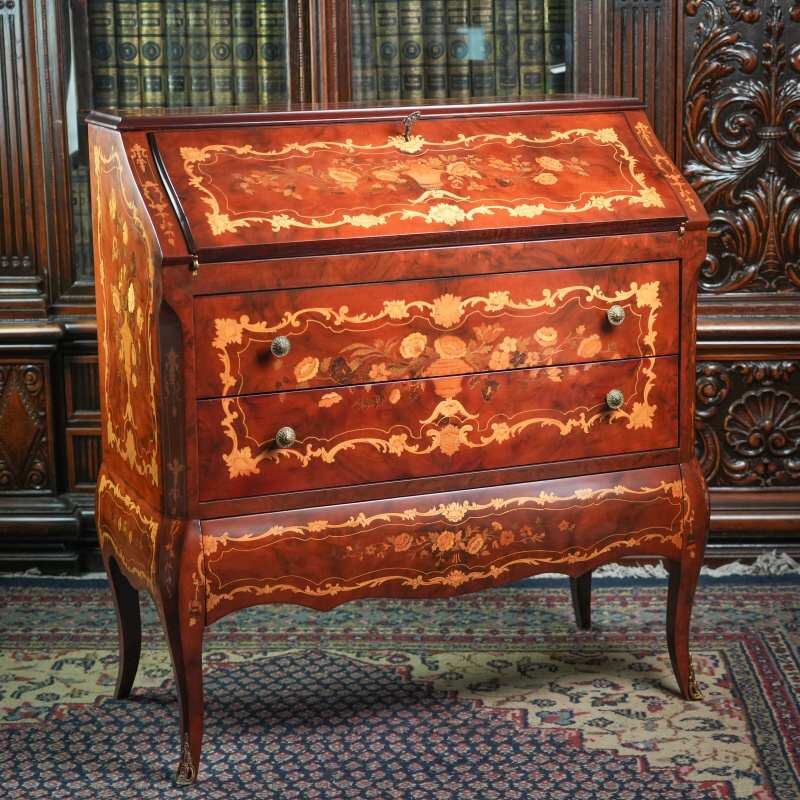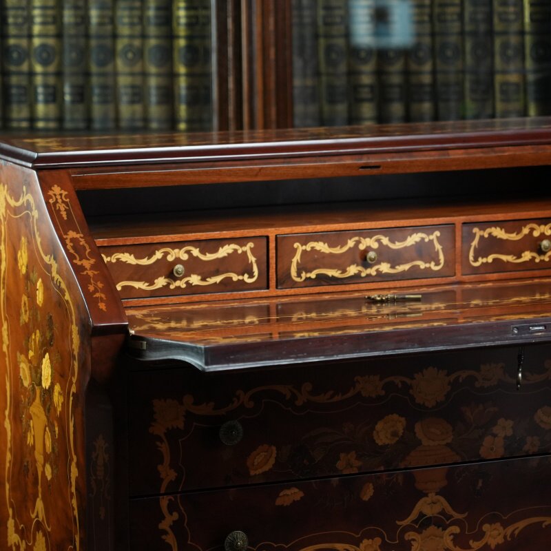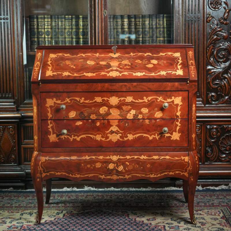 Антикварный итальянский секретер представляет собой изысканный образец мебельного искусства, выполненный в богатой декоративной манере с преобладанием тёплых древесных тонов и тонкой инкрустации. Корпус имеет характерные изящные очертания: плавно изогнутые ножки, расширяющийся книзу силуэт и мягкие контуры, создающие впечатление лёгкости и утончённости. Главным украшением служит сложная маркетри — наборные изображения из различных пород древесины, которые формируют цветочные гирлянды, тонкие завитки и симметричные орнаменты. Светлые детали инкрустации контрастируют с глубоким коричнево-красным тоном основного шпона, добавляя изделию благородства.