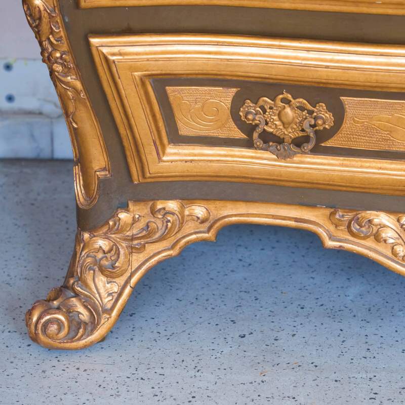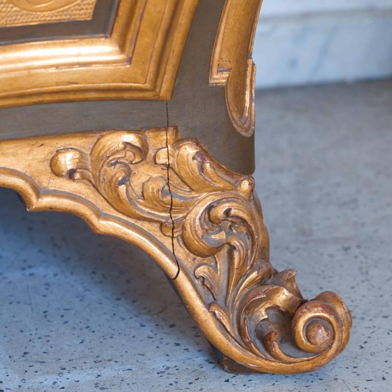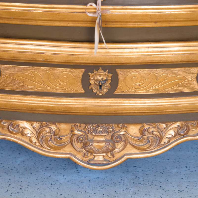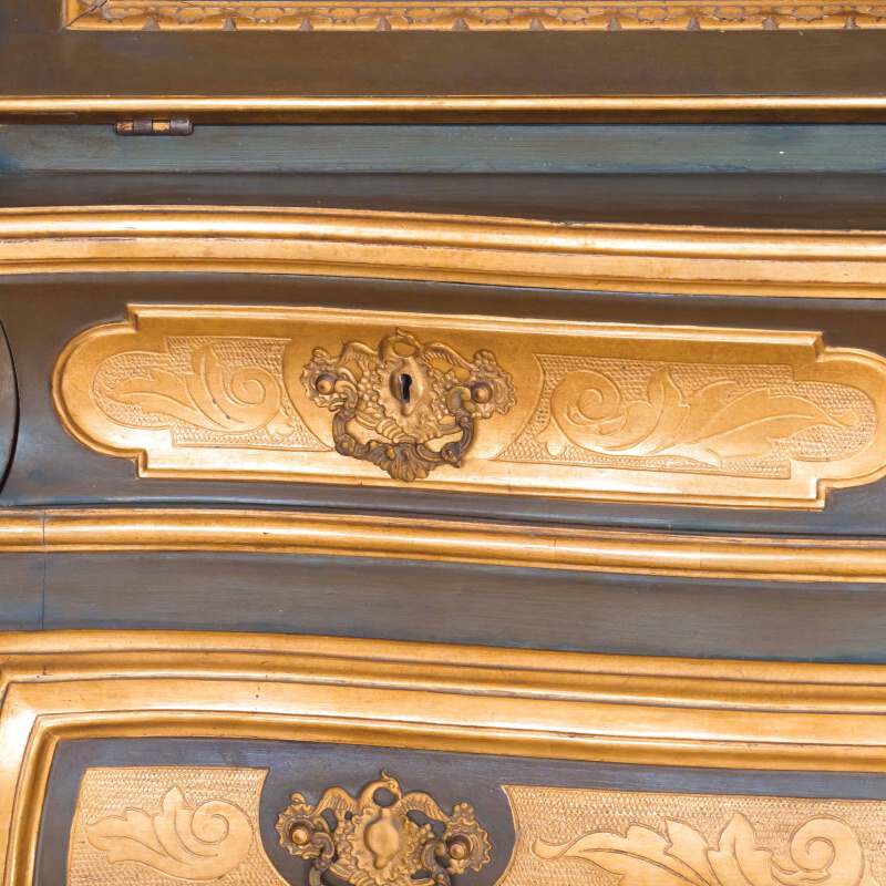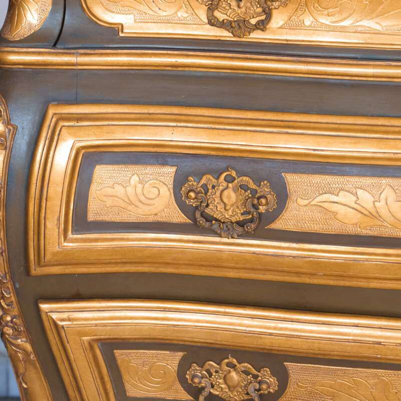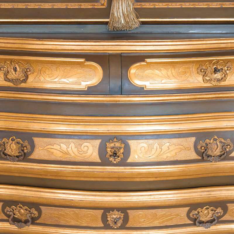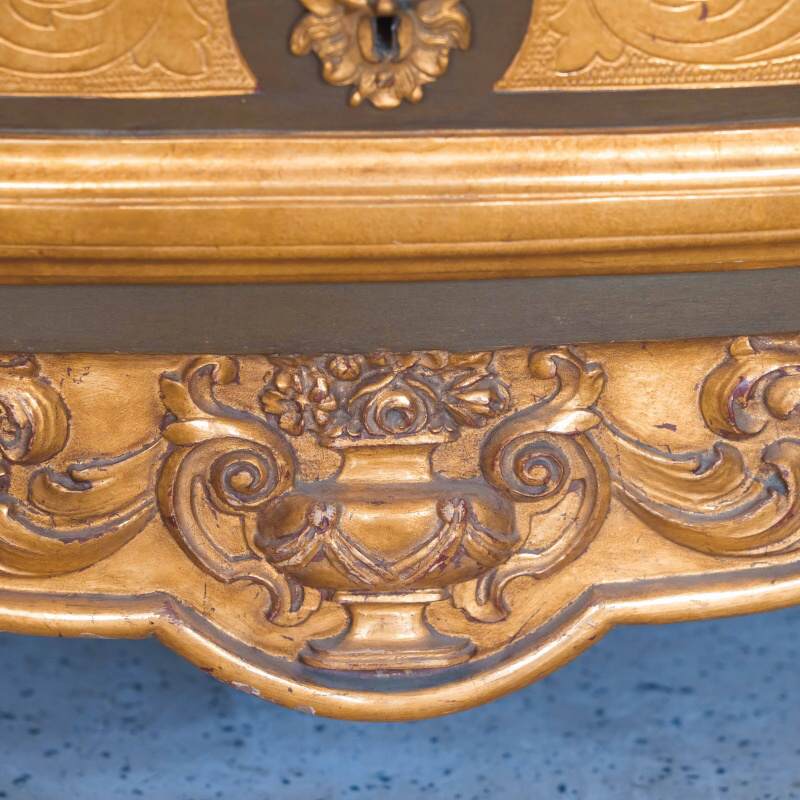 Фасады украшены богатой золочёной резьбой — растительные гирлянды, картуши и изящные орнаменты словно струятся по поверхности, создавая игру света и тени. Контраст тёплого древесного оттенка с деликатной позолотой придаёт предмету благородную глубину и ощущение роскоши, не переходящей в избыточность.