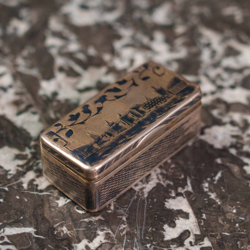 Крышка украшена тонкой гравированной композицией с архитектурным пейзажем — панорамным видом городских укреплений и башен, выполненных в характерной для середины XIX века манере.
