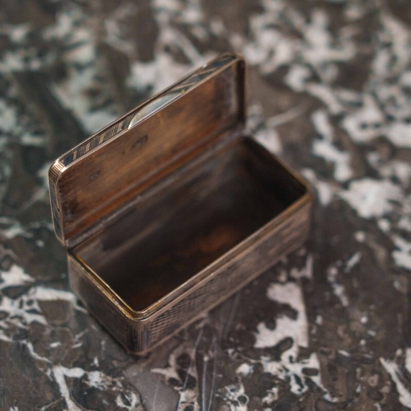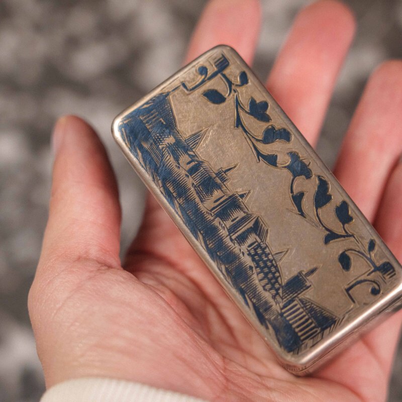 Серебряная табакерка прямоугольной формы, выполненная из серебра 84 пробы с использованием техники чернения. Корпус лаконичный, с чёткой геометрией, подчёркнутой аккуратной обработкой граней и плотной посадкой крышки.
