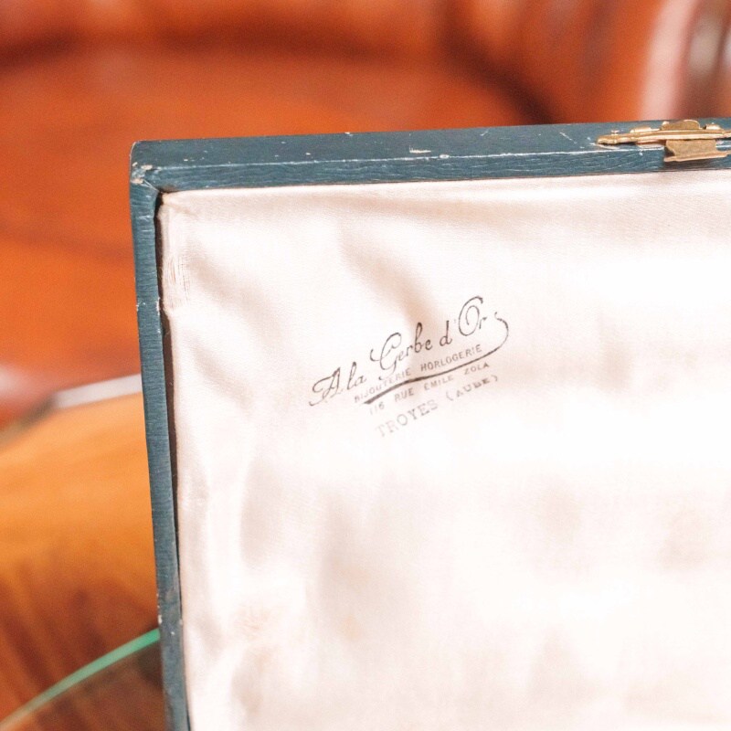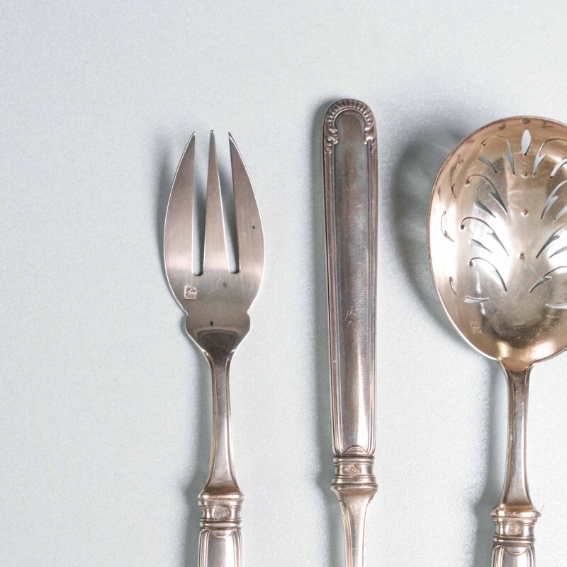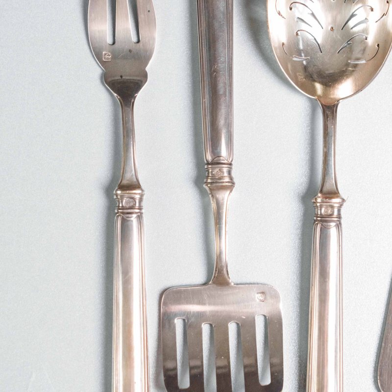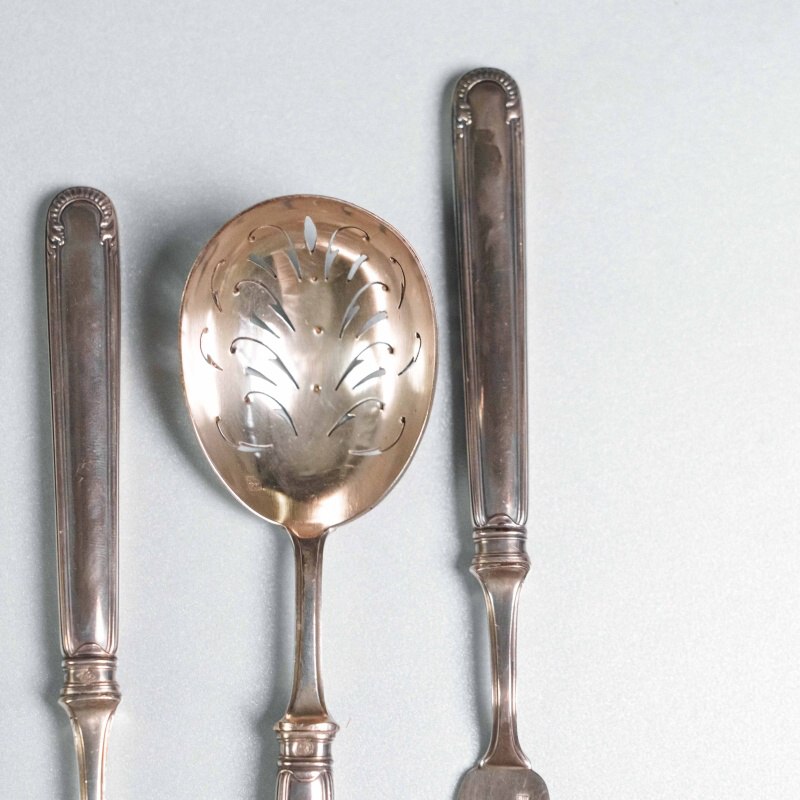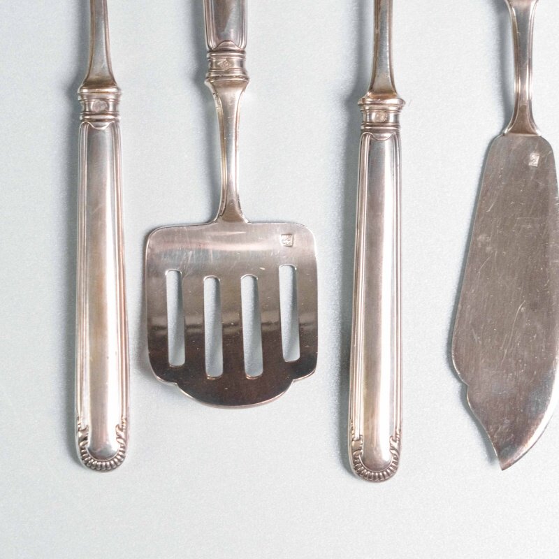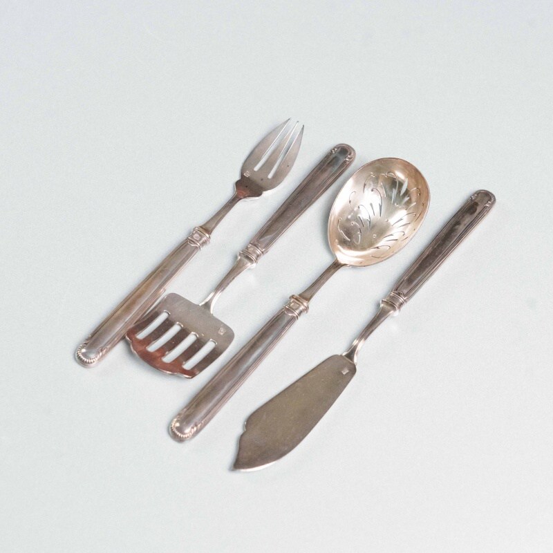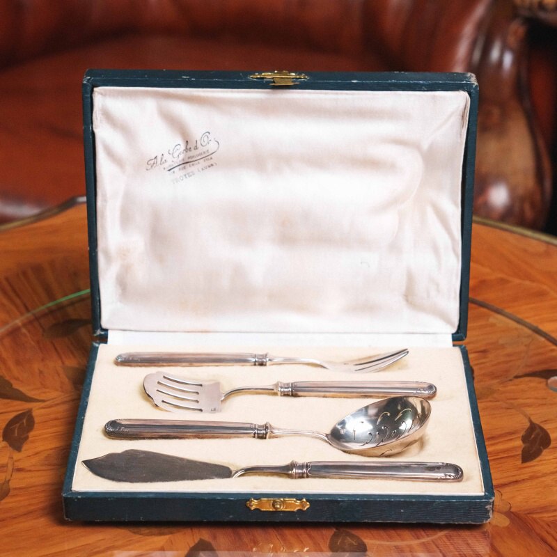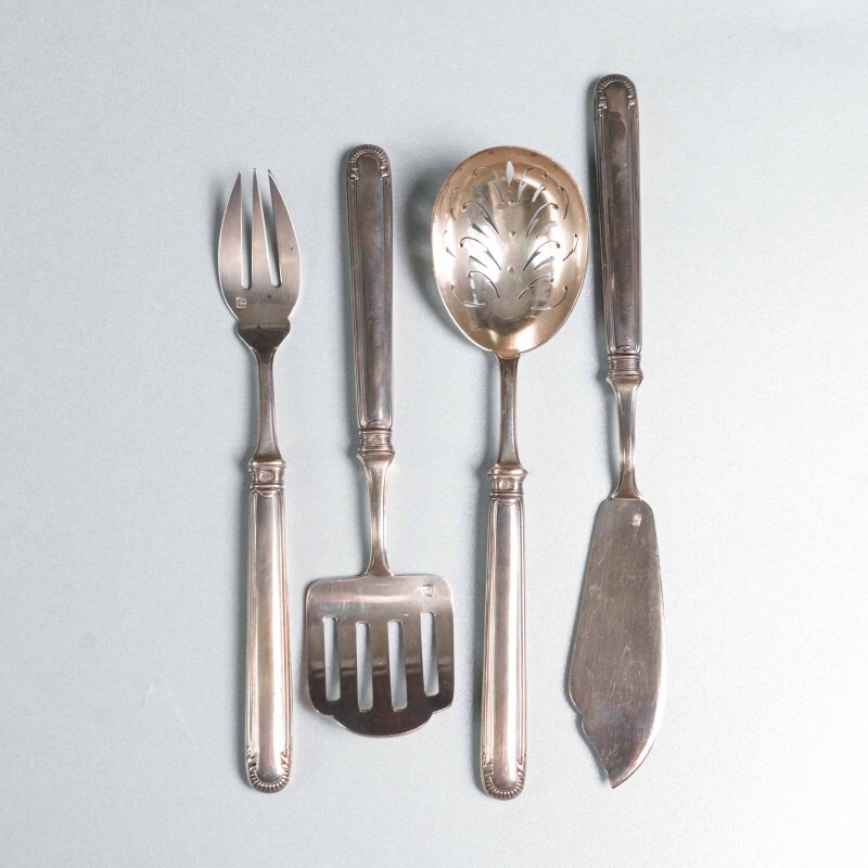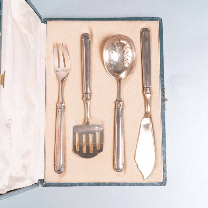 Сервировочный набор из четырёх предметов в оригинальном футляре. Комплект включает лопатку для торта, сервировочную ложку с ажурным орнаментом, вилку и лопатку для рыбы. Изделия выполнены в классическом стиле с гладкими поверхностями и изящным рельефным кантом по краю ручек. Внутренняя отделка футляра из светлого атласа с тиснением A. L. Collet & Cie, указывает на принадлежность набора известной французской серебряной мастерской. Небольшой размер и изящество форм указывают на его предназначение для подачи закусок и десертов, а высокое качество серебра 950 пробы подчёркивает статус и утончённый вкус его владельца.