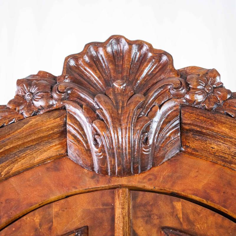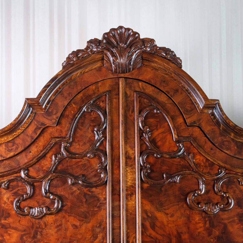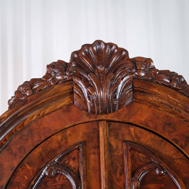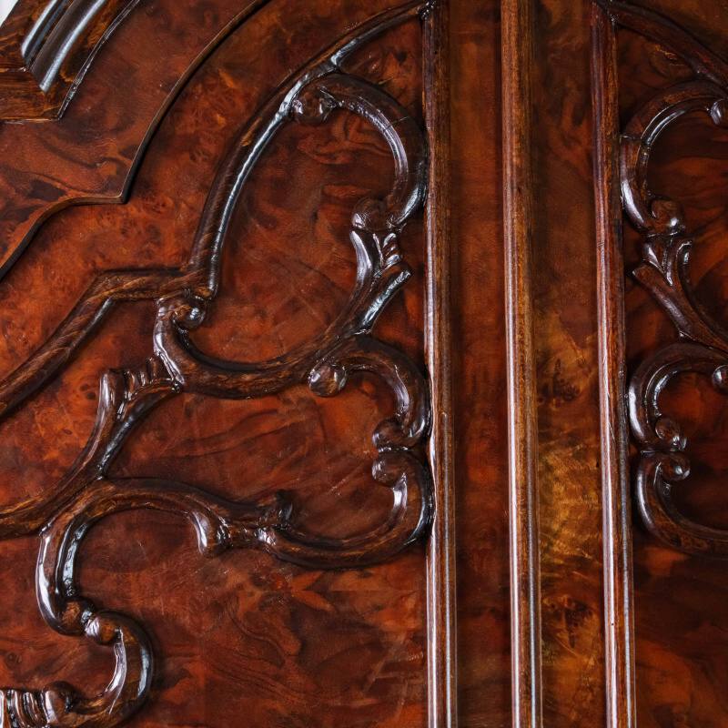 Верхняя часть шкафа украшена эффектным фигурным карнизом с резным растительным орнаментом — цветочными гирляндами и завитками в духе рококо. Центральный медальон венчающей части выделяется особой утончённостью резьбы.