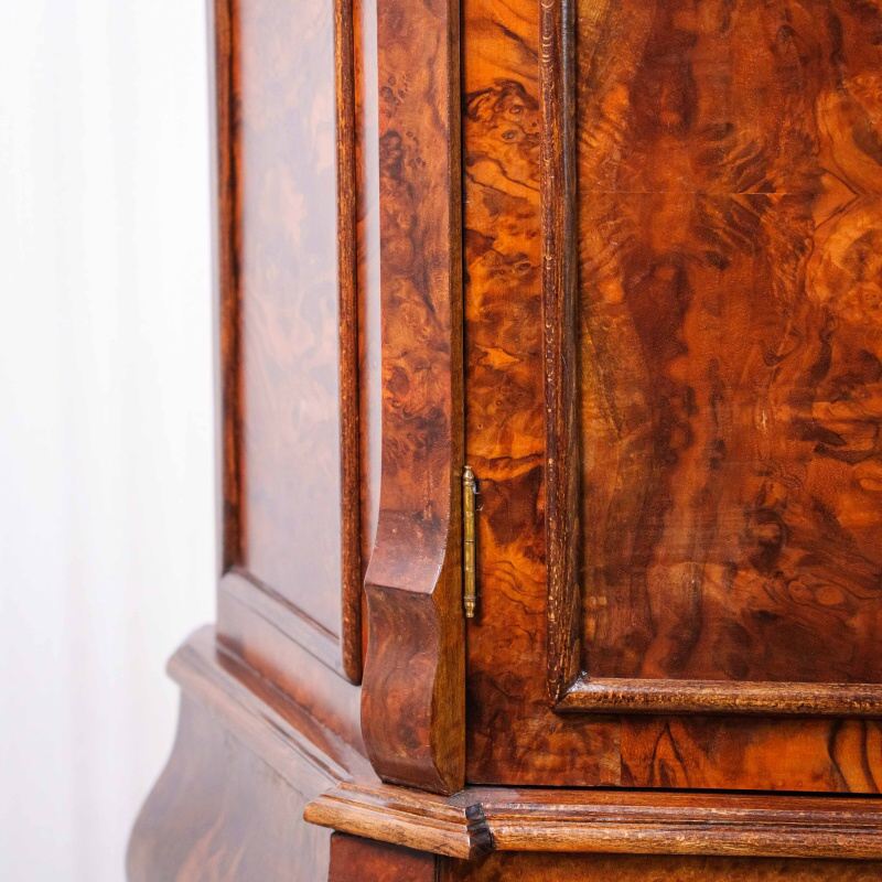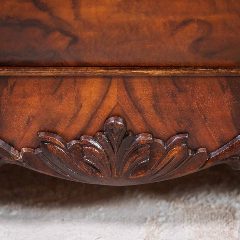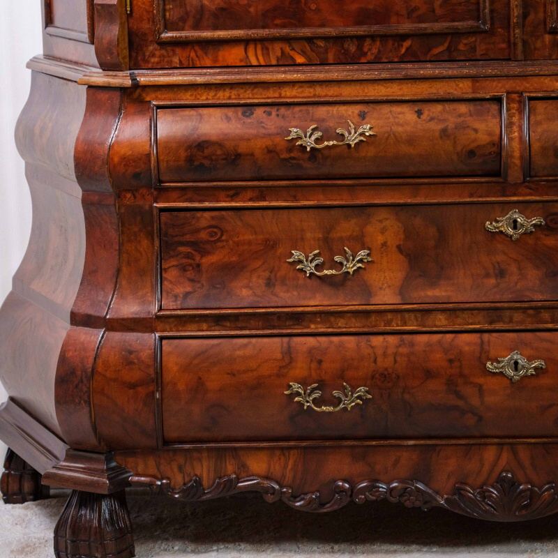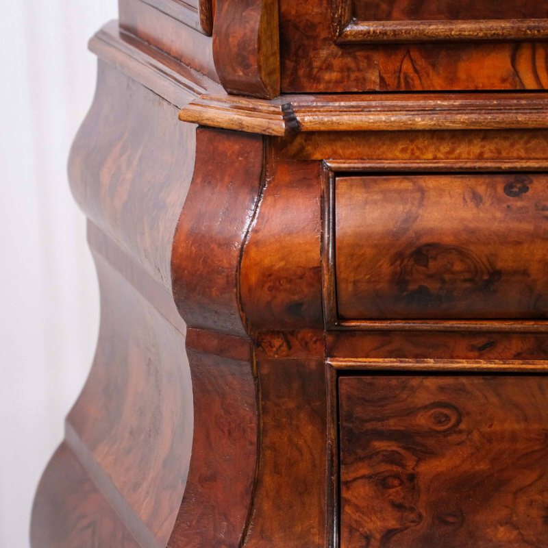 Дверцы — двухстворчатые, с тщательно подобранным рисунком шпона и резными накладками в верхней части. Под ними расположены три объемных яруса выдвижных ящиков, форма которых плавно изогнута, создавая характерный «бомбе» силуэт, типичный для мебели стиля барокко или Людовика XV.