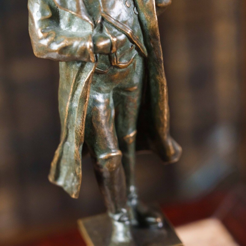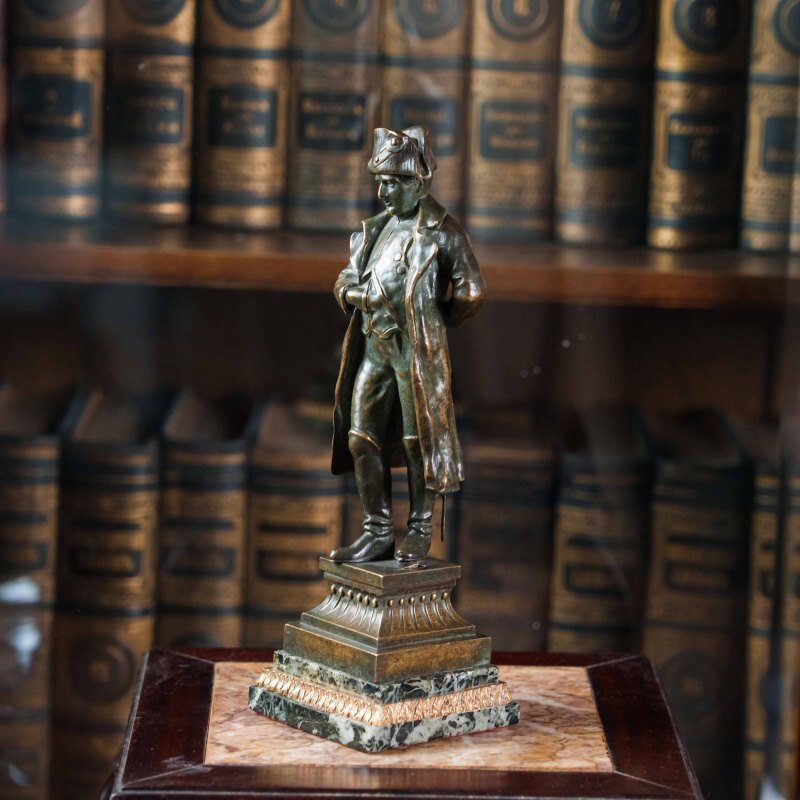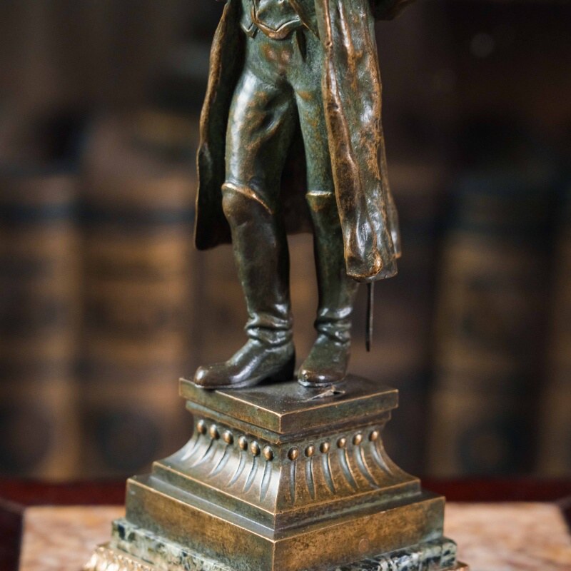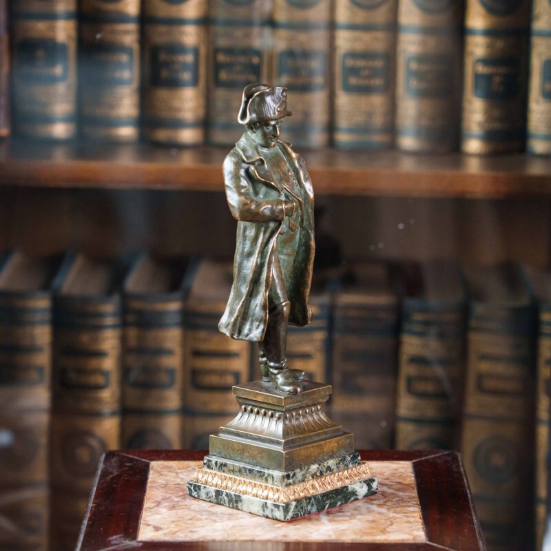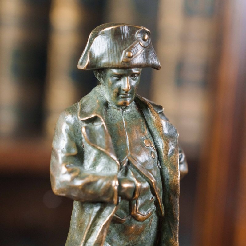 Классическая кабинетная бронзовая статуэтка, изображающая императора Наполеона I Бонапарта (1769–1821) — одну из самых выдающихся фигур в истории Франции и Европы. Император представлен в характерной позе, с рукой, заложенной за лацкан мундира, — жест, ставший символом собранности и уверенности. Его образ передан с величием и достоинством: строгий мундир с орденами и эполетами, плащ, наброшенный на плечи, и знаменитая треуголка подчёркивают военную доблесть и державный характер. Бронза покрыта благородной тёплой коричневой патиной, придающей поверхности мягкий блеск и глубину. Фигура установлена на подиум из полированного мрамора, создающего контраст фактур и усиливающего монументальность композиции.