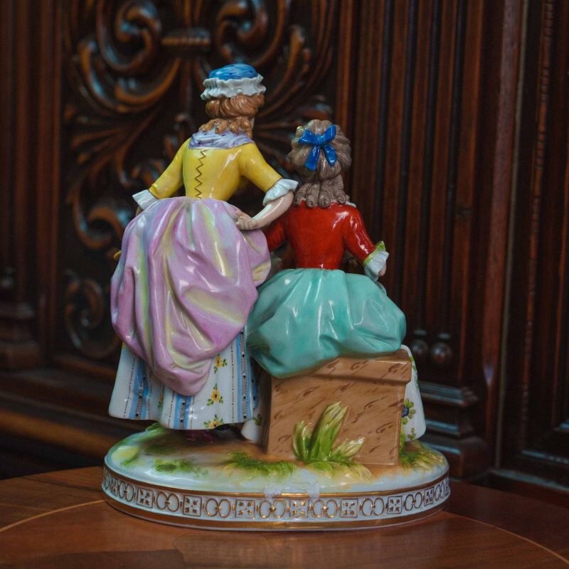 Рядом находятся две дамы: одна сидит на скамье, другая стоит с корзиной цветов, наблюдая за происходящим. Фигуры выполнены аккуратно, с мягкими чертами лиц и естественными позами.