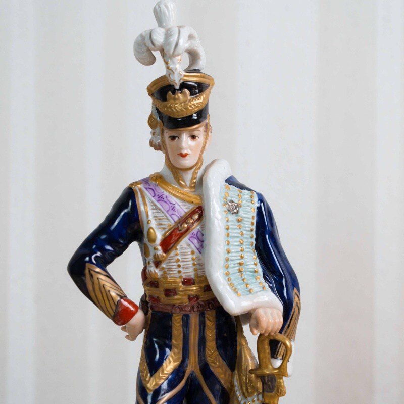 Статуэтка выполнена с высоким вниманием к деталям: тщательно проработаны элементы униформы, ордена, эполет, а также выразительная цветовая гамма с использованием насыщенных синих тонов и золочения. Ручная роспись и изящная моделировка характерны для продукции мануфактуры Rudolf Kemmer, известной своими историческими и военными персонажами.