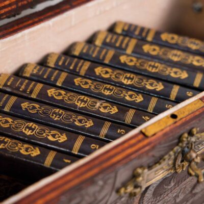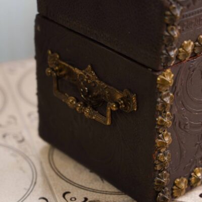 Основание стола также украшено бронзовыми деталями и декоративными элементами. Три массивные ножки соединены в основании и украшены бронзовыми фигурками и орнаментами, придающими столу устойчивость и грациозность. В центре основания находится изящная колонна, дополненная бронзовыми гирляндами и декоративными элементами, что усиливает впечатление роскоши и элегантности.