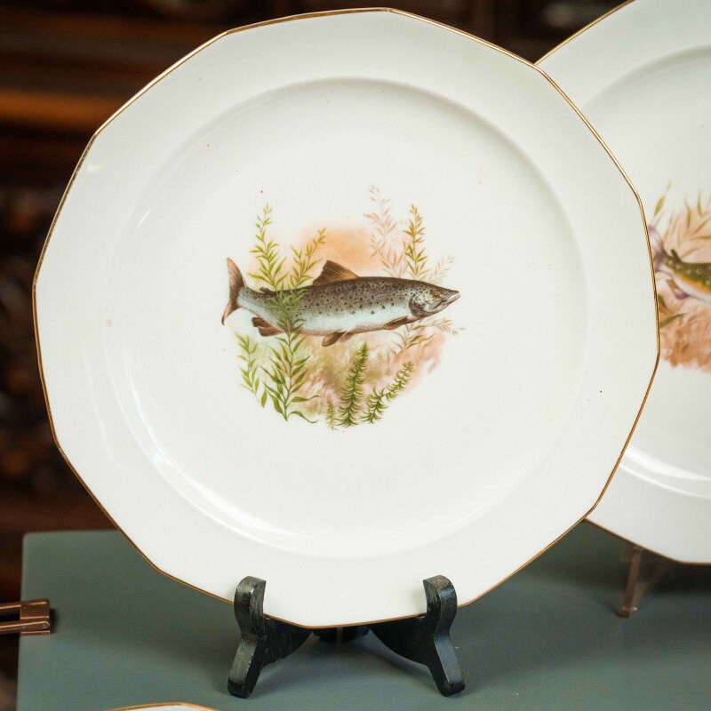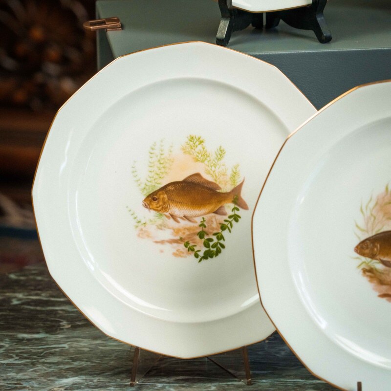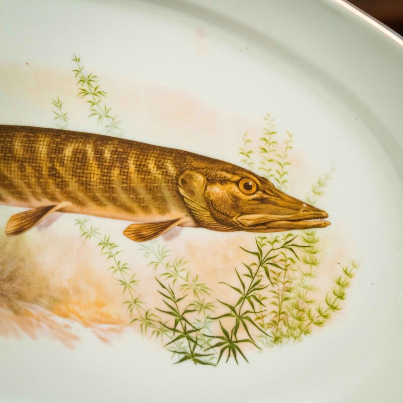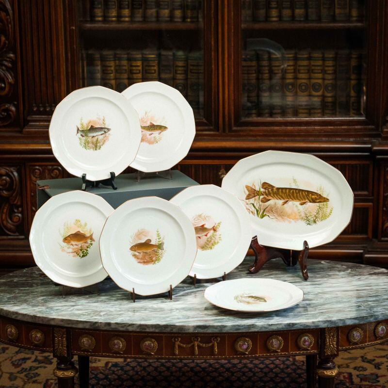 Набор из фарфора, включающий большое сервировочное блюдо и шесть восьмиугольных тарелок, выполнен на мануфактуре Horst Kuba — известной немецкой фабрике, располагавшейся в регионе Бавария. Все изделия украшены изображениями различных видов пресноводных рыб на фоне водных растений и водоёмного ландшафта.