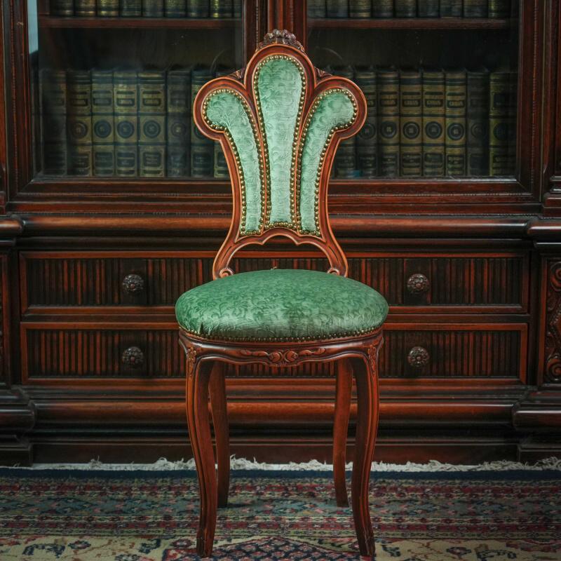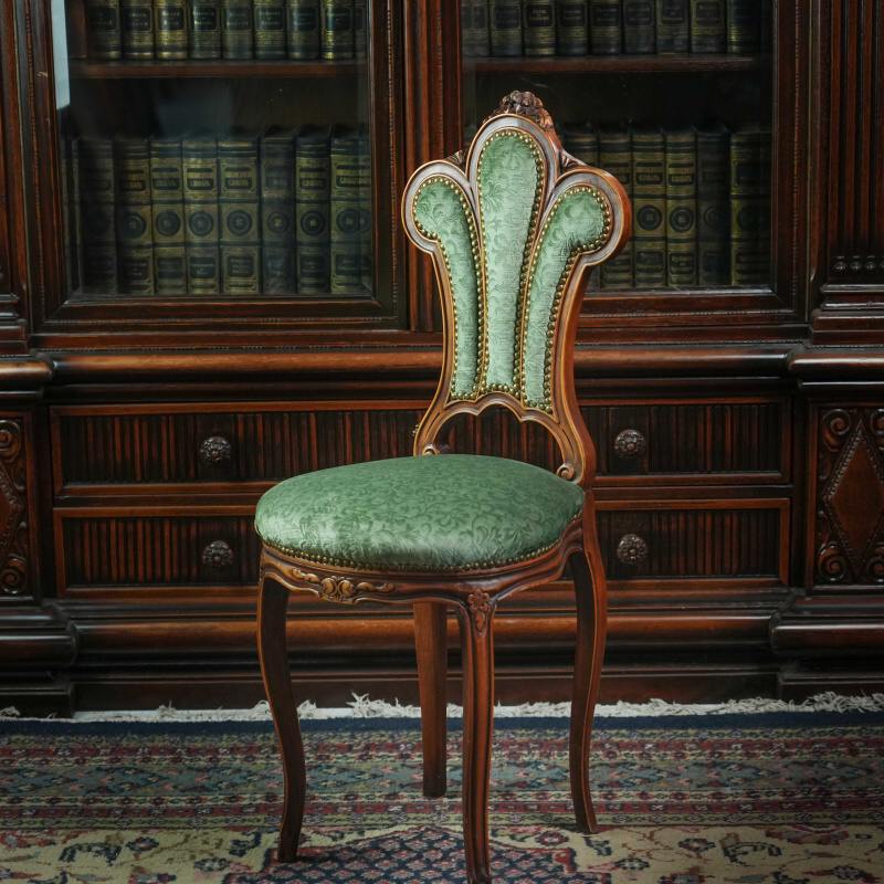 Антикварный стул выполнен в изысканном стиле конца XIX — начала XX века и поражает гармонией пропорций и утончённостью форм. Каркас изготовлен из массива дерева благородного тёплого оттенка, украшен ручной резьбой, подчёркивающей плавные линии конструкции. Особое внимание привлекает спинка оригинальной веерообразной формы, характерной для мебели эпохи историзма, с изящным контуром и декоративными элементами в виде резных завитков и растительных мотивов.