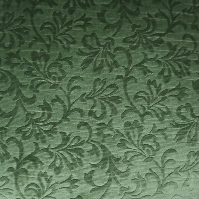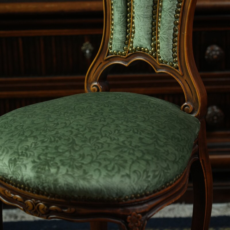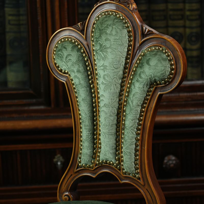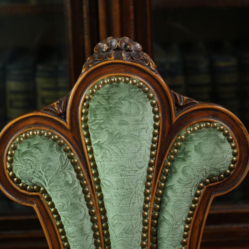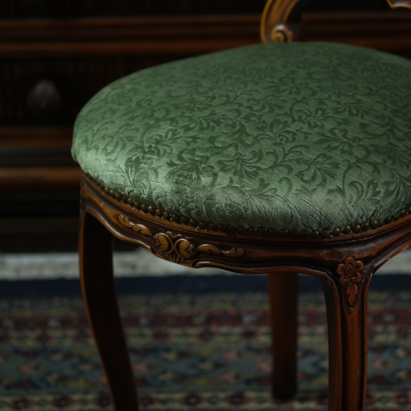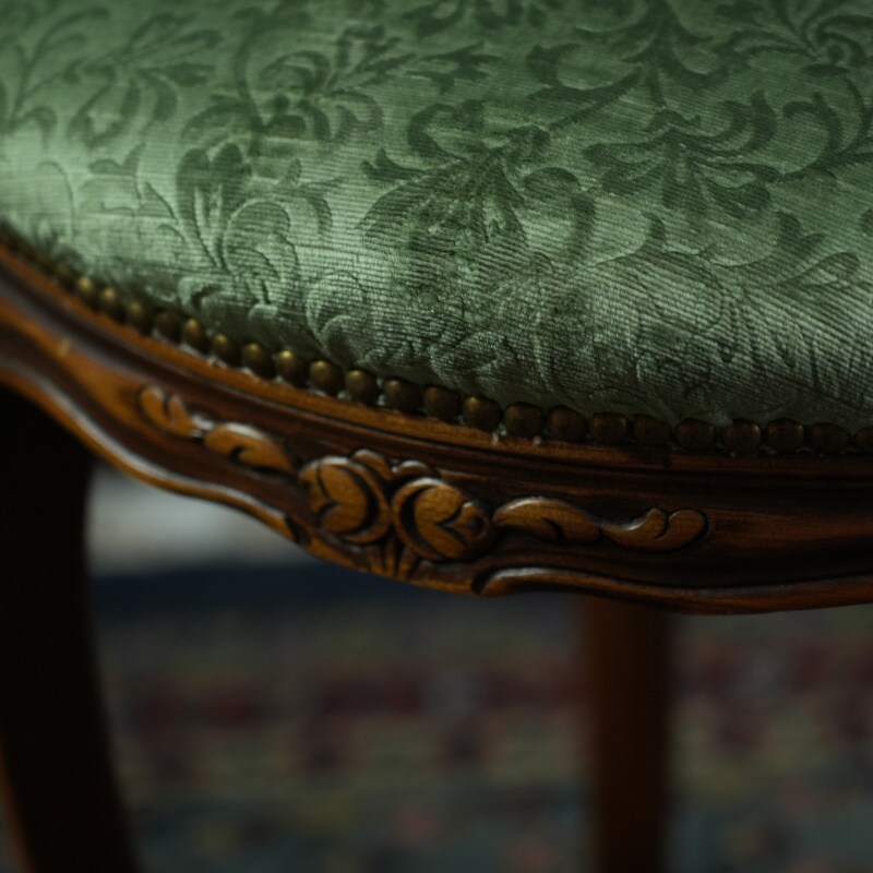 Обивка выполнена из плотной ткани насыщенного зелёного цвета с лёгким шелковистым блеском, гармонирующим с природным тоном древесины. Сиденье мягкое, округлой формы, обеспечивающее комфорт при посадке. Края декорированы рядом аккуратных гвоздиков, придающих изделию завершённость и аристократическую строгость.
