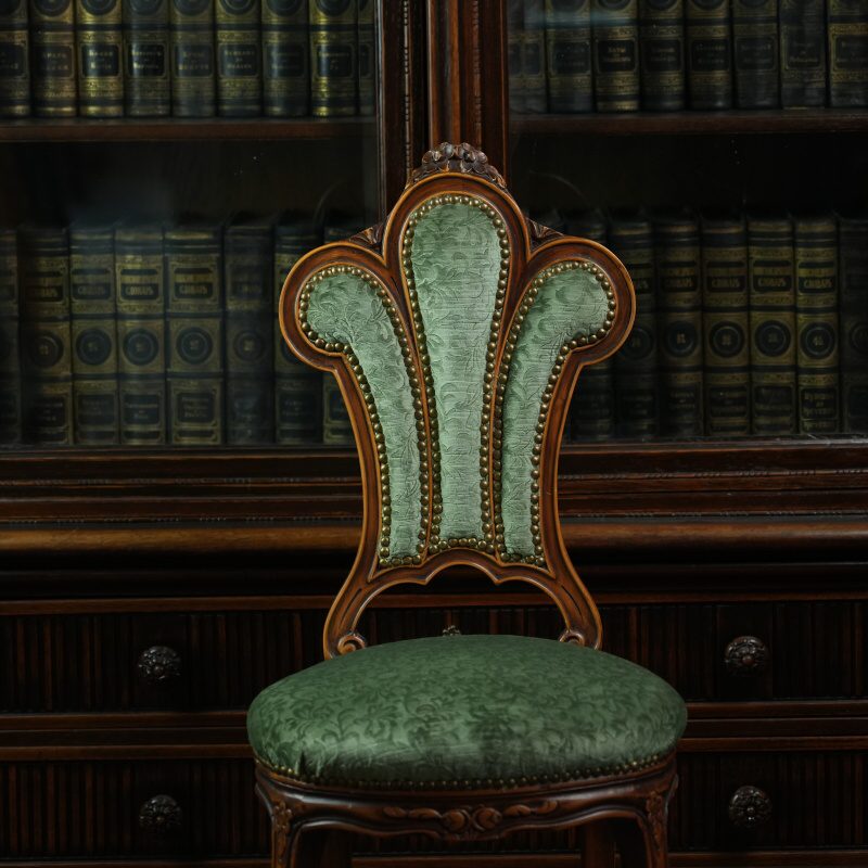 Изогнутые ножки кабриольного типа плавно переходят в резной пояс, где видны элементы цветочного орнамента — свидетельство мастерской ручной работы. Такой стул станет выразительным акцентом в классическом интерьере, библиотеке, кабинете или гостиной, добавляя пространству атмосферу старинного благородства и безупречного вкуса.