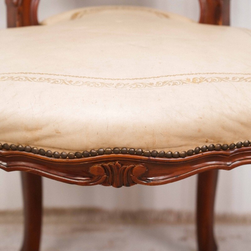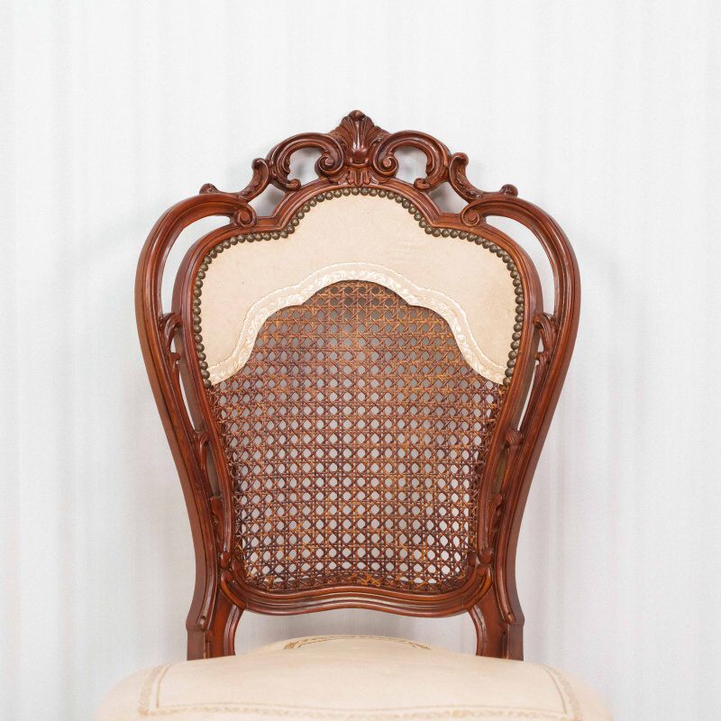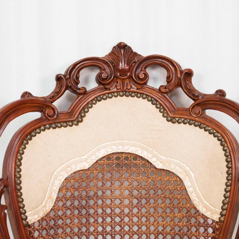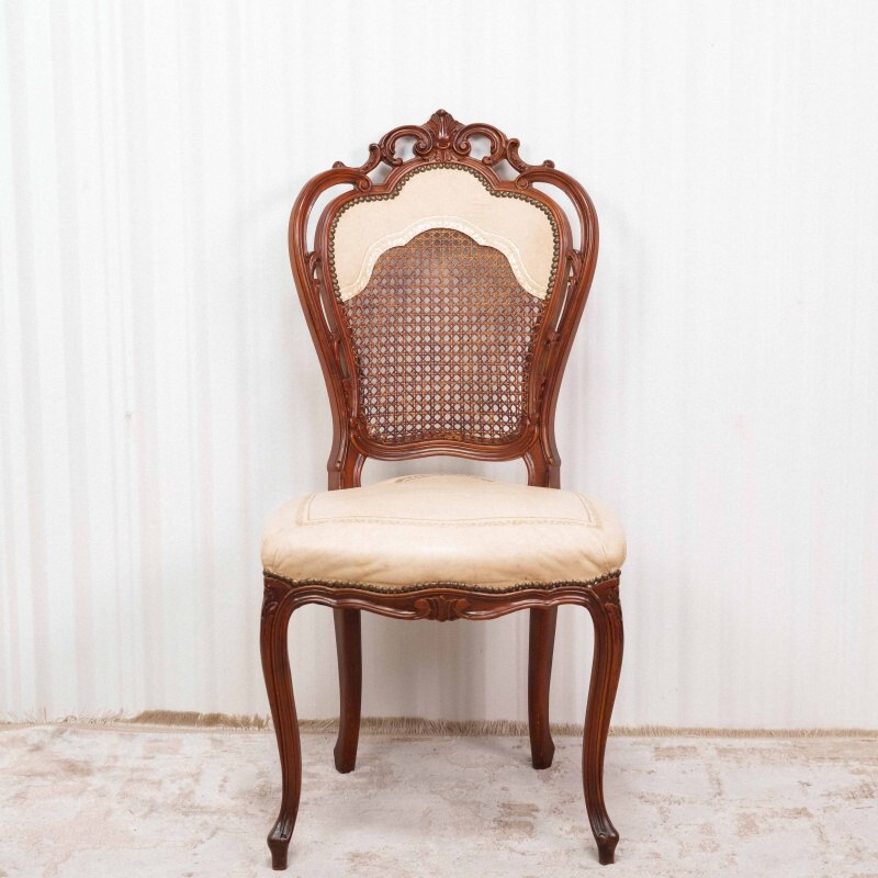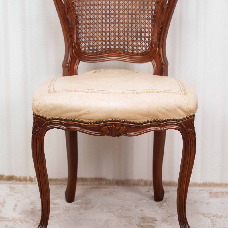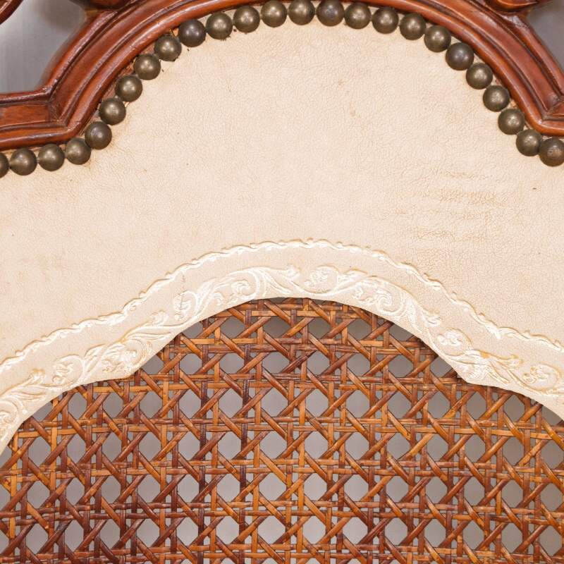 Центральная часть спинки оформлена плетёной тростью, создающей лёгкий, прозрачный эффект и подчёркивающей изящество конструкции. Сиденье мягкое, обито светлой кожей кремового оттенка, что гармонично контрастирует с тёплым тоном древесины и придаёт предмету благородный, элегантный вид.