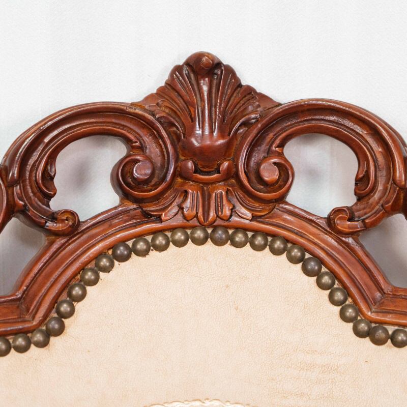 Его высокая фигурная спинка из тёмного резного дерева имеет плавные волнообразные очертания и завершена декоративным навершием с ажурной резьбой.