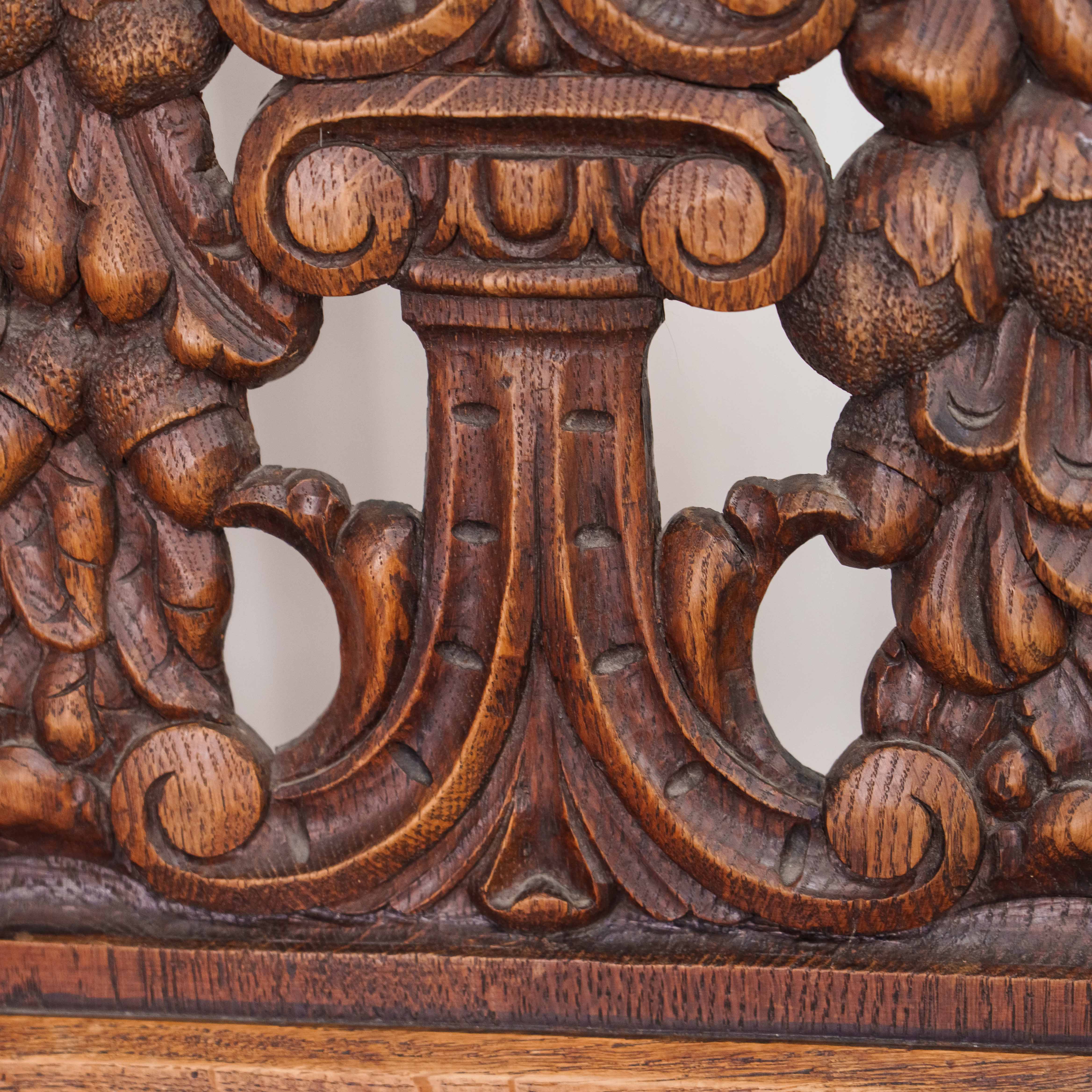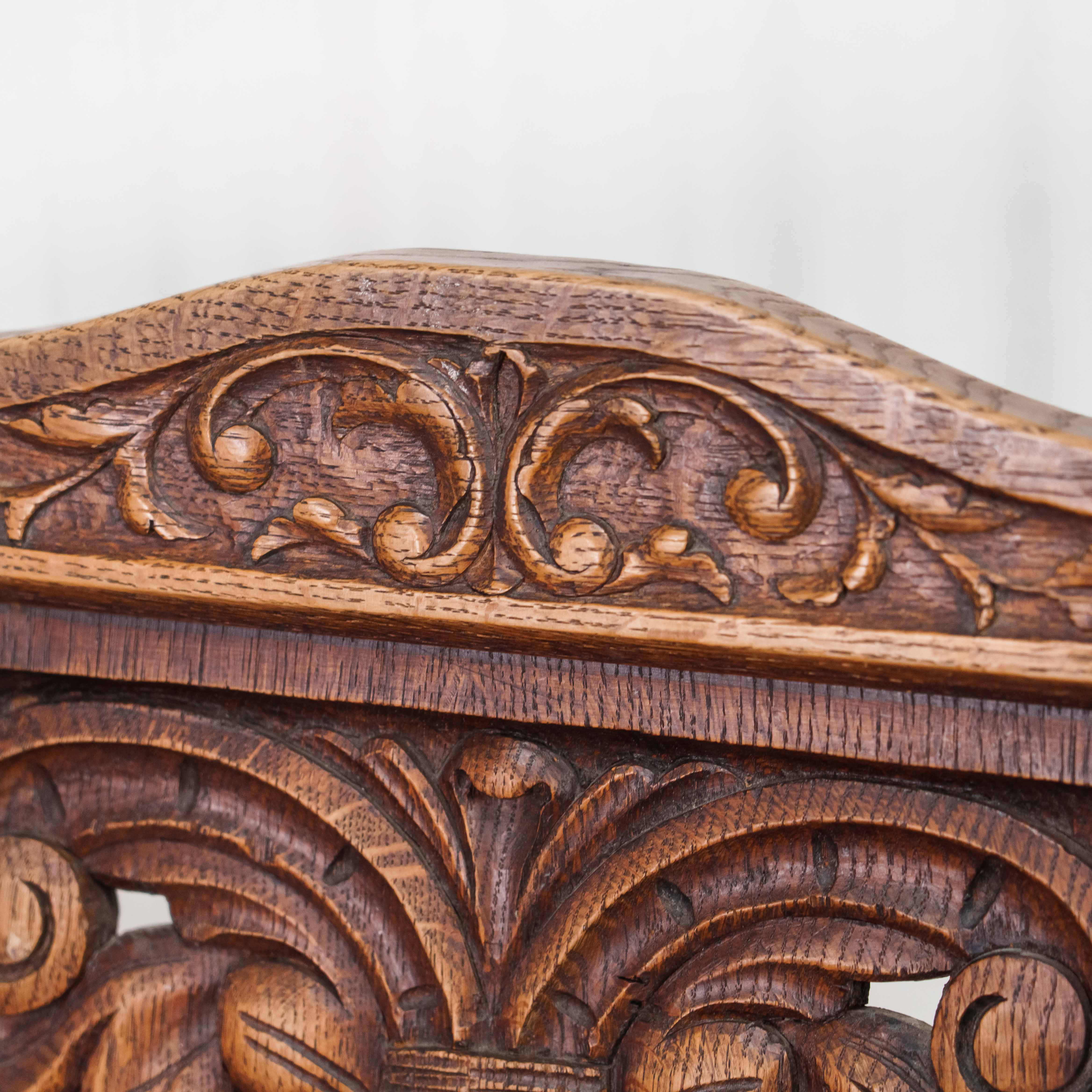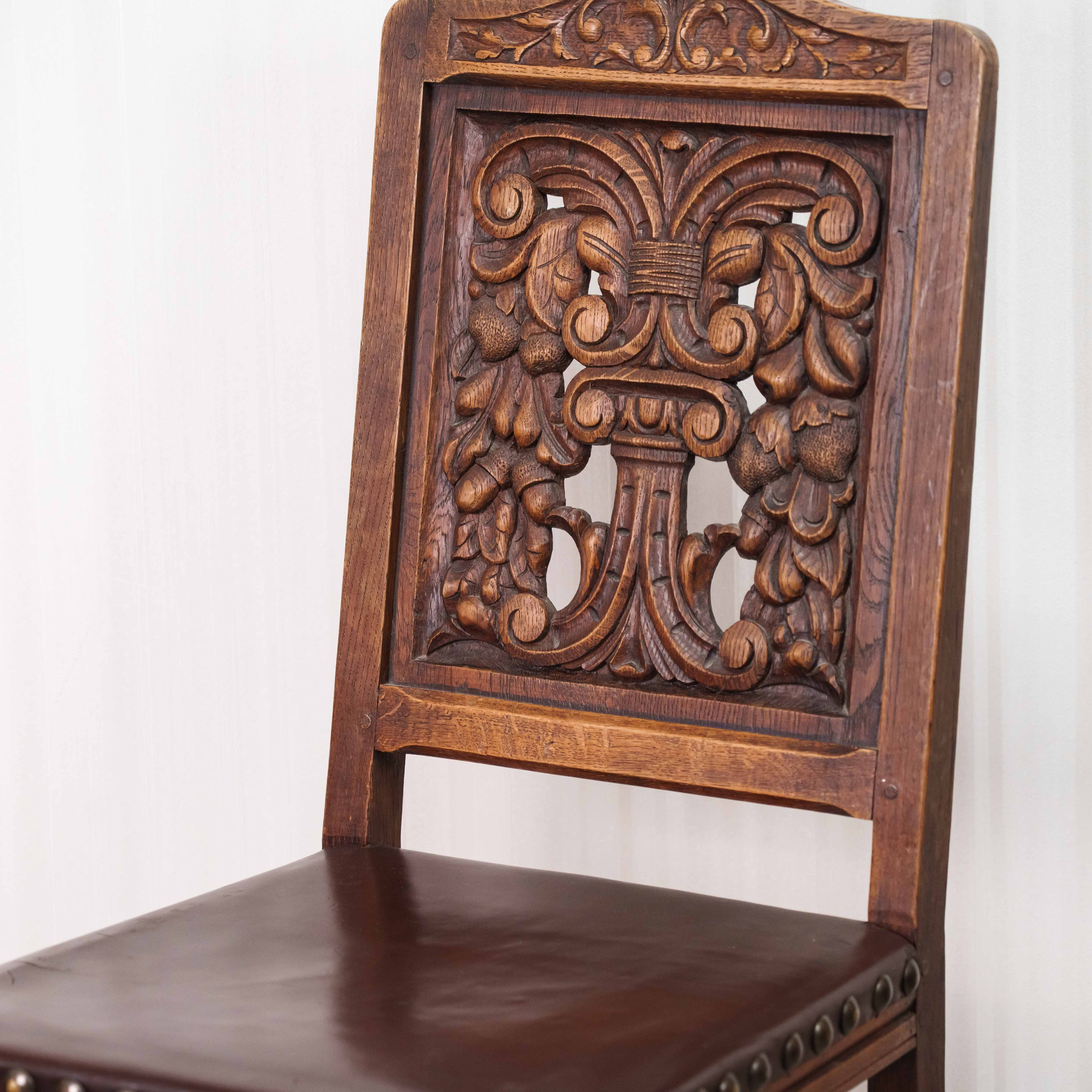 Представленный комплект антикварных стульев выполнен в бретонском стиле и представляет собой выразительный образец региональной французской мебели, восходящей к традициям Бретани конца XIX — начала XX века. В набор входит три массивных стула из цельного массива тёмного дуба, отличающиеся строгими пропорциями и подчеркнутой архитектурностью форм. Высокие прямоугольные спинки украшены глубокой рельефной резьбой с характерными для бретонского стиля симметричными растительными и геральдическими мотивами, отсылающими к народной символике и средневековым орнаментам региона. Сиденья деревянные, обрамлены рядом декоративных кованых или деревянных гвоздиков, усиливающих аутентичный, слегка суровый характер мебели. Ножки точёные, мощные, соединённые проножками, что придаёт конструкции устойчивость и подчёркивает её утилитарное происхождение. Поверхность дерева имеет тёплую, насыщенную патину, свидетельствующую о возрасте предметов и многолетнем использовании. В целом комплект производит впечатление солидности и основательности, идеально подходя для интерьеров в стиле кантри, рустик, шато или исторических интерьеров, а также для коллекционеров региональной французской антикварной мебели.
