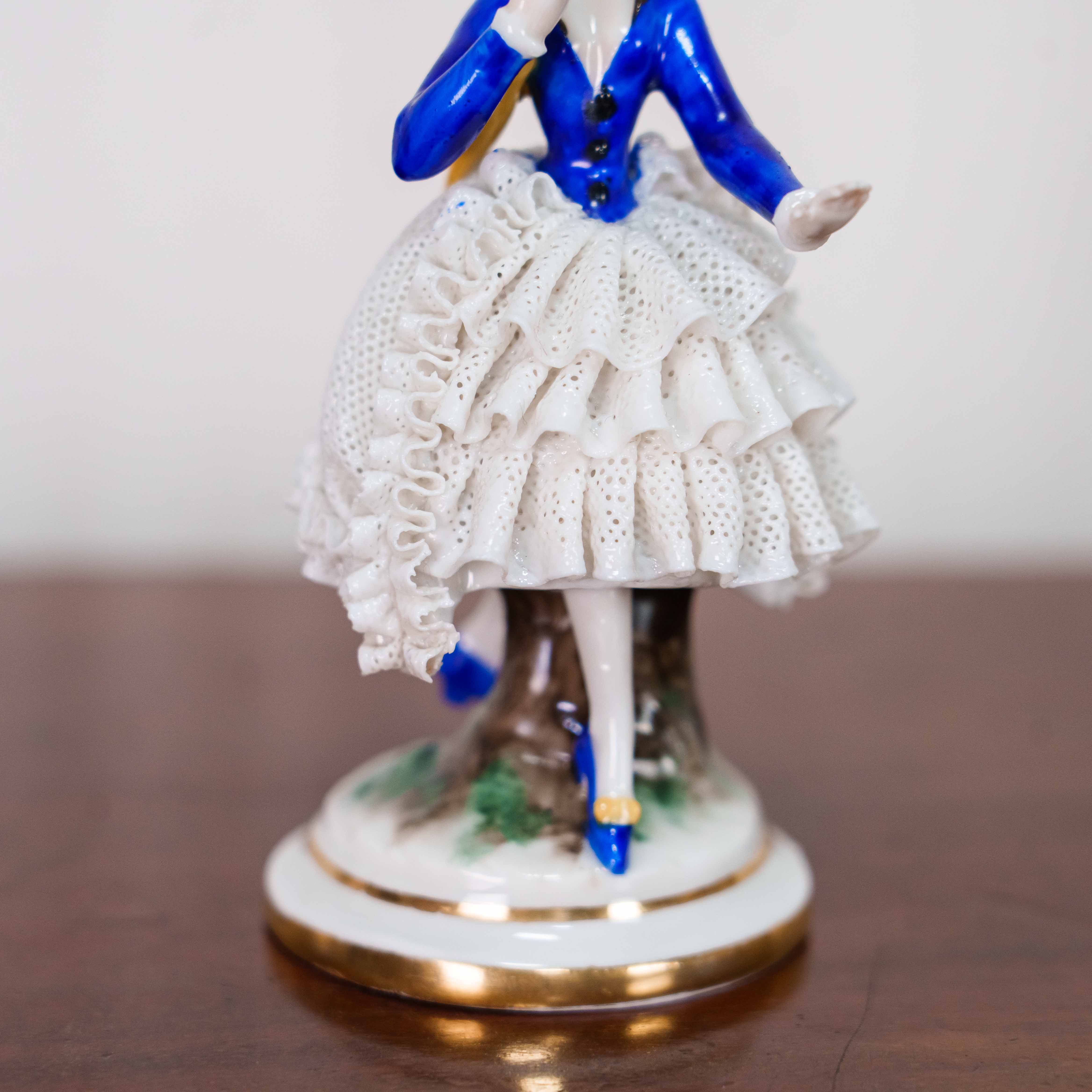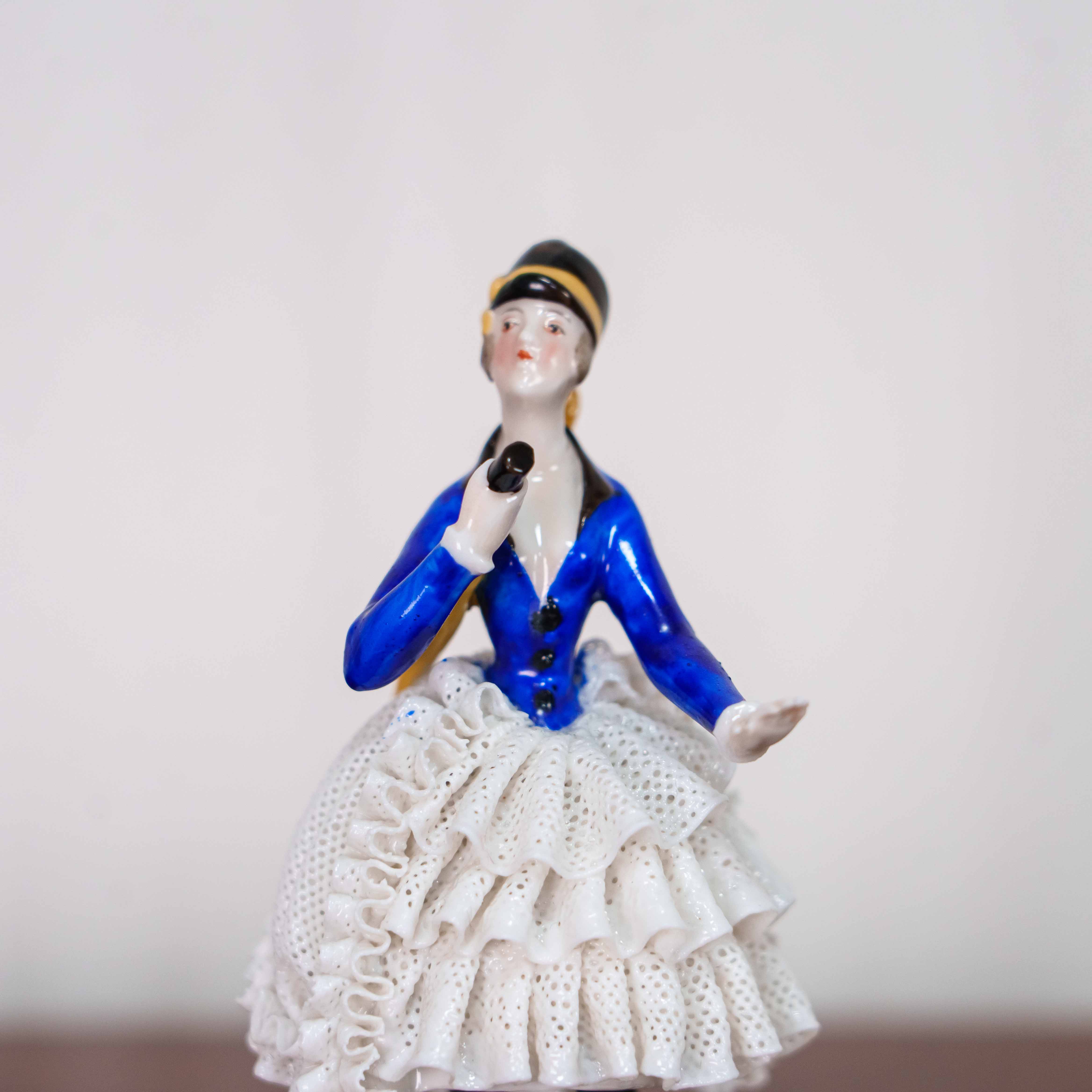 Фарфоровая статуэтка изображает изящную женскую фигуру в элегантном костюме конца XIX – начала XX века, выполненную в традициях немецкого художественного фарфора. Дама представлена в лёгкой, динамичной позе, словно запечатлённой во время прогулки или светского выхода. В её руках — сложенный зонтик, изящный аксессуар, подчёркивающий утончённость образа и принадлежность к городской культуре эпохи. Особое внимание привлекает тщательно проработанная многослойная юбка с ажурной фактурой, покрытая белоснежной глазурью, а также насыщенный кобальтово-синий жакет с аккуратными золотыми акцентами. Детали костюма, обуви и прически выполнены с высокой степенью мастерства, что характерно для продукции мануфактуры Ernst Bohne & Sohne, известной своими жанровыми и интерьерными фарфоровыми фигурами.