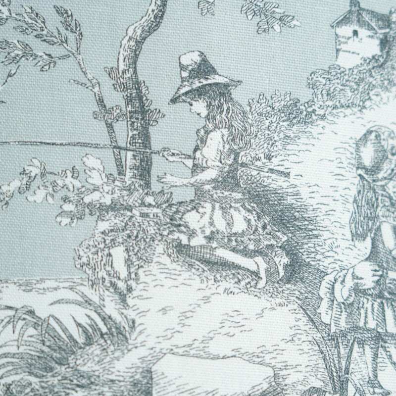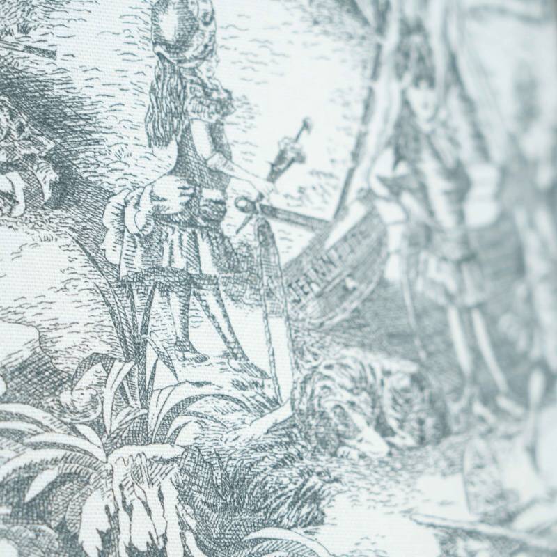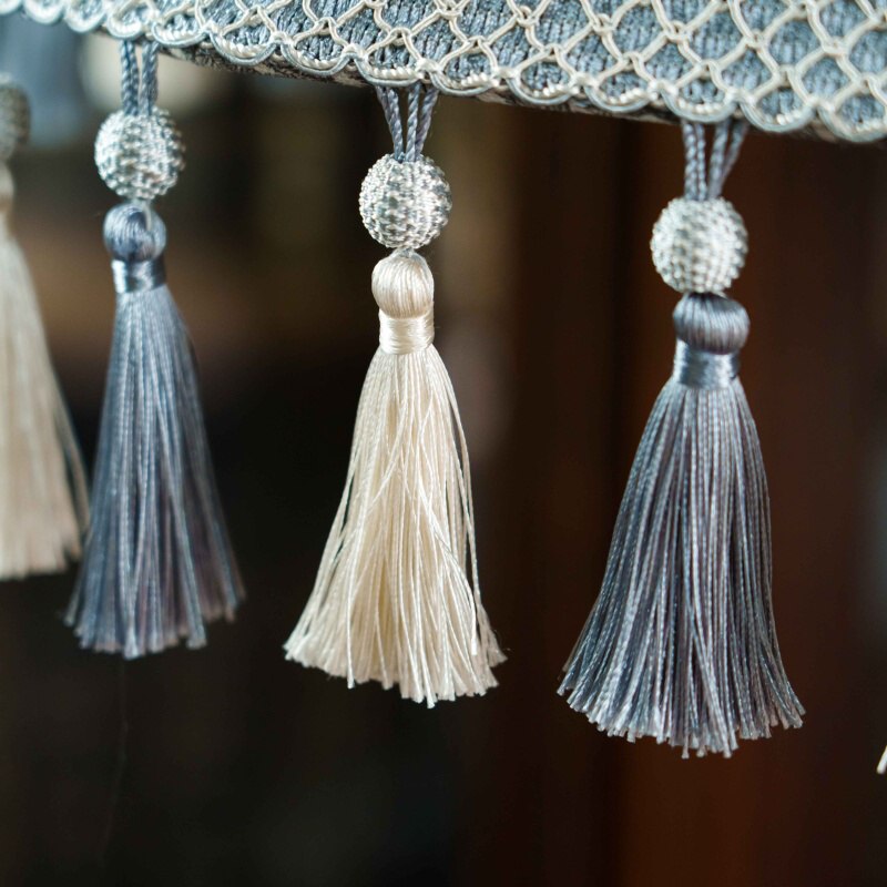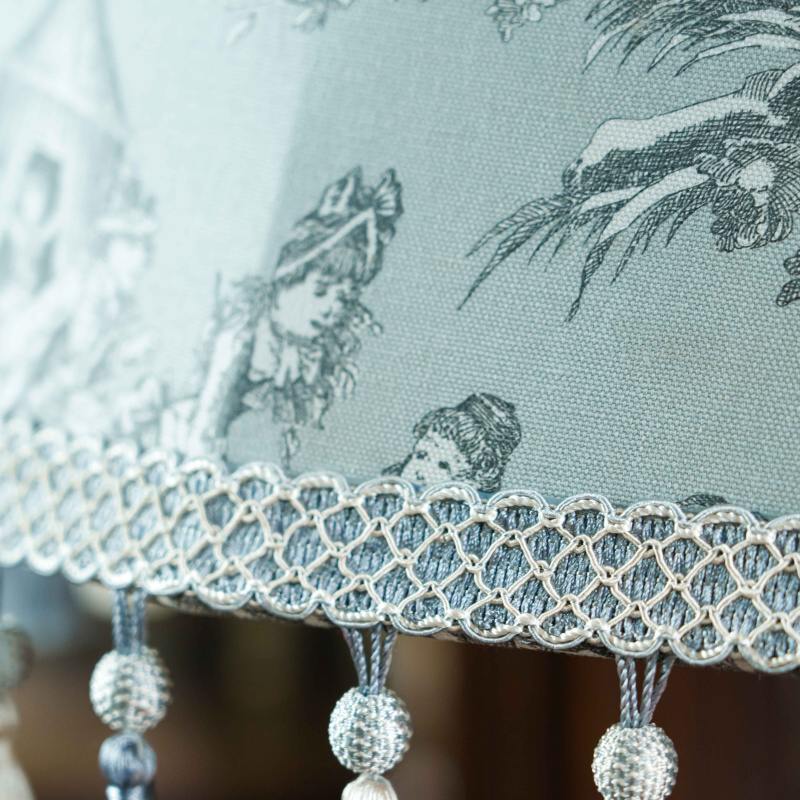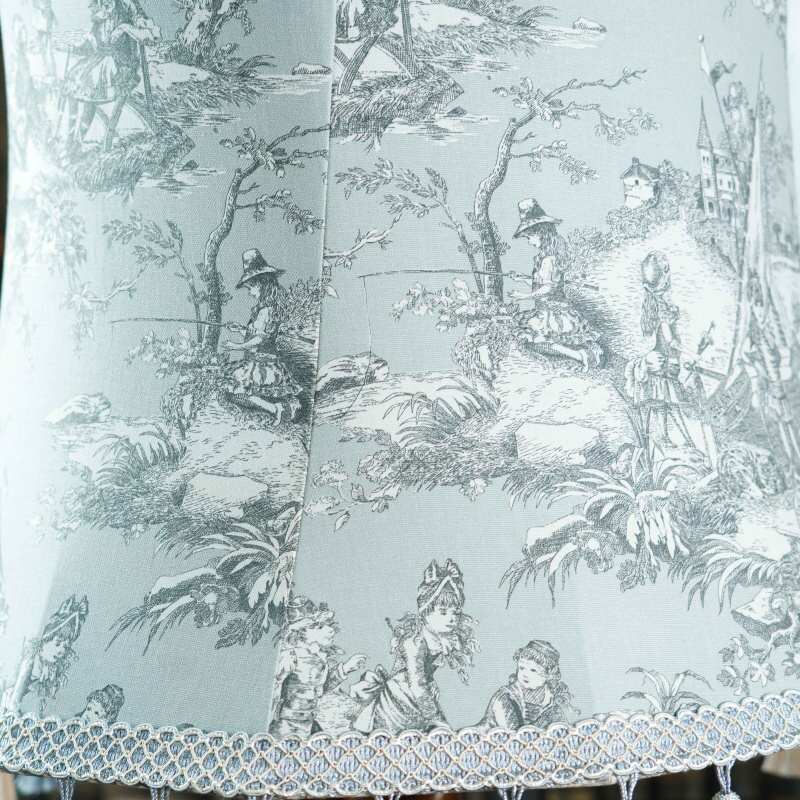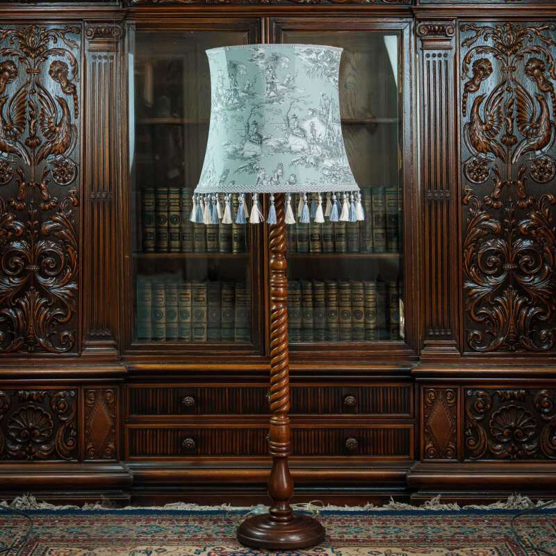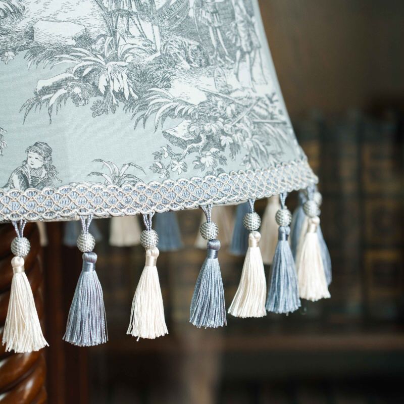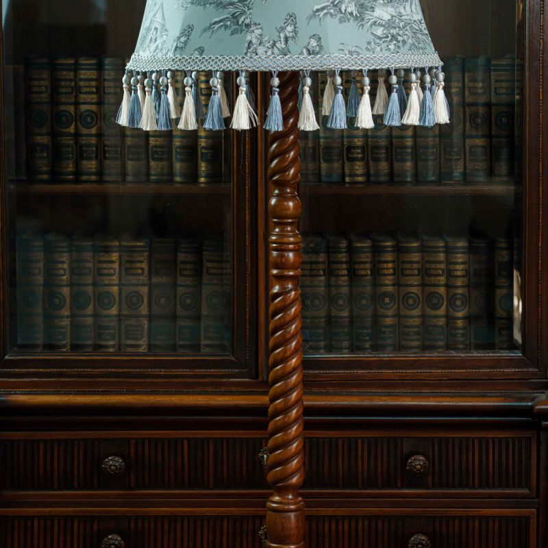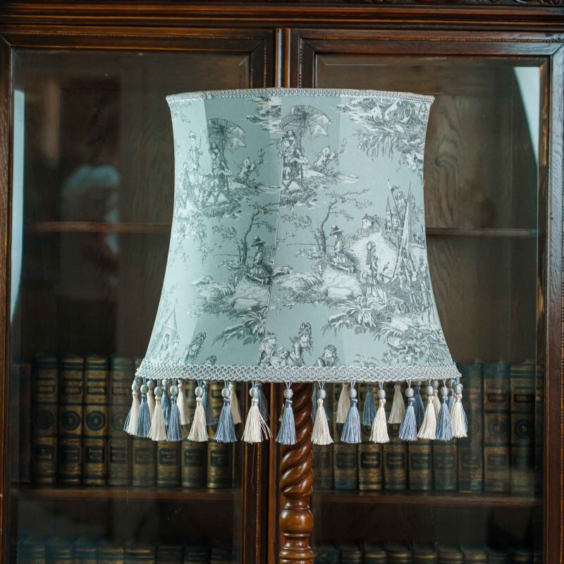 Текстильный абажур с узором в стиле toile de Jouy и кисточками по нижнему краю придаёт светильнику особую изюминку и винтажное очарование. Свет, проходя через плотную ткань, становится мягким и приглушённым — идеальным для создания уюта в библиотеке, гостиной или кабинете.