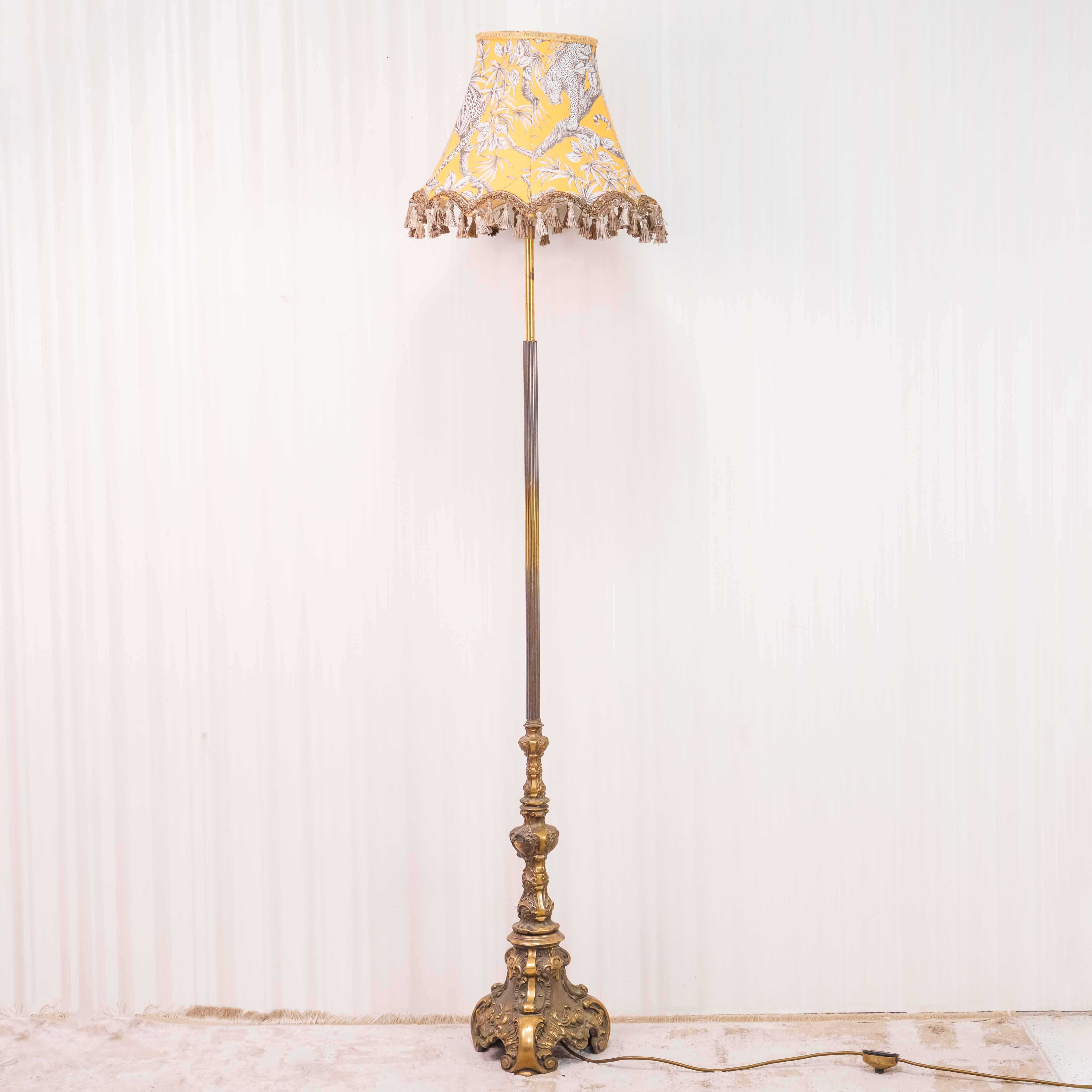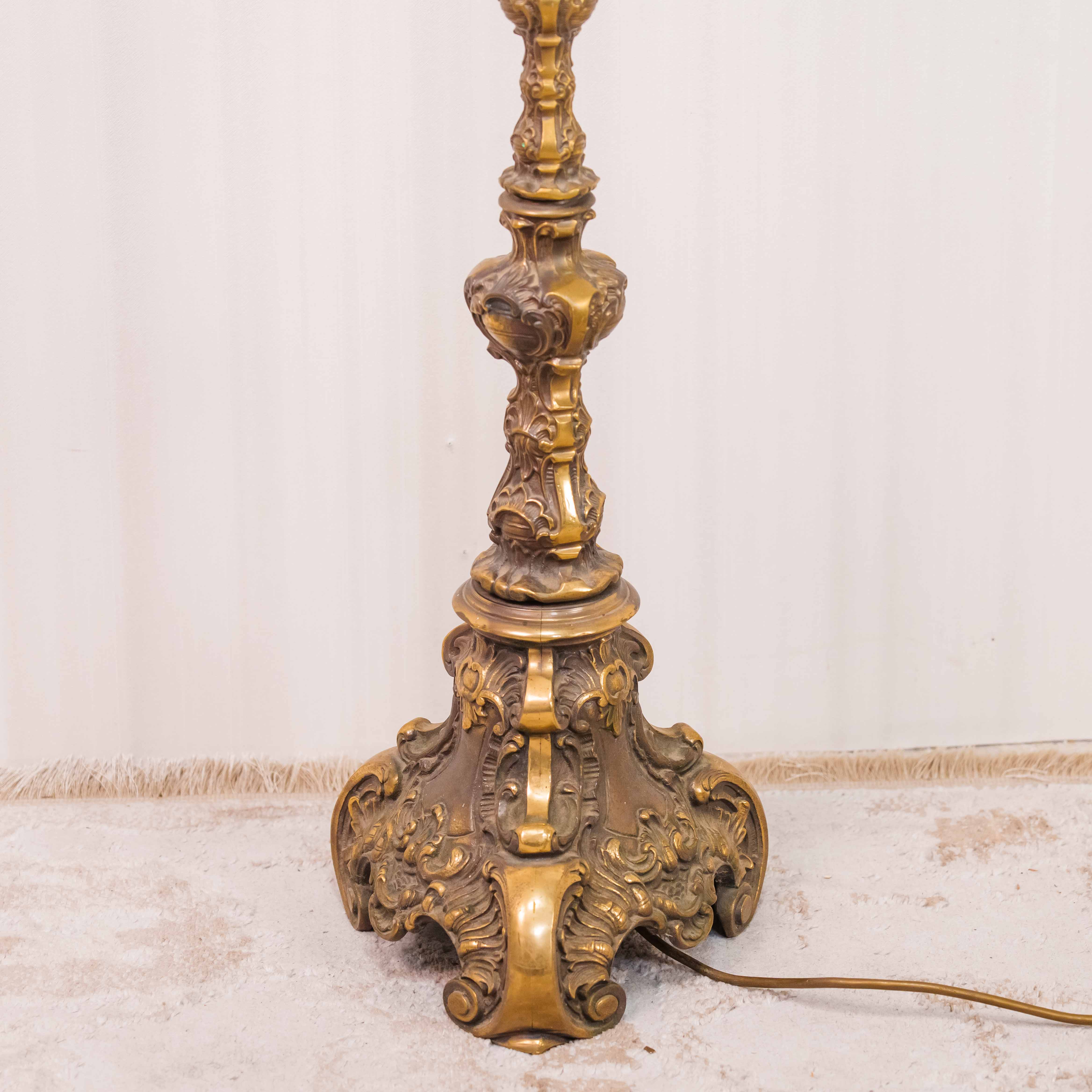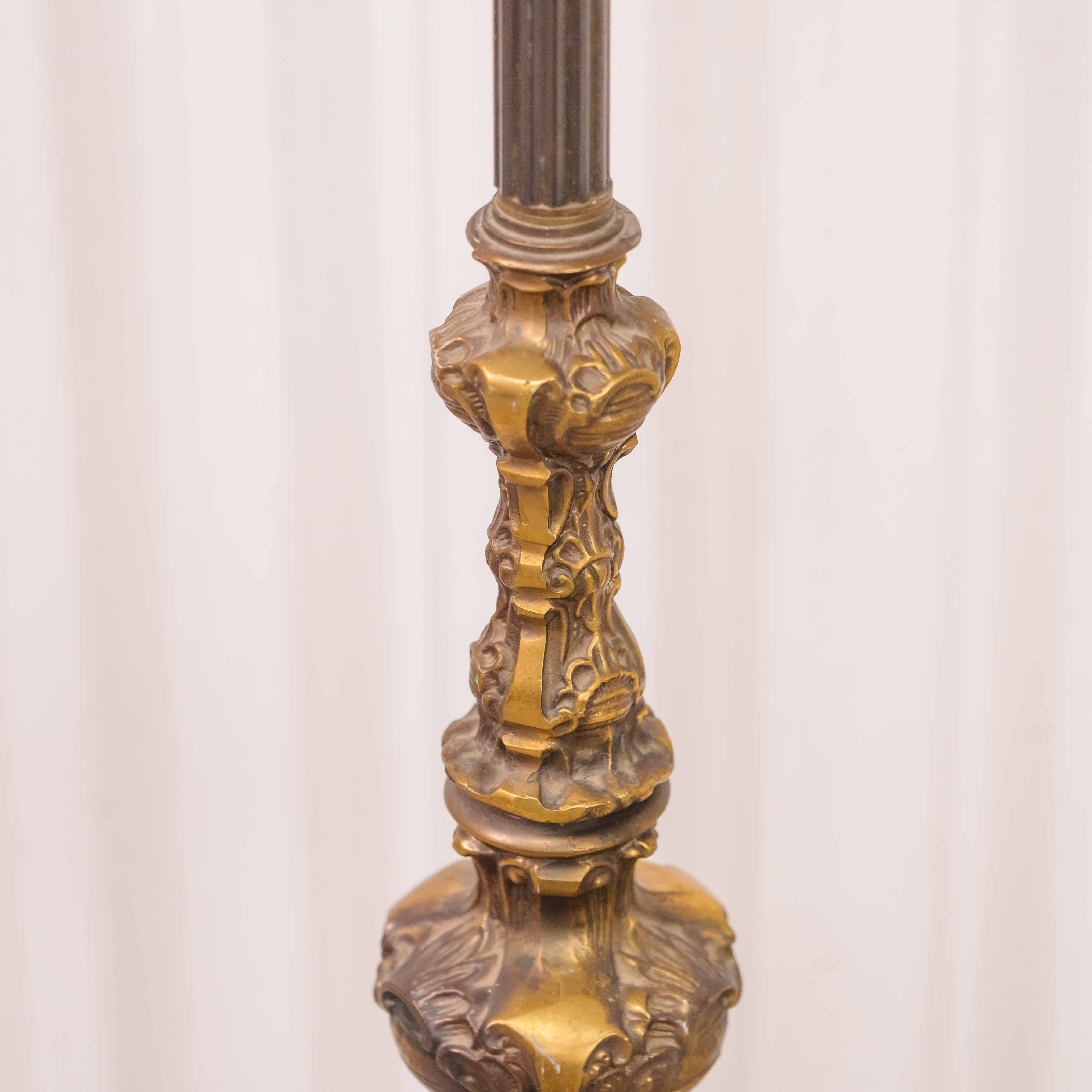 Элегантный напольный торшер, выполненный из бронзы и латуни, относится к традициям декоративного освещения Европы первой половины–середины XX века. Основание отличается выразительным литым декором с плавными переходами форм и характерной для того периода массивностью, что придаёт предмету солидный и статусный вид. Вертикальная стойка гармонично уравновешивает композицию, подчёркивая стройный силуэт светильника.