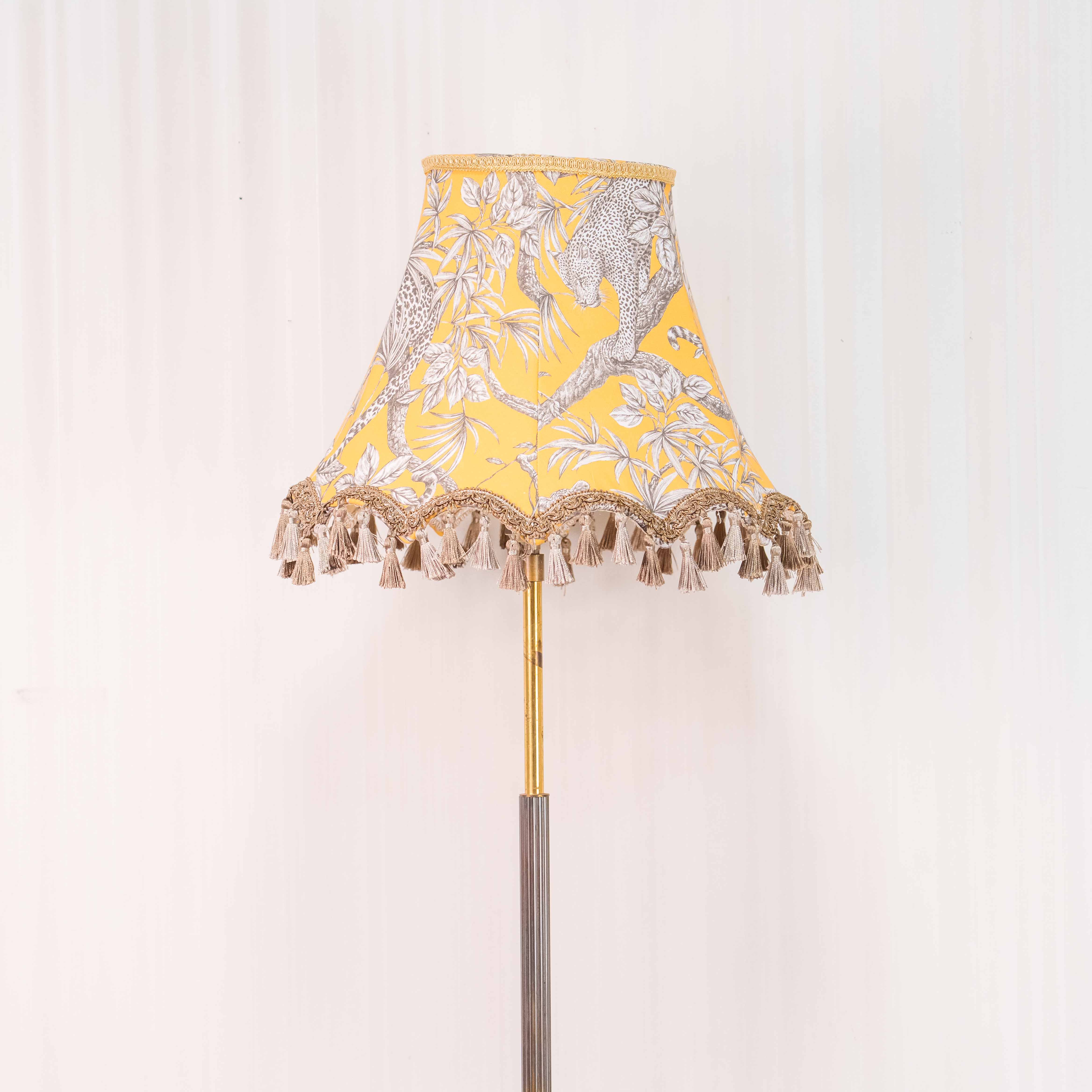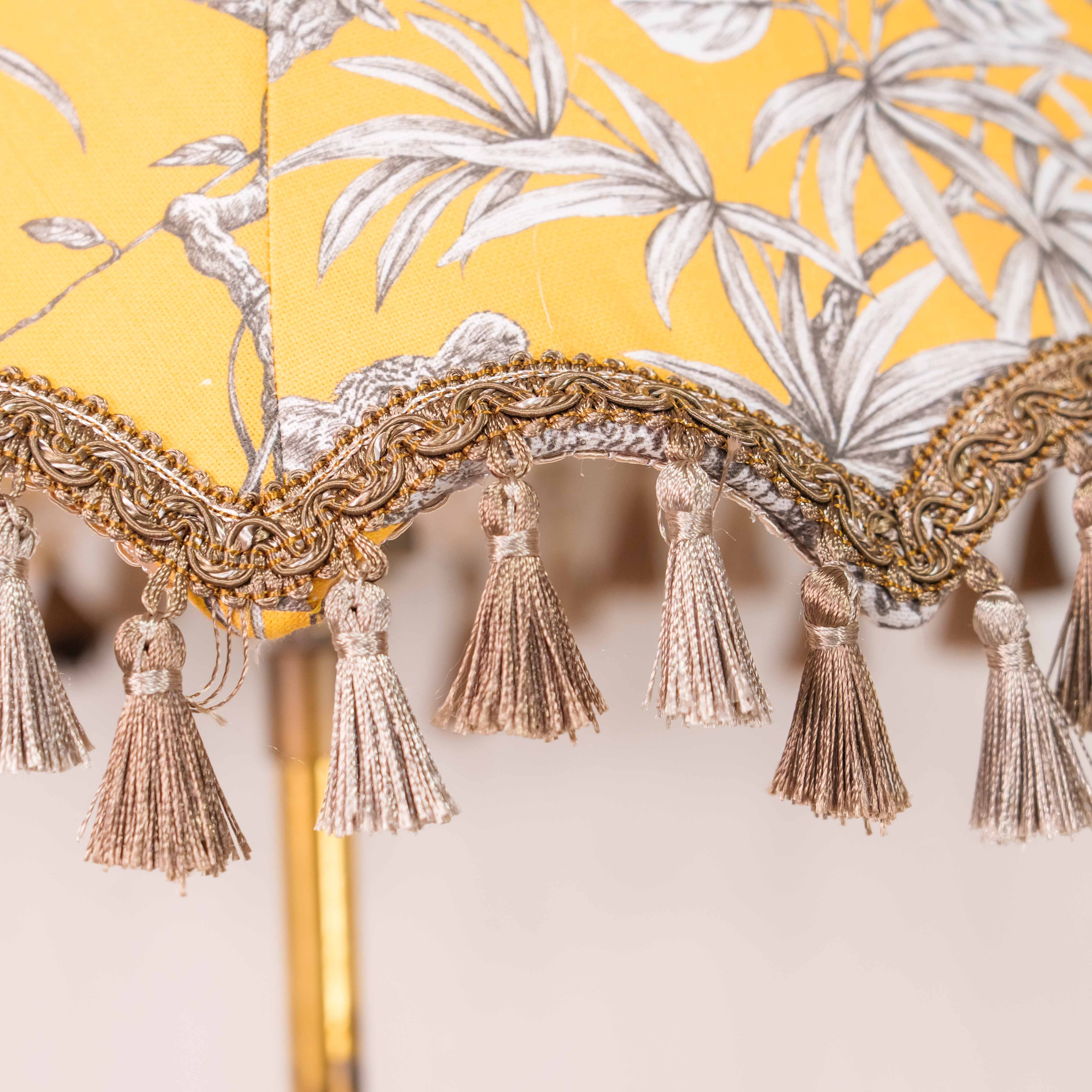 Абажур классической формы украшен текстильным орнаментом с бахромой, создаёт мягкий, рассеянный свет и формирует уютную, камерную атмосферу в интерьере. Такая лампа станет эффектным акцентом в гостиной, кабинете или спальне, прекрасно дополняя интерьеры в стиле классика, неоклассика или ар-деко.