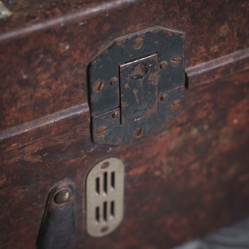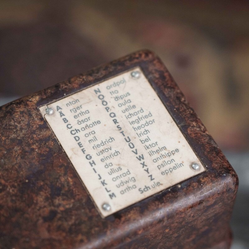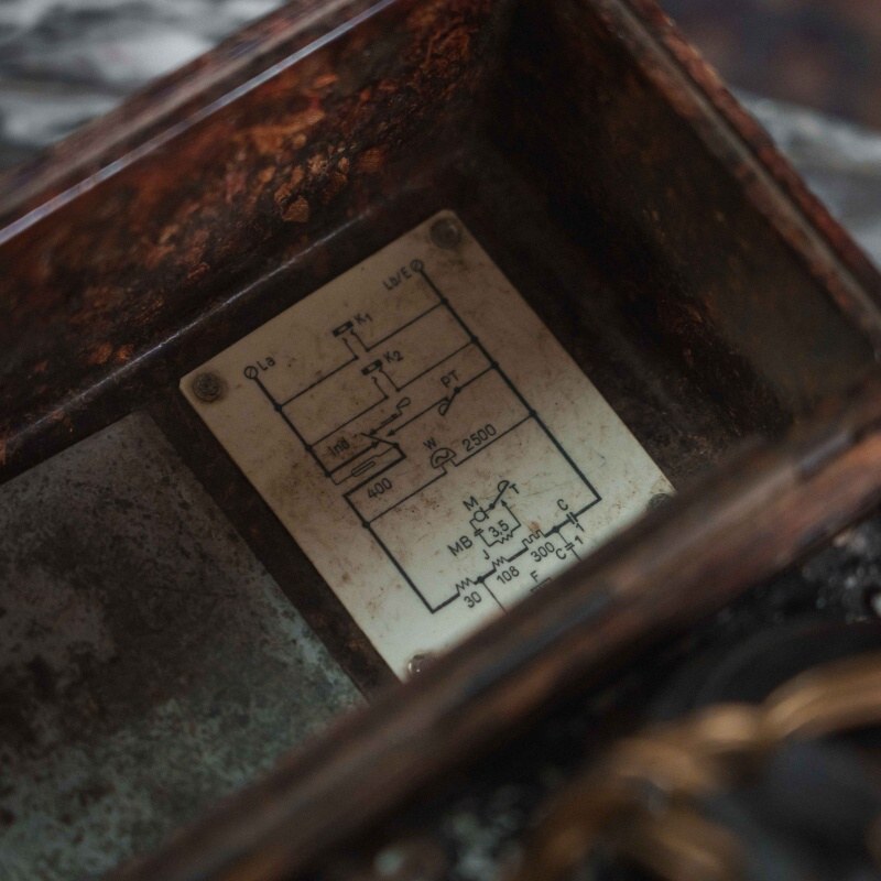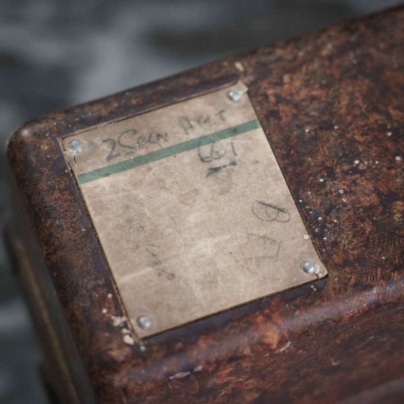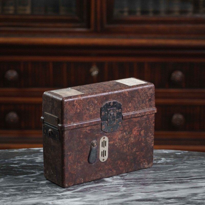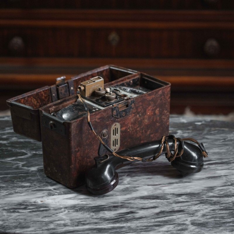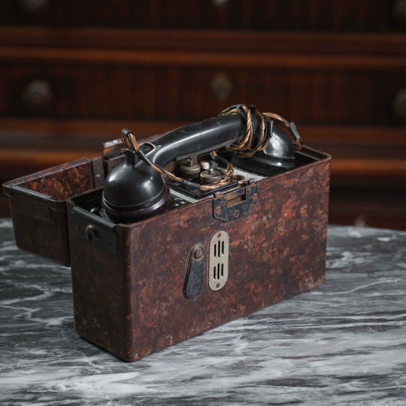 Переносной телефонный аппарат военного времени, выполненный в корпусе из прочного прессованного материала тёмно-коричневого цвета с характерным мраморным узором.