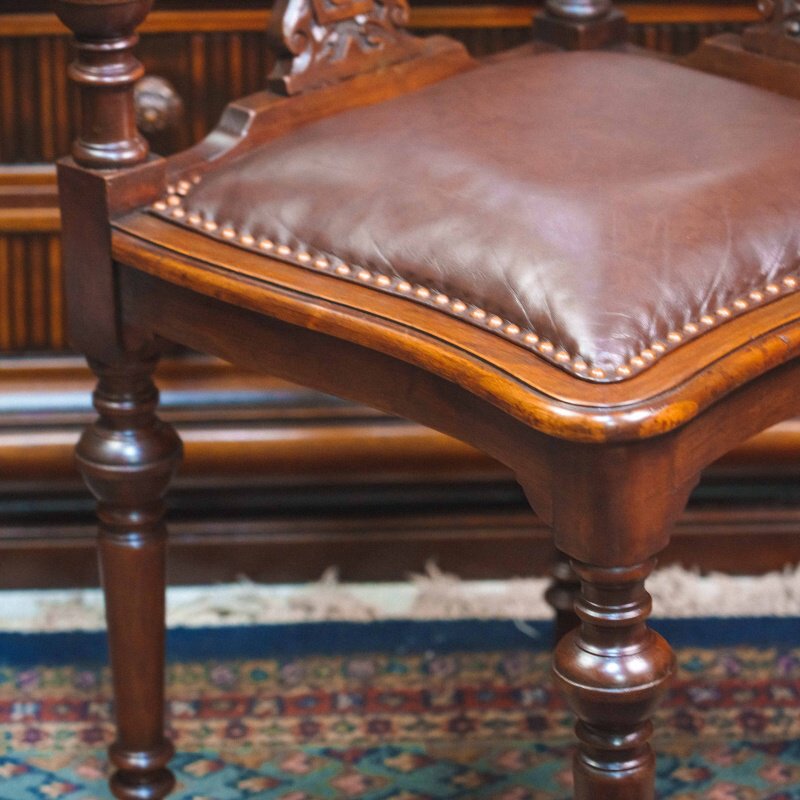 Сиденье выполнено из качественной кожи глубокого тёплого оттенка, украшено декоративными металлическими шляпками-гвоздиками по периметру. Кожа хорошо натянута, мягкая и удобная, а её благородная патина подчёркивает возраст предмета.