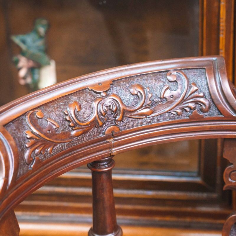 Элегантный антикварный стул, выполненный из тёмного благородного дерева и украшенный тонкой ручной резьбой. Стул имеет характерную округлую форму спинки с декоративными элементами, вдохновлёнными классическими европейскими мотивами. На верхней перекладине и боковых спинках расположены изящные резные орнаменты, подчёркивающие мастерство резчика.