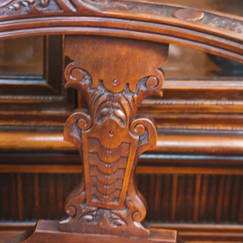 Массивные точёные стойки придают конструкции выразительность и устойчивость. Спинка оформлена двухчастной резьбой, напоминающей стилизованные щитки или гербовые элементы — деталь, часто встречающаяся в мебели конца XIX – начала XX века.