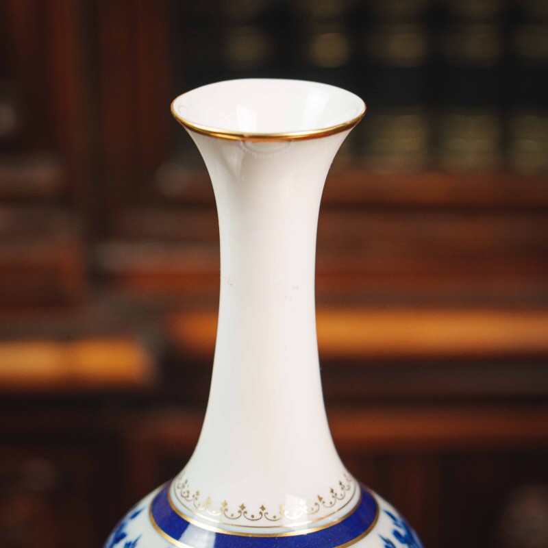 Ваза является образцом классического европейского фарфора, производства немецкой мануфактуры Rosenthal (KPM Bavaria). Высококачественный белый твердый фарфор. Выполнена в технике «Echt Cobalt». Характерно сочетание глубокого темно-синего рисунка на белоснежном фоне с использованием золотой отводки по горлышку и основанию. Роспись и декор наносились золотом 24 карат, вручную.