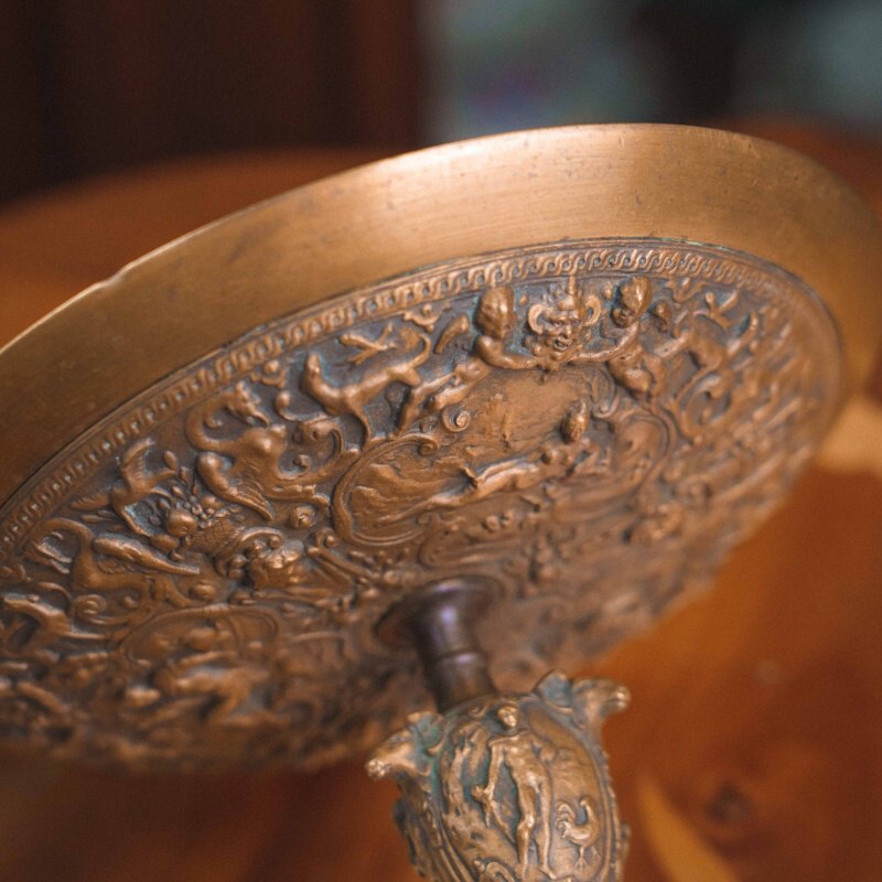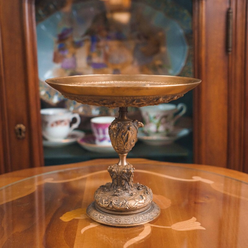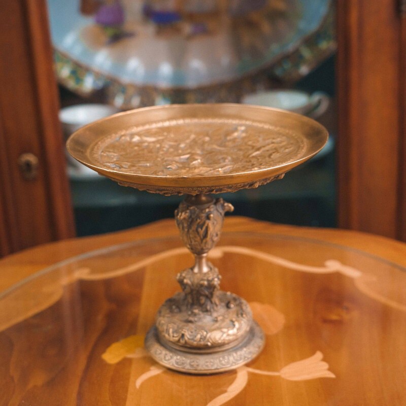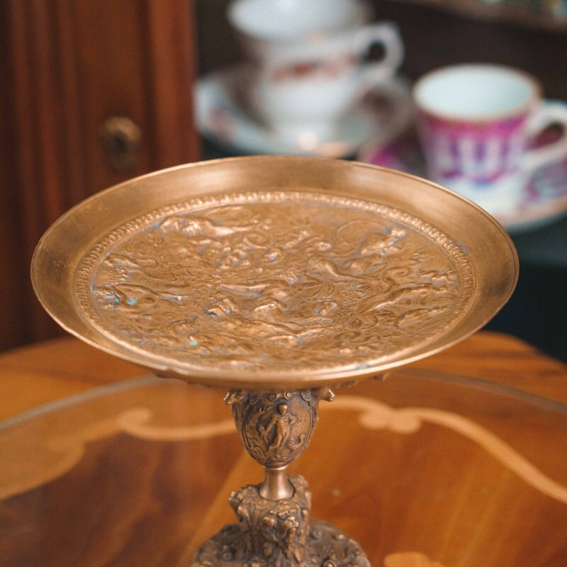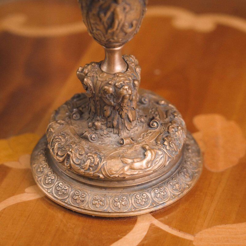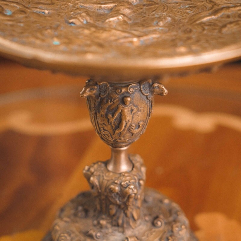 Ваза в форме классической таццы — декоративной чаши на высокой ножке, вдохновленная традициями итальянского Ренессанса. Центральную часть украшает богатый рельеф с мифологическим сюжетом. Композиция построена по принципу ренессансных медальонов и рельефных плакеток, где внимание сосредоточено на пластике человеческого тела и сложном ритме фигур. Широкий гладкий борт подчеркивает центральный сюжет и придает предмету благородную уравновешенность. Ножка и основание вазы богато декорированы растительным орнаментом, маскаронами и классическими завитками. Теплая естественная патина бронзы усиливает глубину рельефа, подчеркивая игру света и тени на поверхности металла.