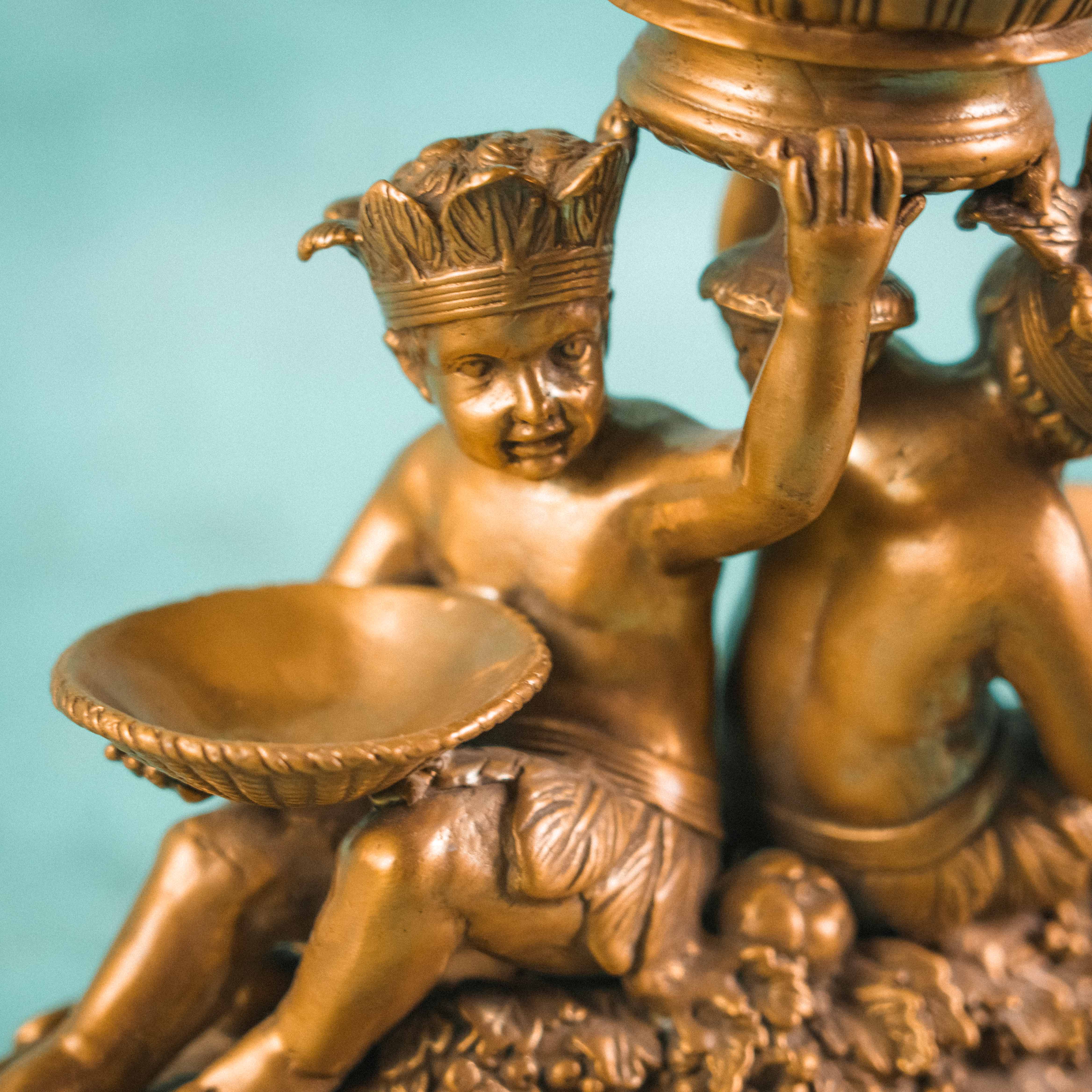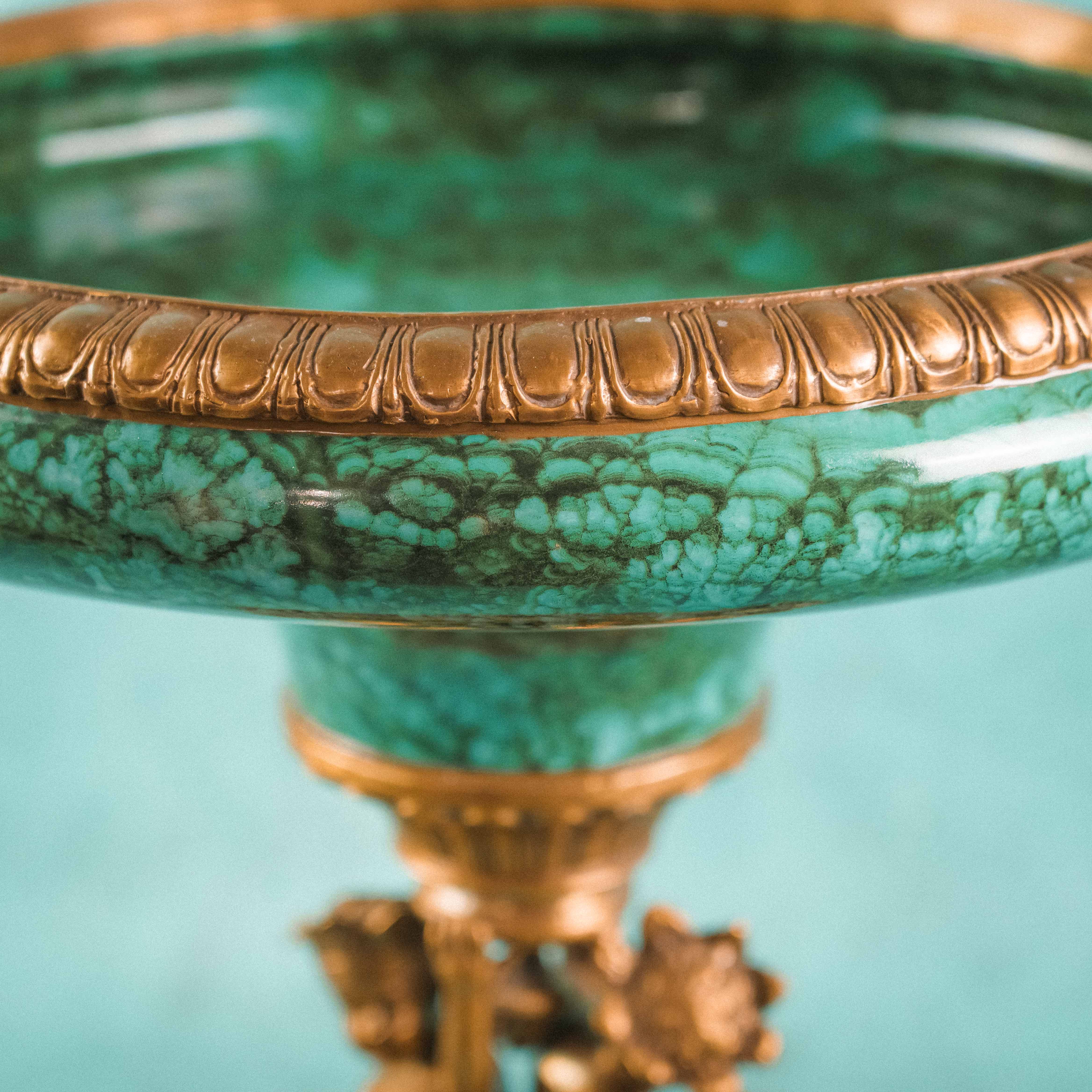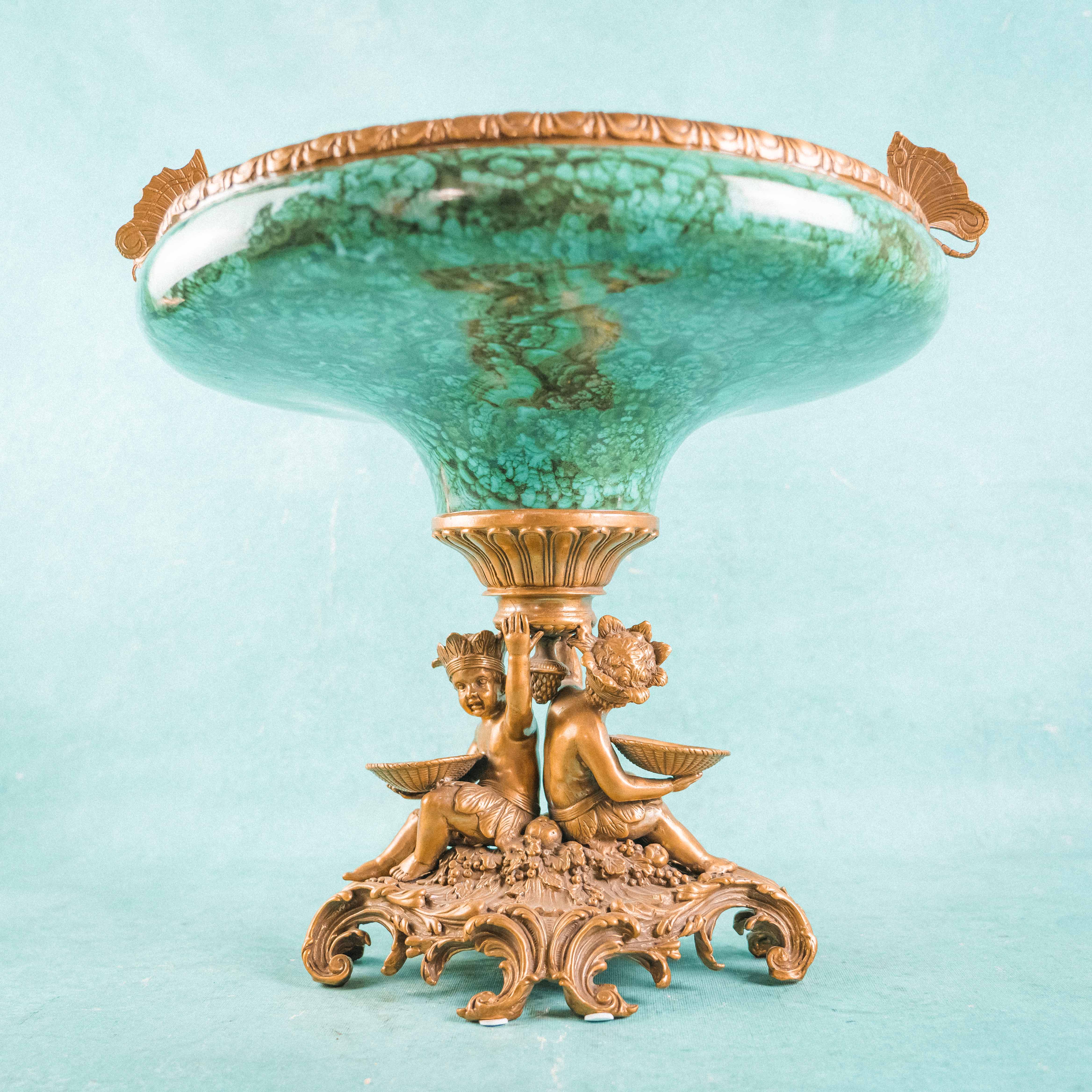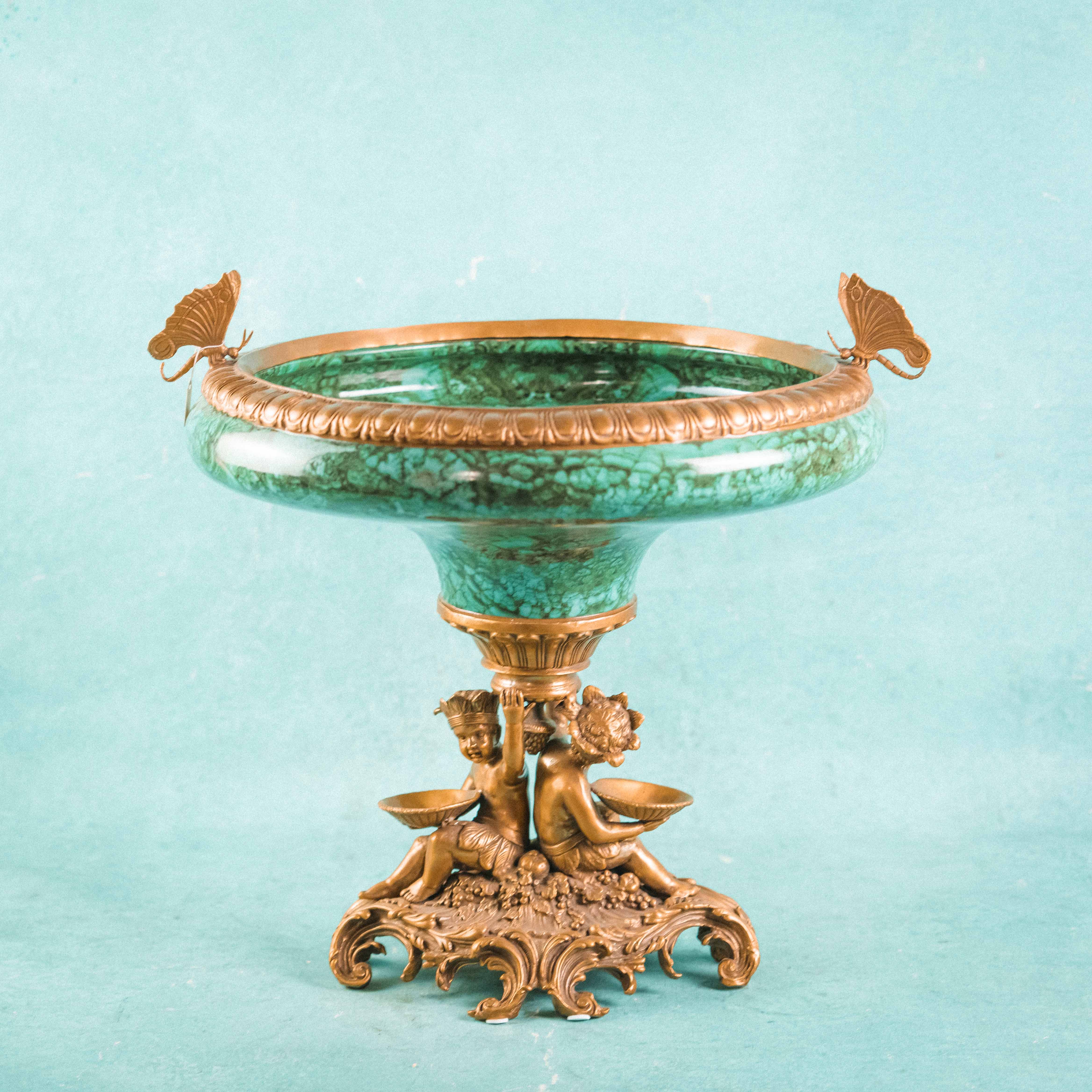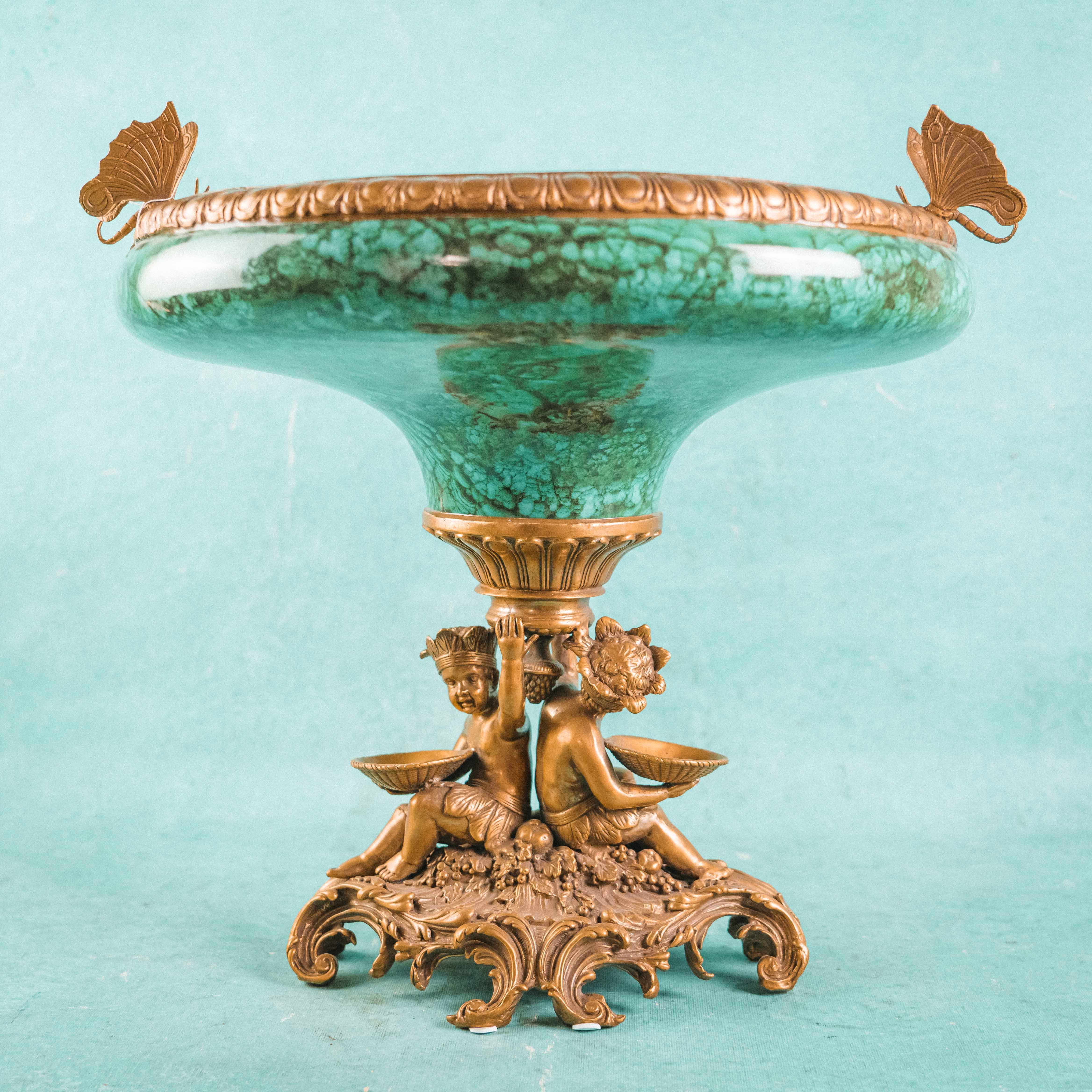 Роскошная декоративная ваза-чаша в духе французской дворцовой эпохи XIX века. Чаша выполнена из эффектного фарфора с мраморным зелёным рисунком, напоминающим натуральный камень, и обрамлена изящным позолоченным бронзовым венцом. Особую выразительность композиции придаёт бронзовое основание, украшенное фигурами путти — аллегорическими персонажами изобилия и плодородия, держащими чаши с плодами. Сочетание благородства фарфора и тёплого блеска бронзы создаёт яркий декоративный контраст. Тщательная проработка деталей, живая пластика фигур и богатый орнамент основания подчёркивают высокий уровень мастерства и делают предмет акцентным элементом интерьера.