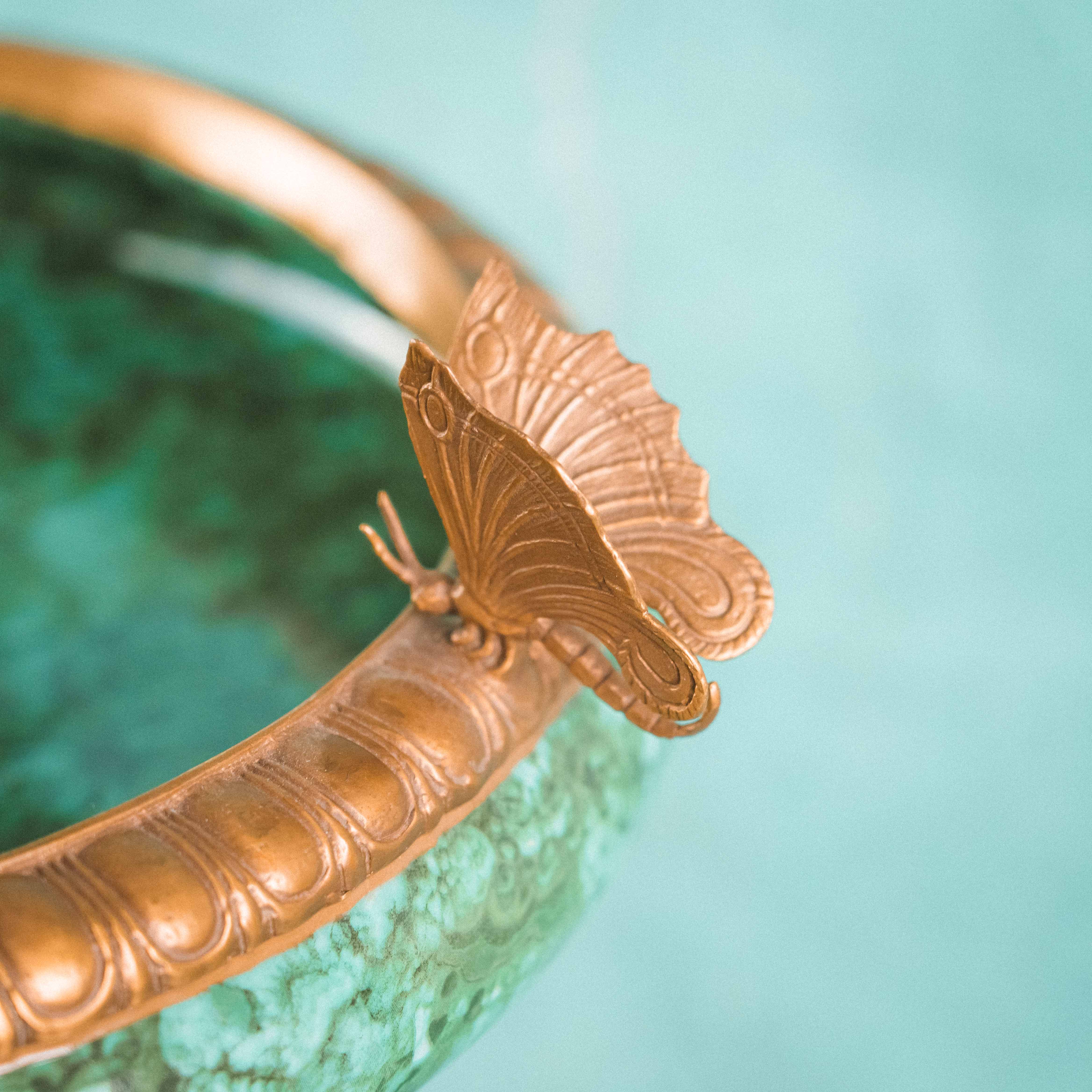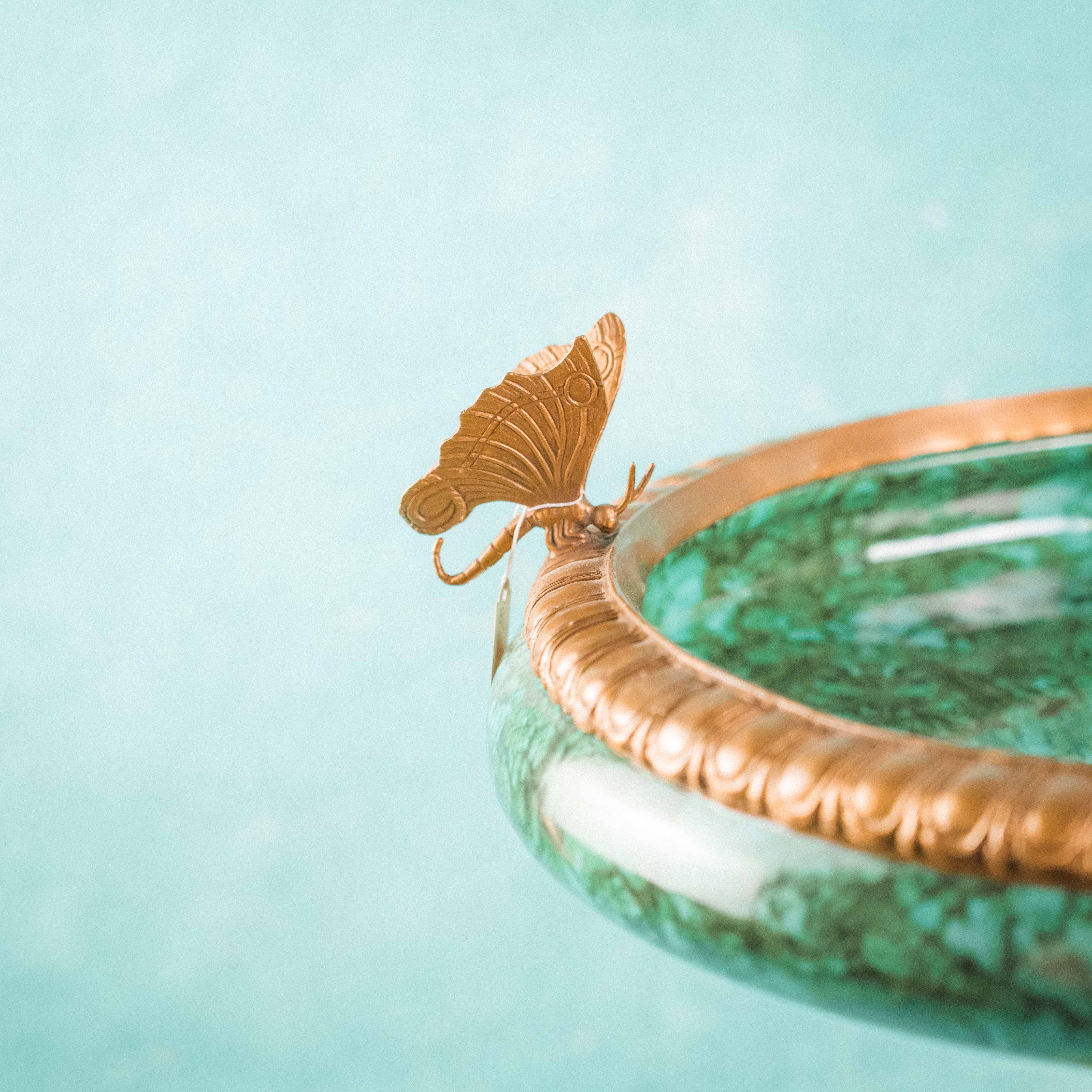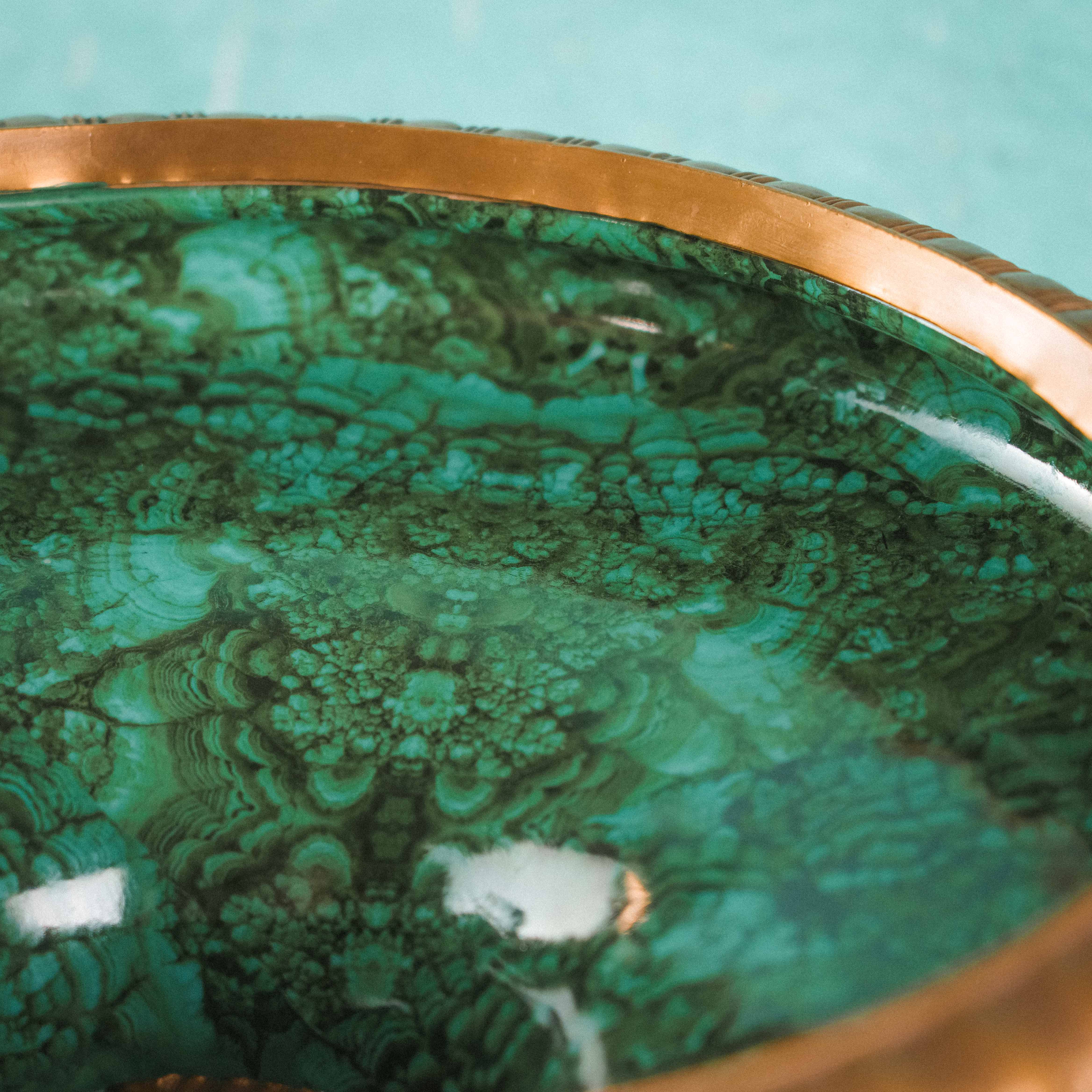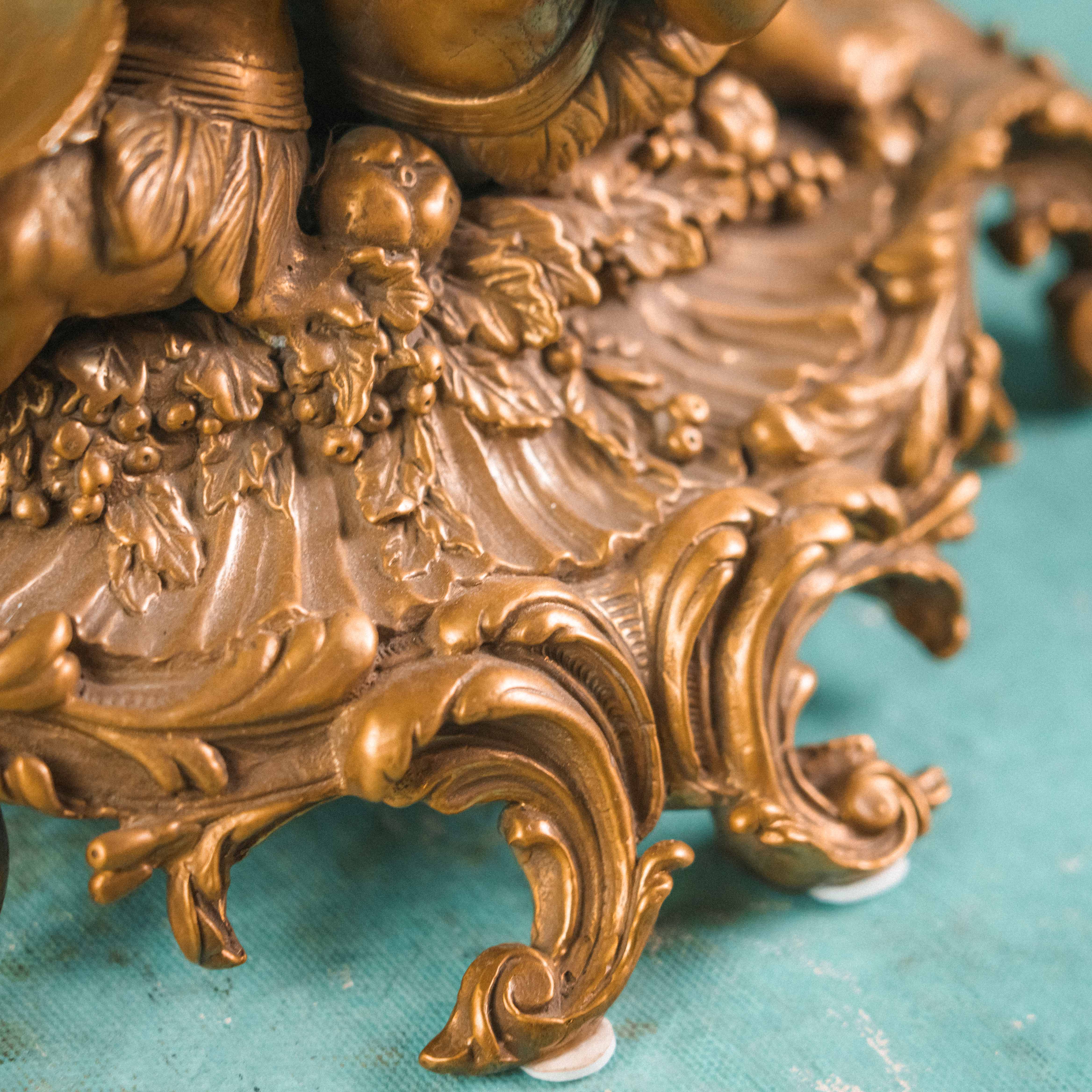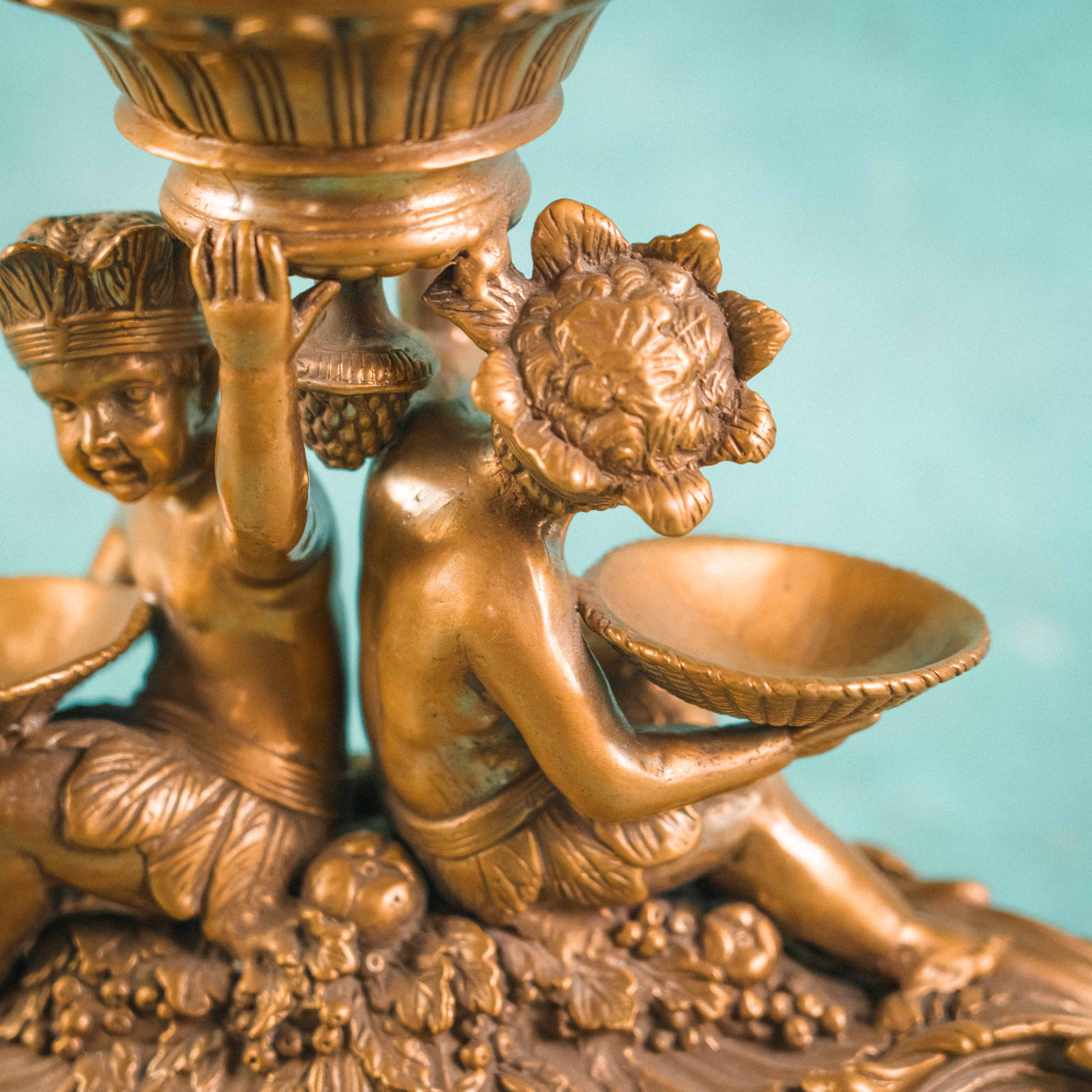 Роскошная декоративная ваза-чаша в духе французской дворцовой эпохи XIX века. Чаша выполнена из эффектного фарфора с мраморным зелёным рисунком, напоминающим натуральный камень, и обрамлена изящным позолоченным бронзовым венцом. Особую выразительность композиции придаёт бронзовое основание, украшенное фигурами путти — аллегорическими персонажами изобилия и плодородия, держащими чаши с плодами. Сочетание благородства фарфора и тёплого блеска бронзы создаёт яркий декоративный контраст. Тщательная проработка деталей, живая пластика фигур и богатый орнамент основания подчёркивают высокий уровень мастерства и делают предмет акцентным элементом интерьера.