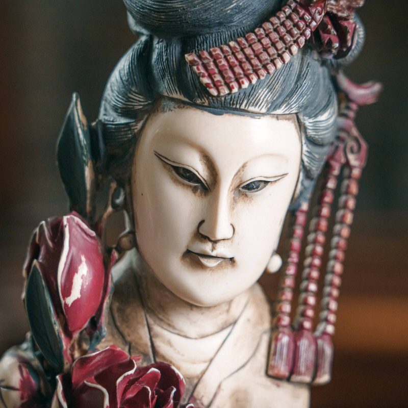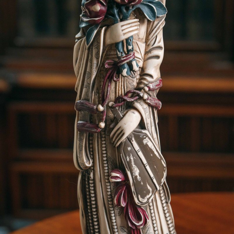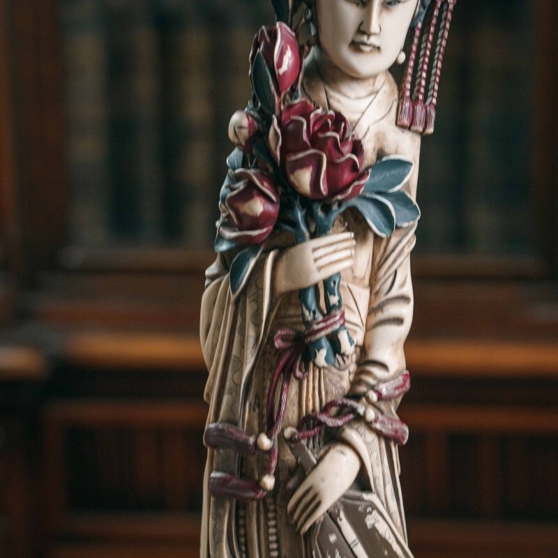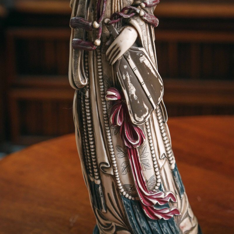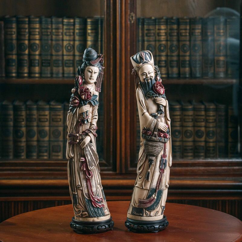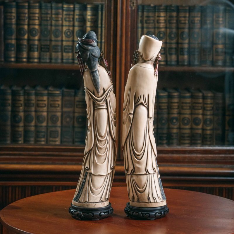 Каждая деталь вырезана вручную с филигранной точностью: от утончённых черт лица до изысканной росписи одежд. Фигуры поражают масштабом и монументальностью — более 5,5 кг резной слоновой кости в паре!