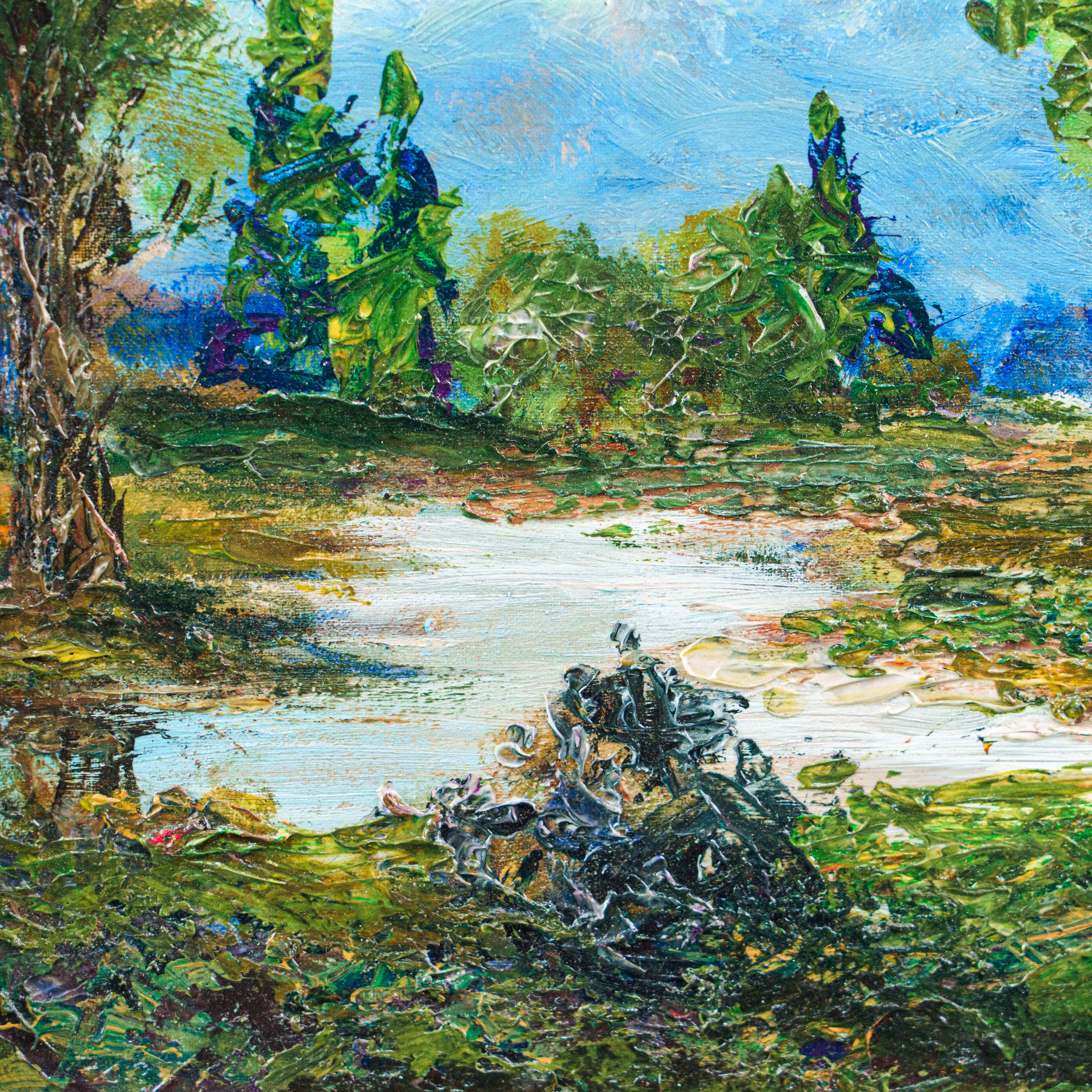 Колористическое решение построено на гармоничном сочетании сочной зелени, тёплых охристых тонов и мягких небесных оттенков. Благодаря этому работа излучает умиротворение, внутреннюю тишину и природную гармонию. Экспрессивный, живой мазок и тонкое чувство света подчёркивают индивидуальный стиль художника.