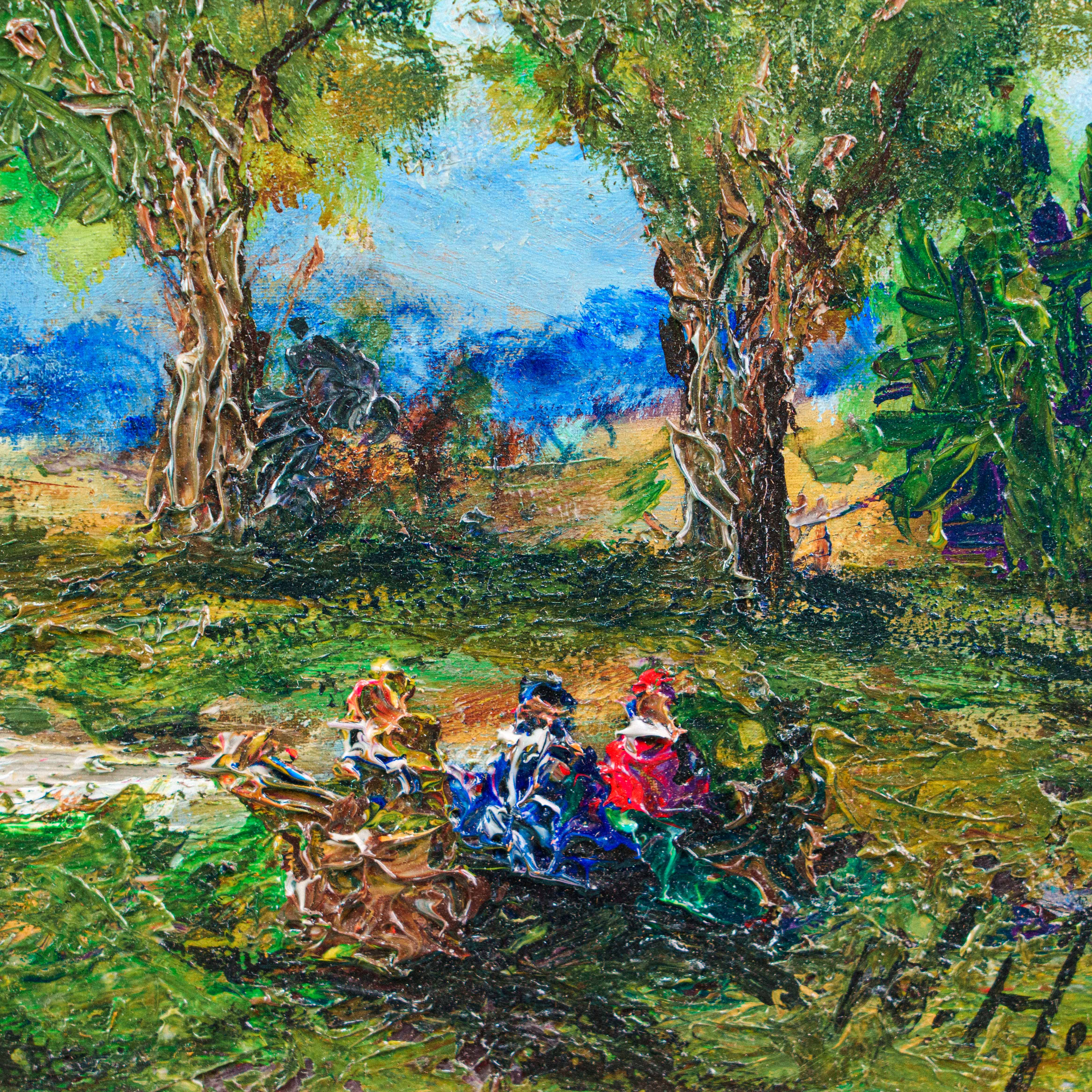 Фактурная манера письма создаёт эффект живого движения: листва словно колышется на ветру, трава переливается солнечными бликами, а прохладные голубые оттенки неба и гор усиливают ощущение прозрачности и свежести воздуха. В нижней части композиции художник вводит небольшие человеческие фигуры, придавая сцене масштаб, повествовательность и ощущение присутствия.