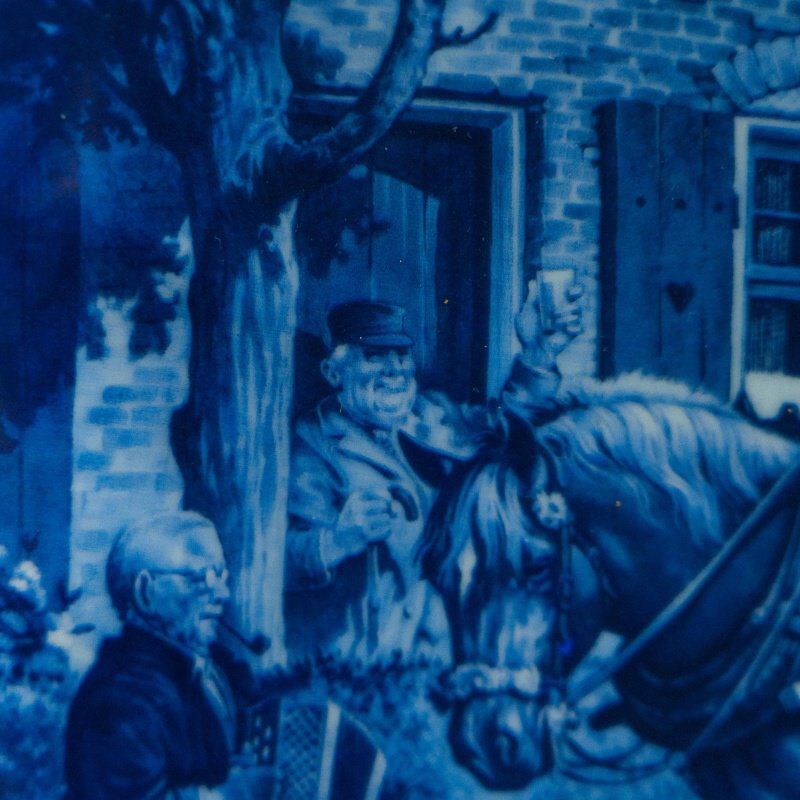 Центральная сцена изображает жанровый сюжет из повседневной жизни Нидерландов: конная упряжка у сельской таверны, фигуры людей в исторических костюмах, динамика и внимание к деталям создают живую, почти повествовательную композицию. Характерная сине-белая роспись подчёркивает глубину сюжета и отсылает к классическим образцам Delft XVII–XIX веков.