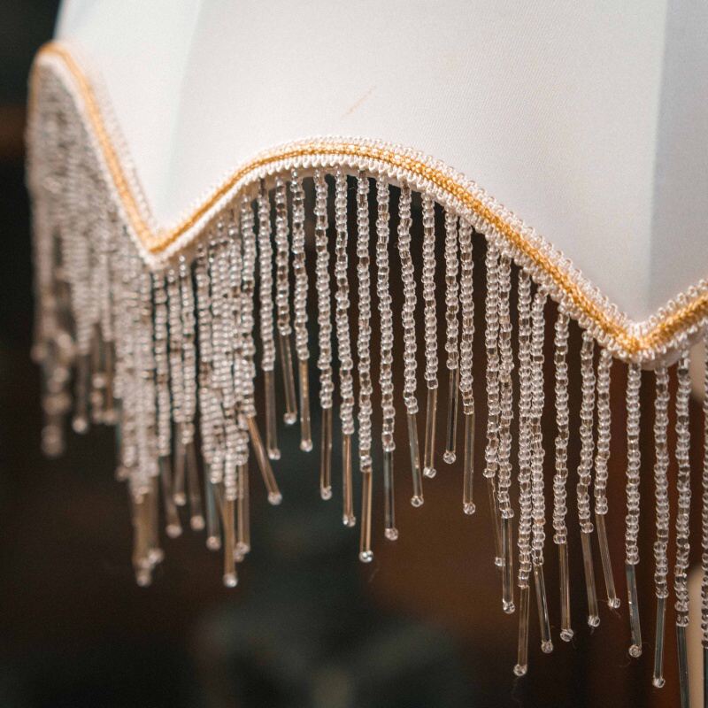 Классический купольный абажур выполнен из плотной ткани, дающей мягкий рассеянный свет. Нижний край украшен длинной бахромой из стеклянного бисера — этот декоративный приём был особенно популярен в интерьерах 1920–1950-х годов, придавая светильнику нотки элегантной театральности и утончённого шика.