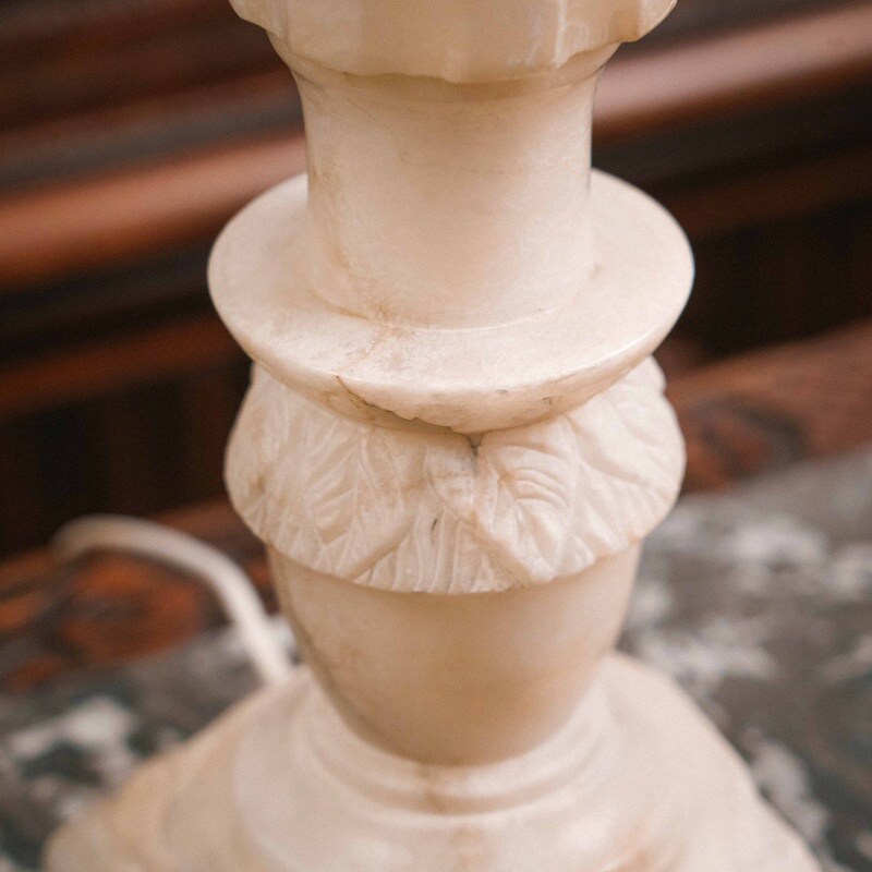 Роскошная настольная лампа, созданная в традициях изысканного европейского декоративного искусства середины XX века. Главным акцентом служит массивное резное основание из натурального мрамора: материал отличается мягким благородным оттенком и тщательно обработанной поверхностью. Резные элементы подчёркивают ручную работу мастера и придают лампе монументальность.