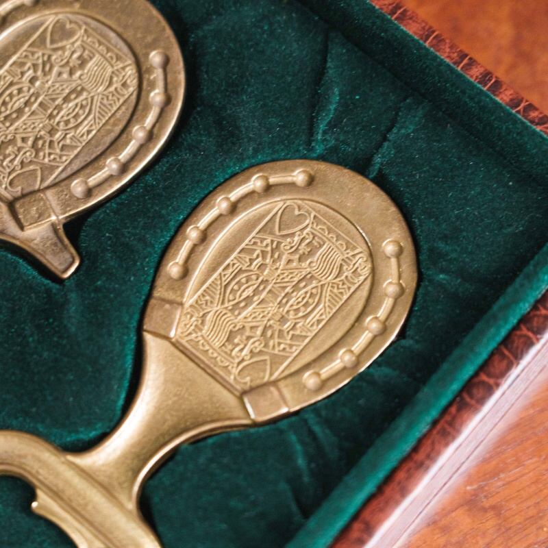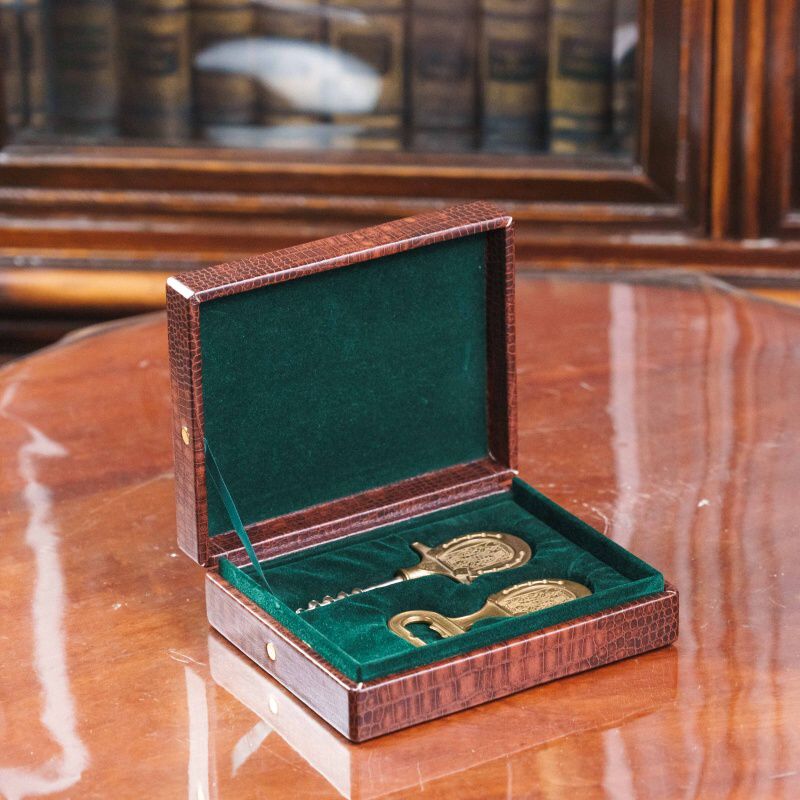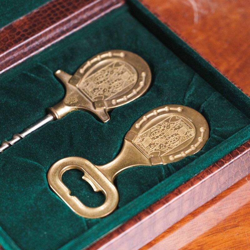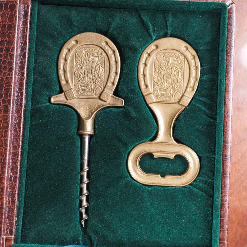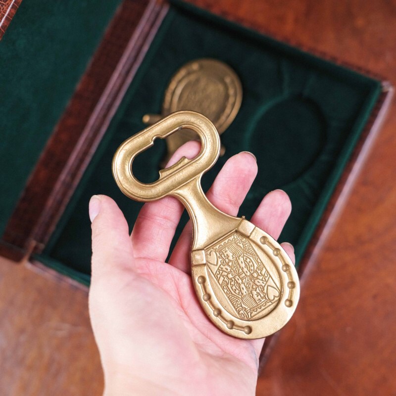 Винтажный набор из штопора и открывалки, выполненных из бронзы. Оба предмета украшены рельефным орнаментом в виде карт червонных королей, обрамлённым подковой — символом удачи. Лаконичный и в то же время изысканный дизайн отражает эстетику середины XX века, когда функциональные предметы нередко становились элементами интерьера. Тёплый золотистый блеск бронзы придаёт набору особое благородство, делая его не только утилитарным аксессуаром, но и стильным подарком.