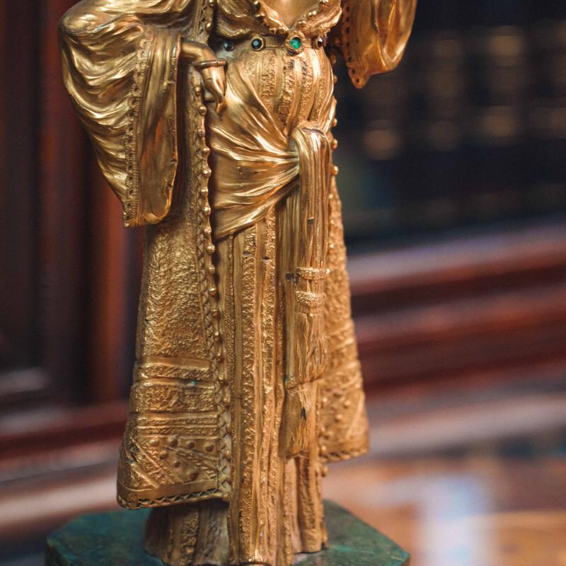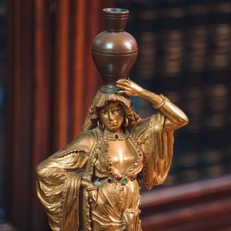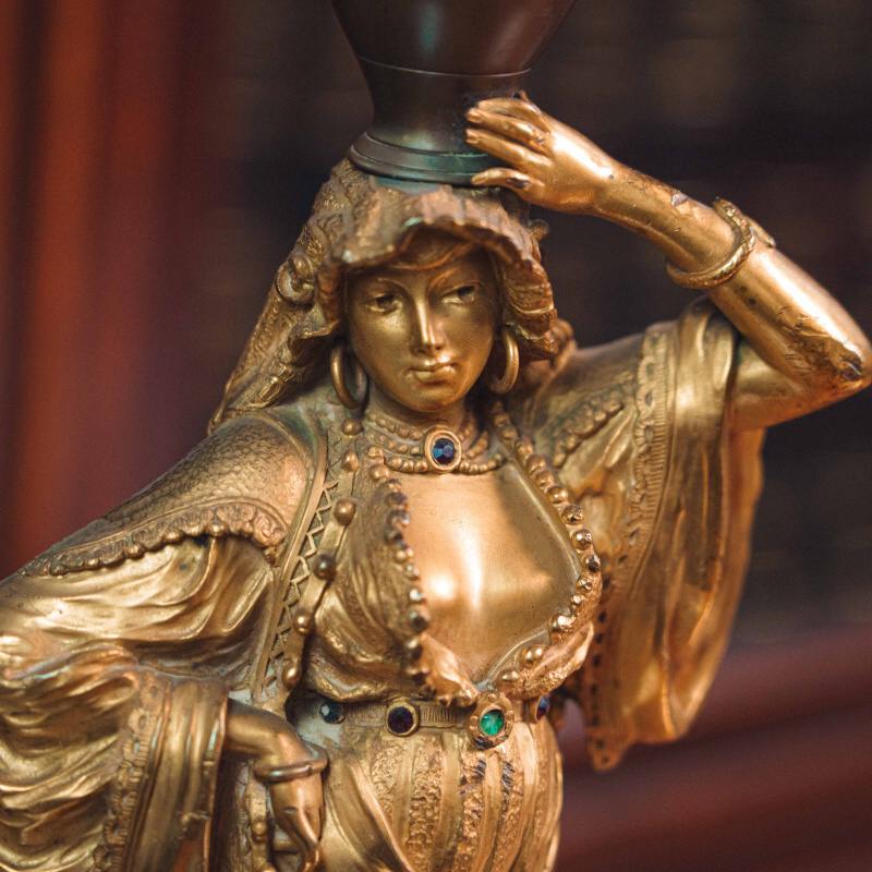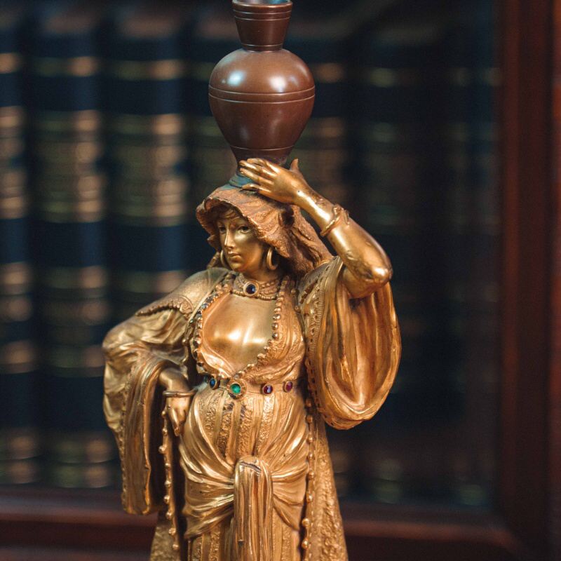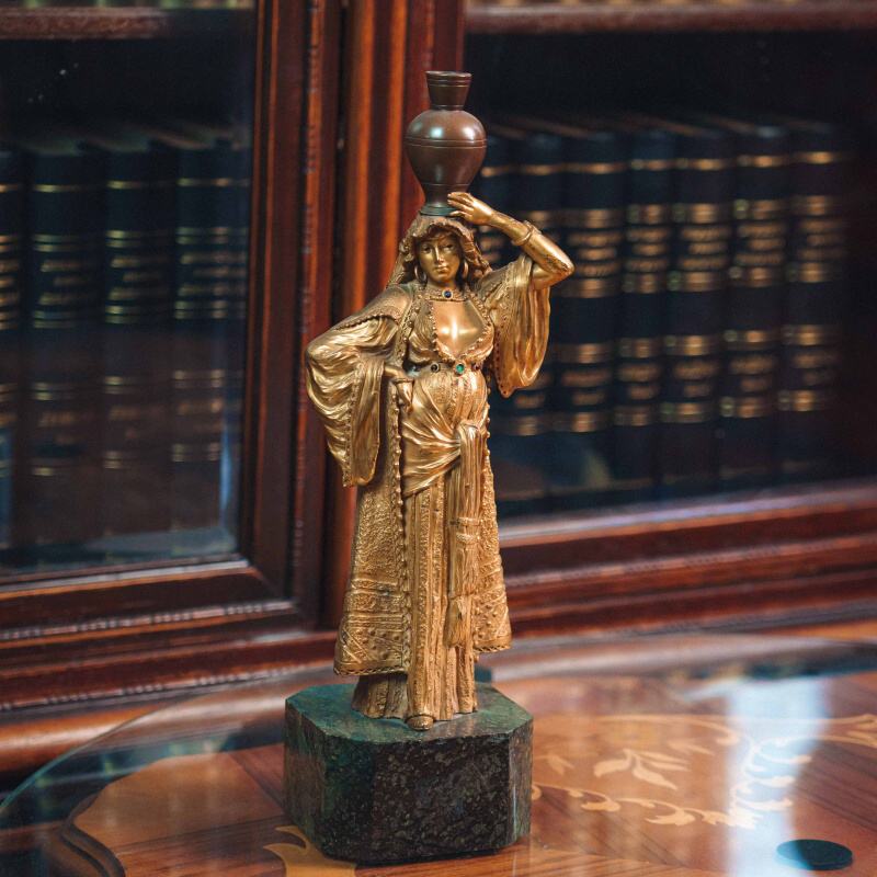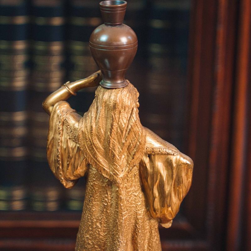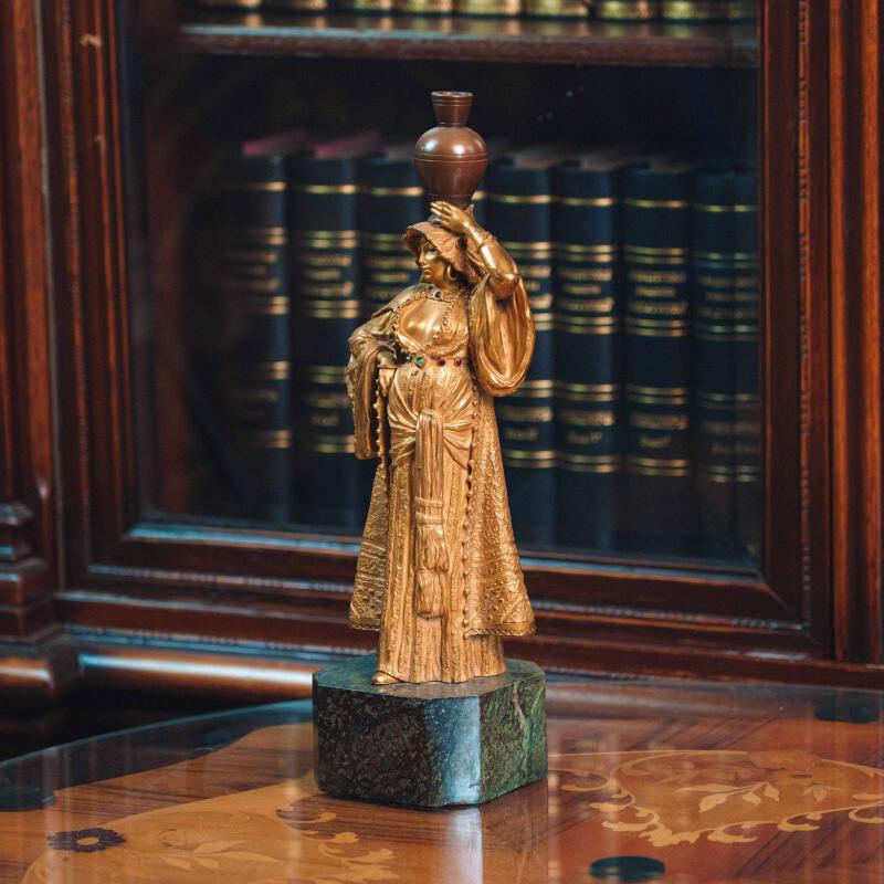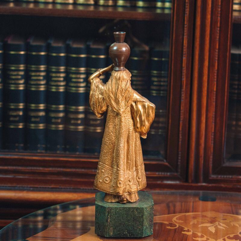 Изящная кабинетная скульптура в стиле Ориентализм, изображающая восточную девушку, несущую кувшин на голове. Образ девушки наполнен пластикой повседневной грации и внутренней гармонии. Девушка одета в богато драпированное одеяние с характерными восточными мотивами. Скульптор с особым вниманием передает фактуру тканей, орнаментальные детали и украшения — ожерелья, пояс с цветными вставками, серьги. Позолоченная поверхность подчеркивает мягкость форм и игру света, придавая работе выразительность и декоративную цельность.